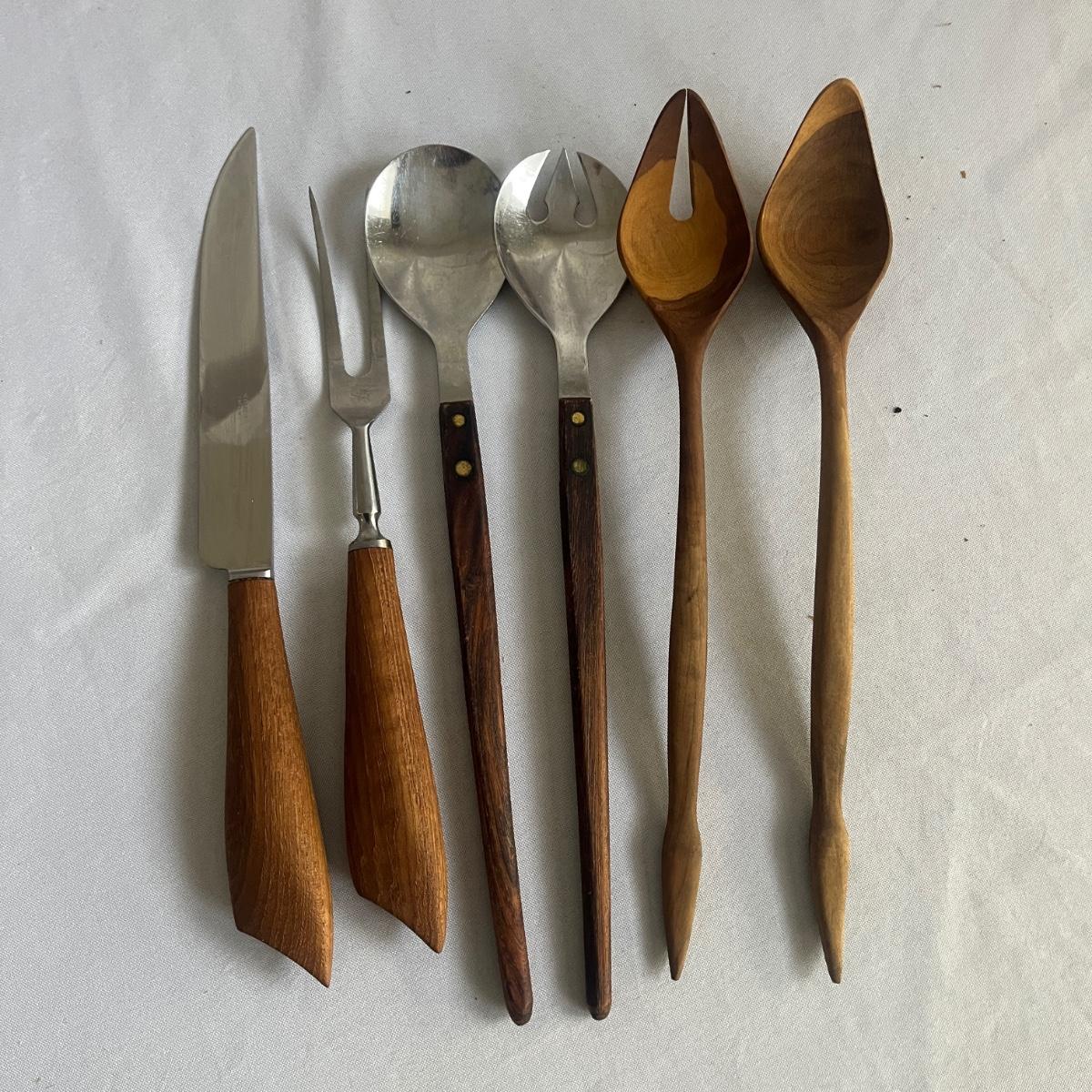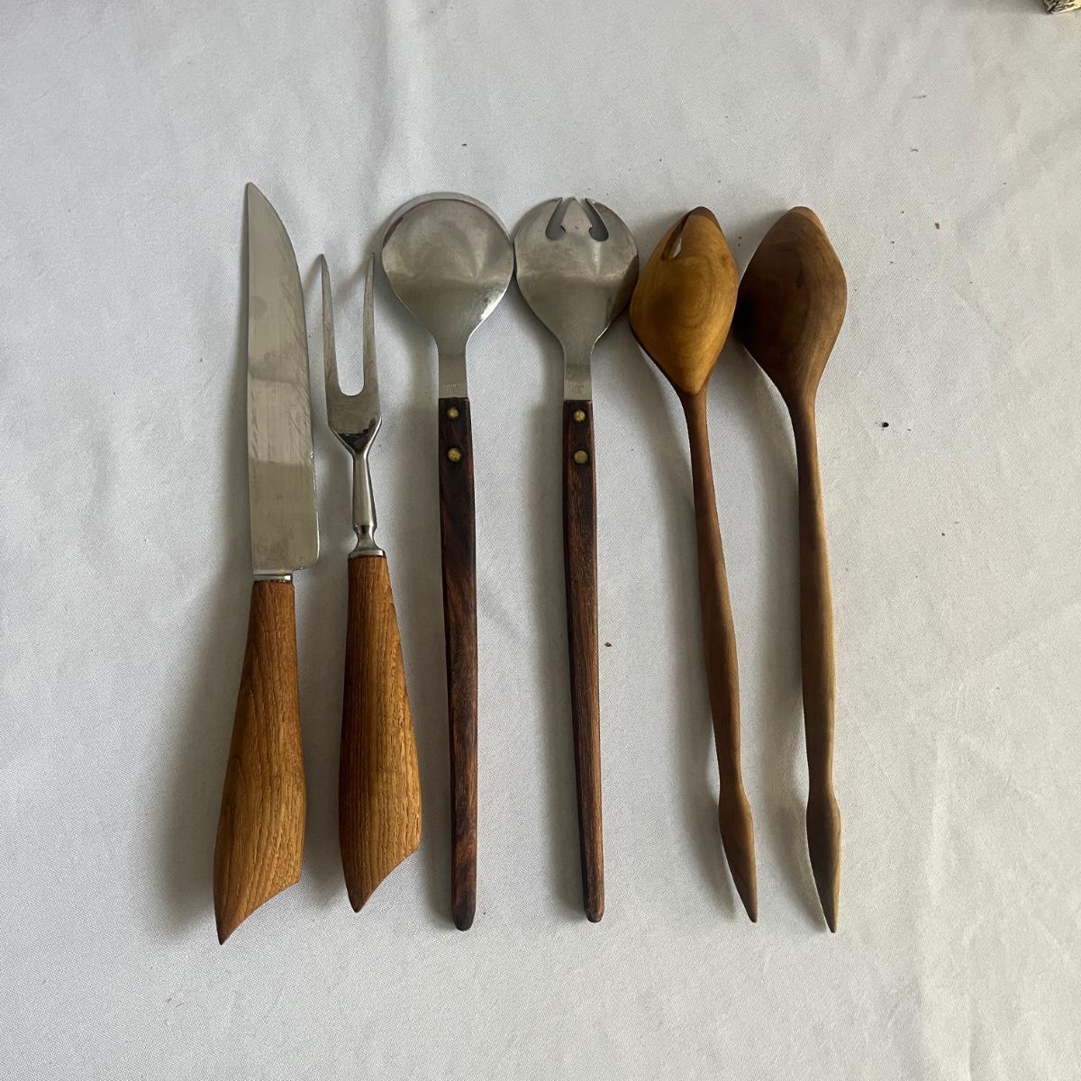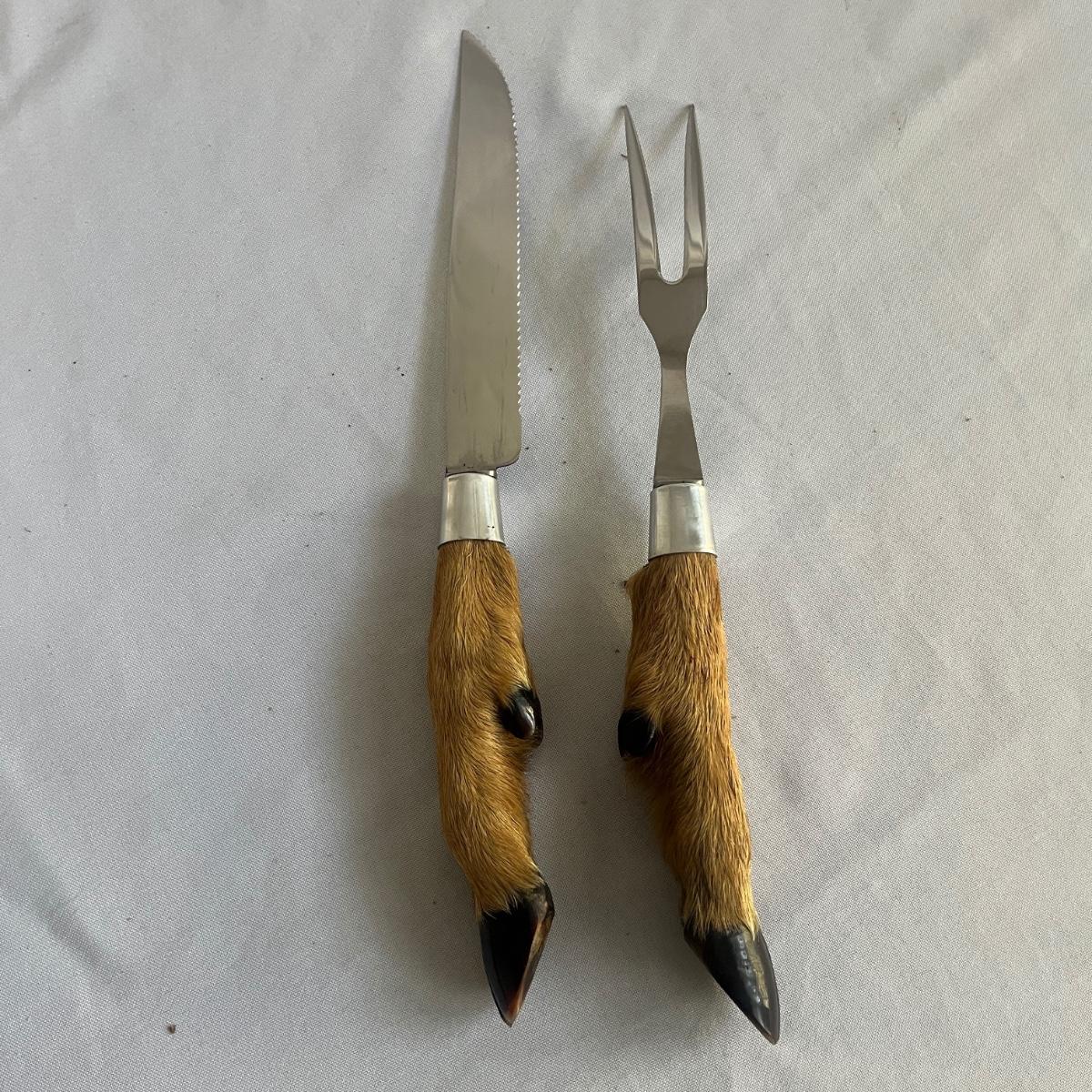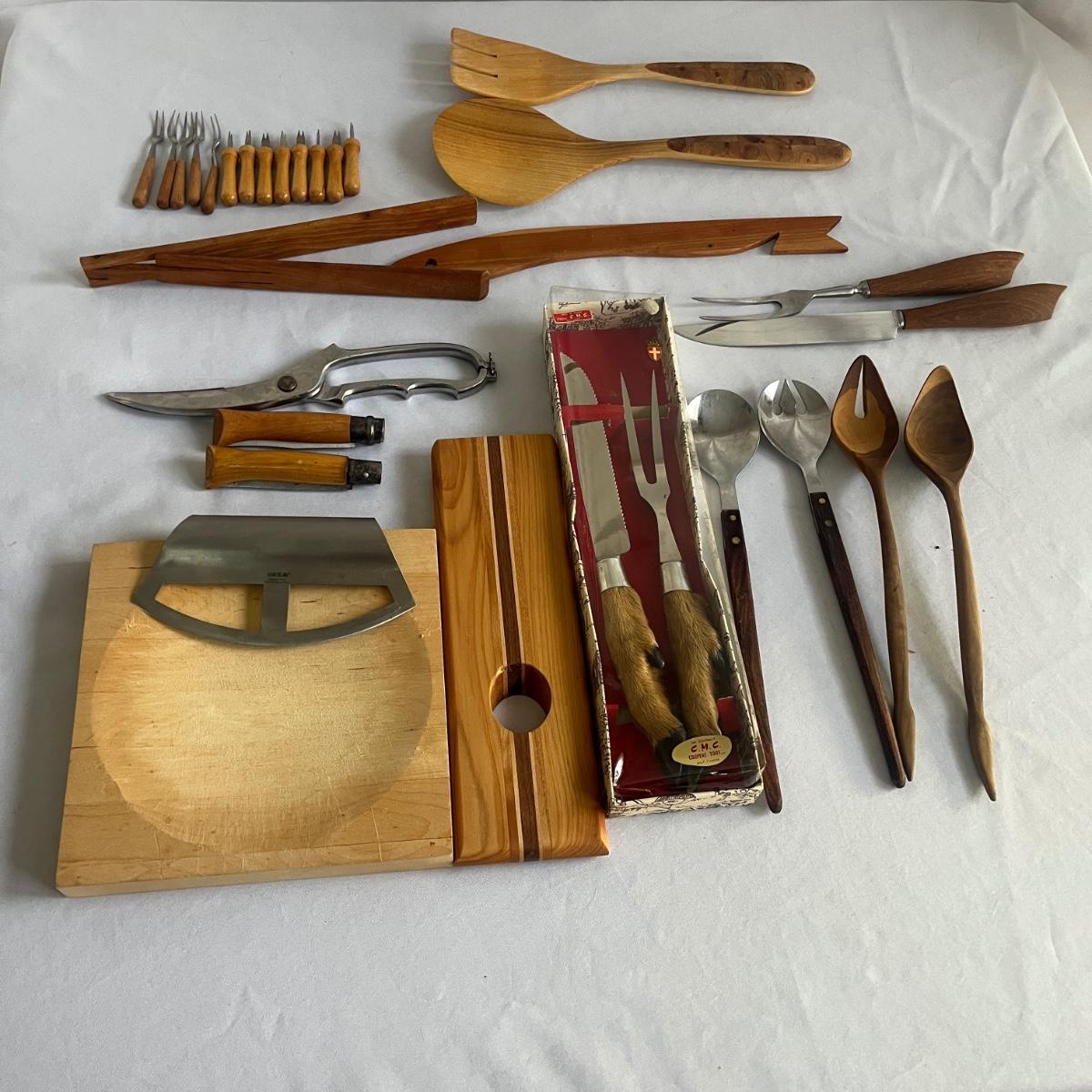 Lot includes two Opinel folding knives, wooden and metal serving spoons, corn cob holders, scissors, serving knife and fork made with animal feet for handles, and more. Serving knife with animal feet measures 12” long.