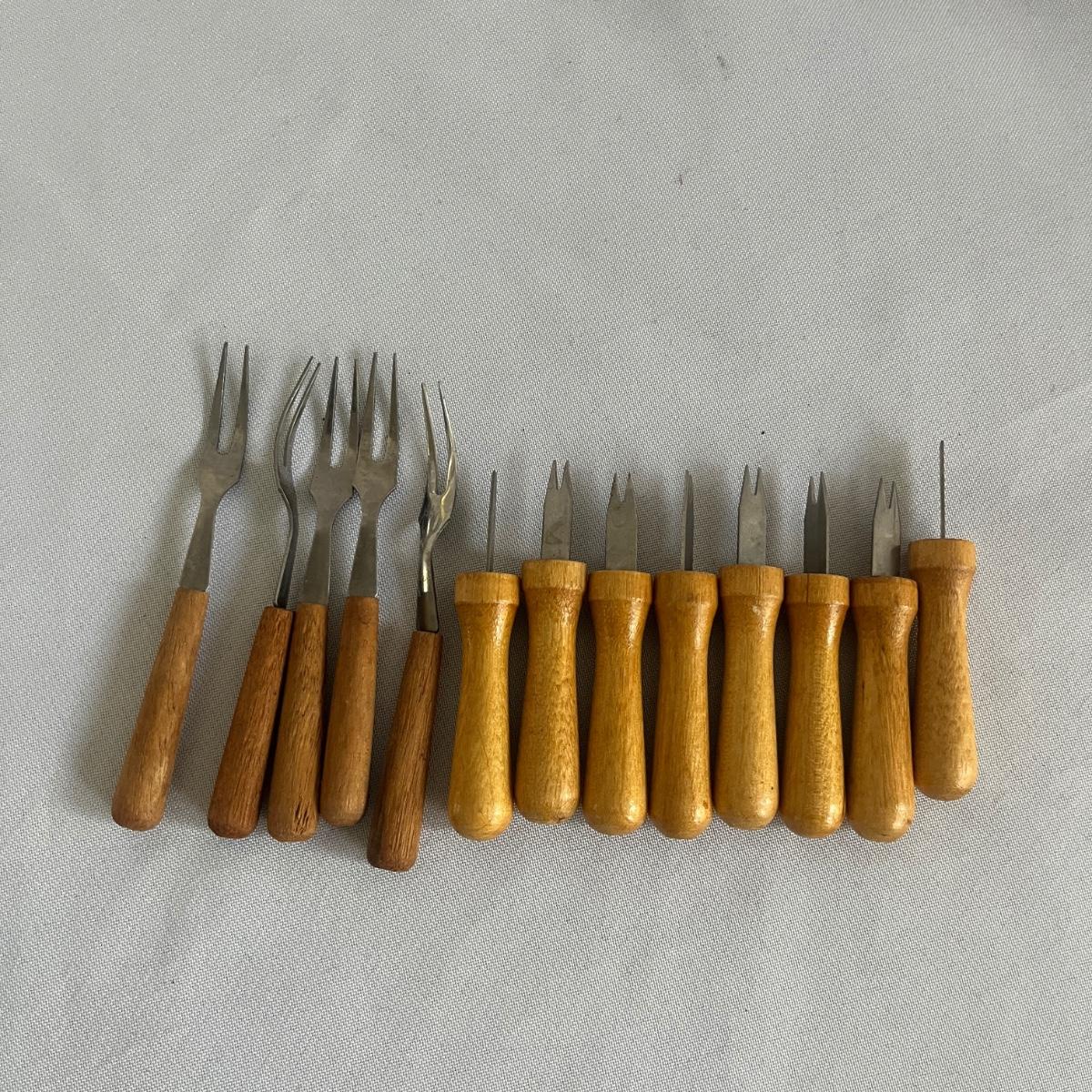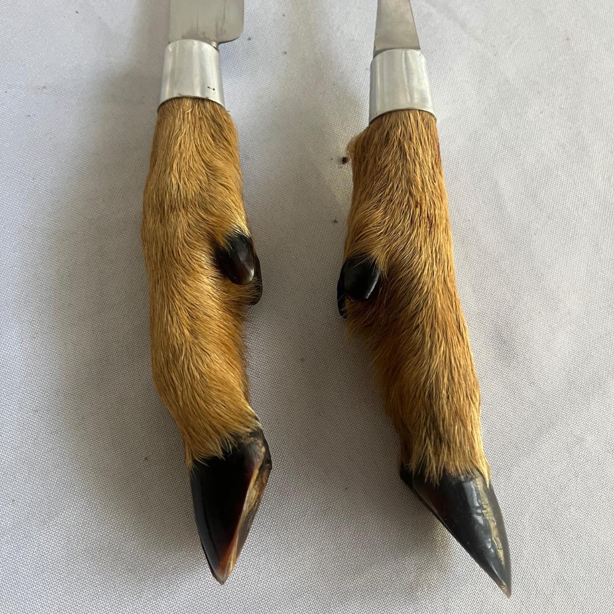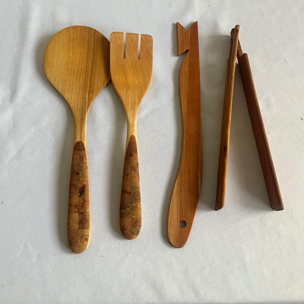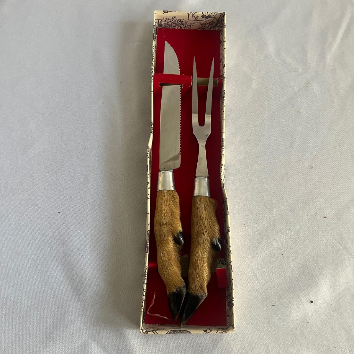 Lot includes two Opinel folding knives, wooden and metal serving spoons, corn cob holders, scissors, serving knife and fork made with animal feet for handles, and more. Serving knife with animal feet measures 12” long.