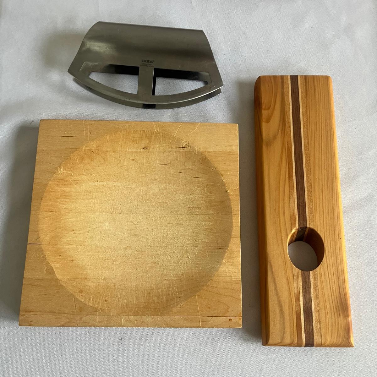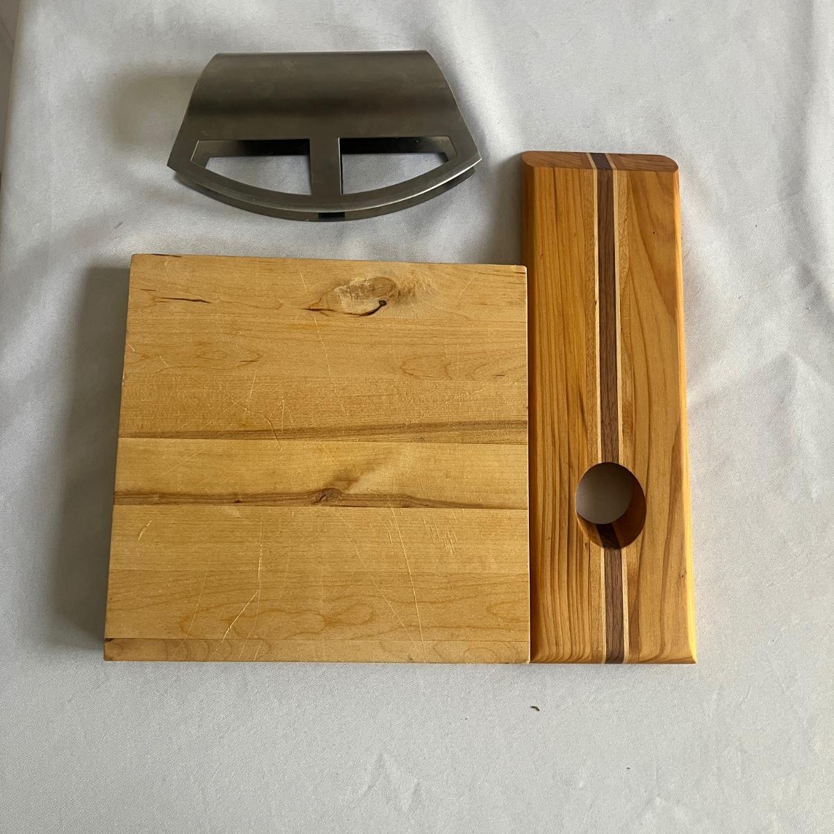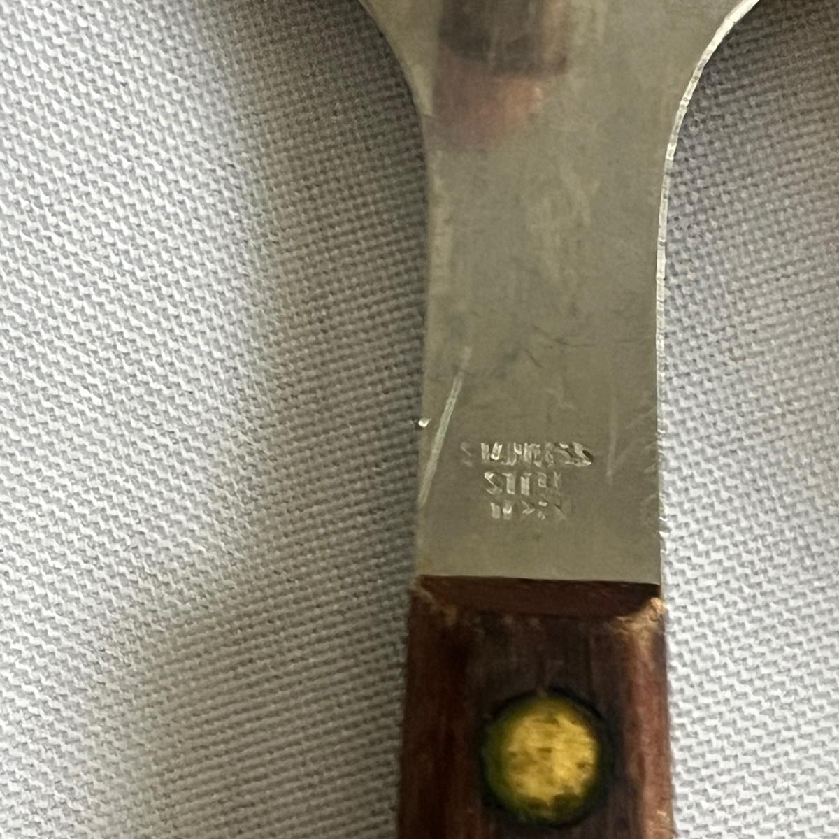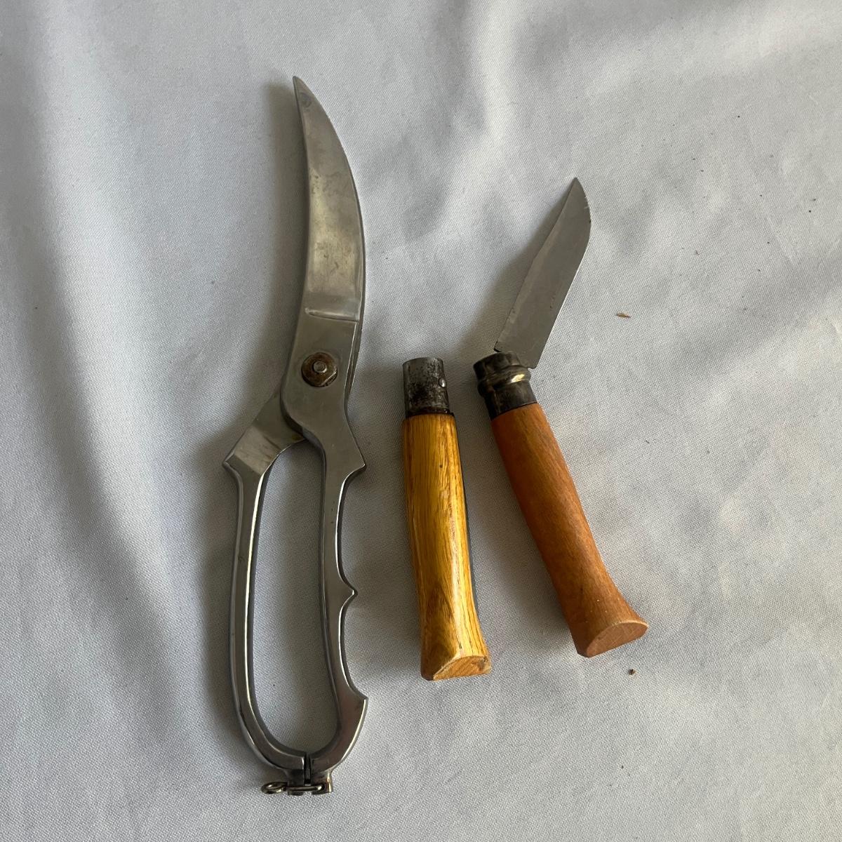 Lot includes two Opinel folding knives, wooden and metal serving spoons, corn cob holders, scissors, serving knife and fork made with animal feet for handles, and more. Serving knife with animal feet measures 12” long.
