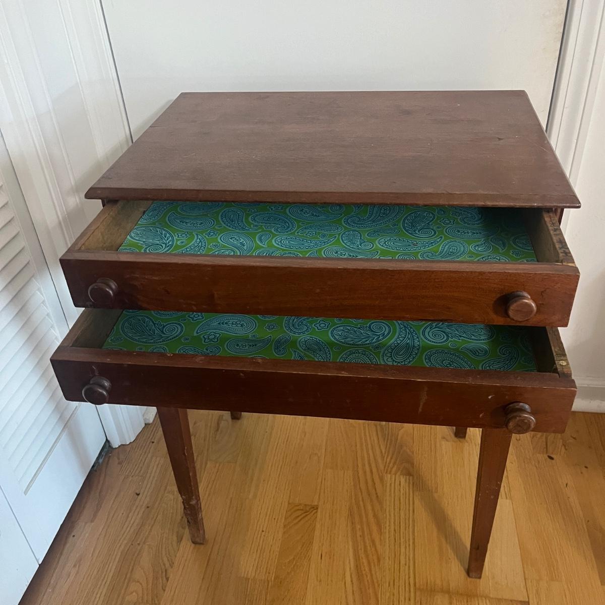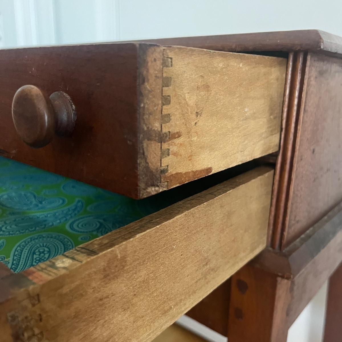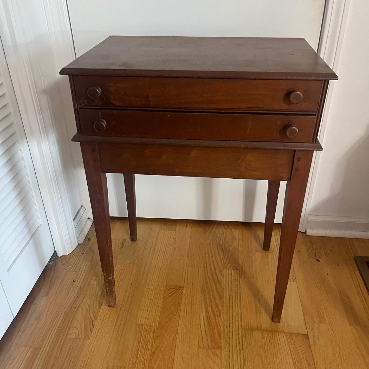 Lot includes a two dovetailed drawer rectangular side table with wooden knobs. Table measures 22” x 15” x 29”H. Top drawer is loose at the joints, but it appears to just need to be glued together.