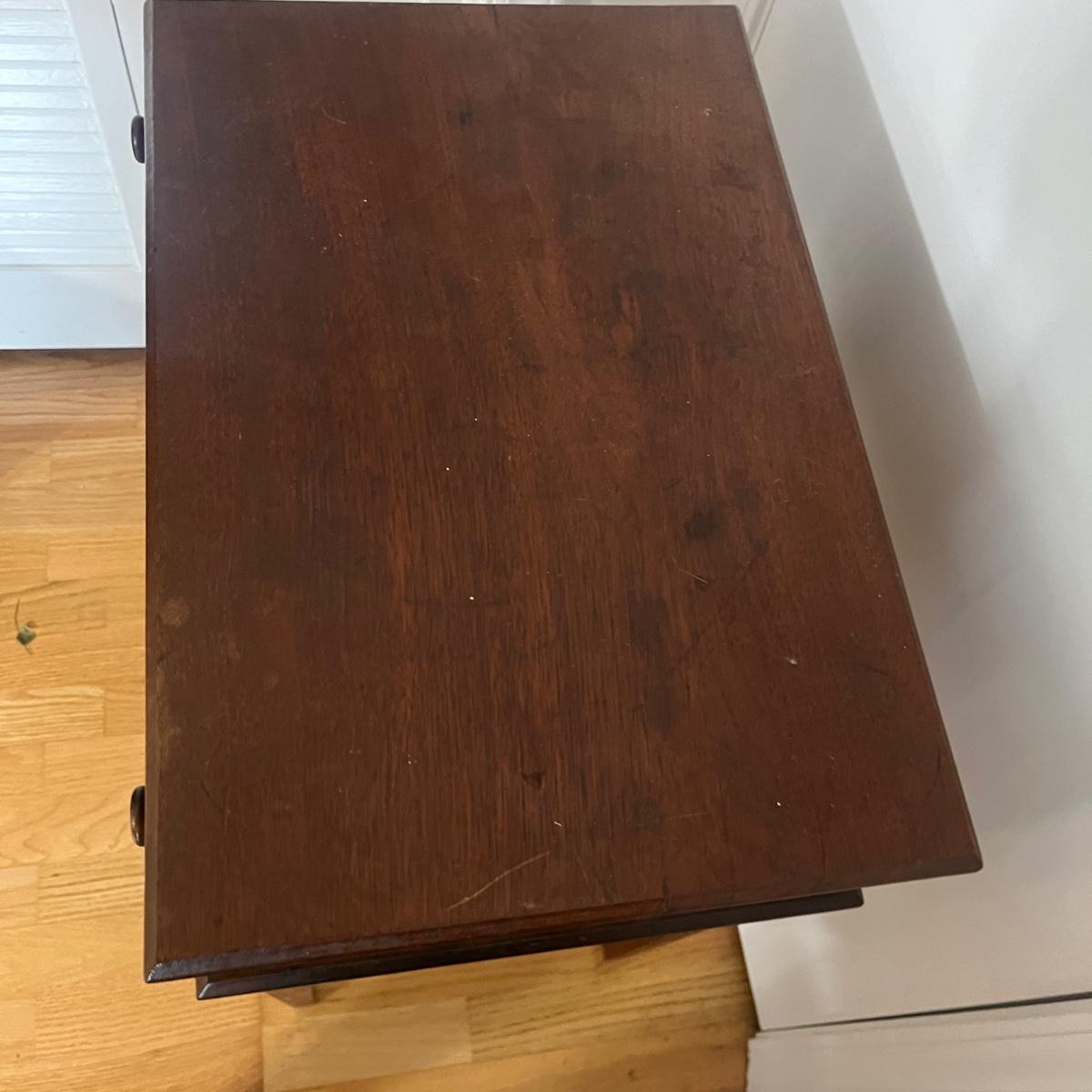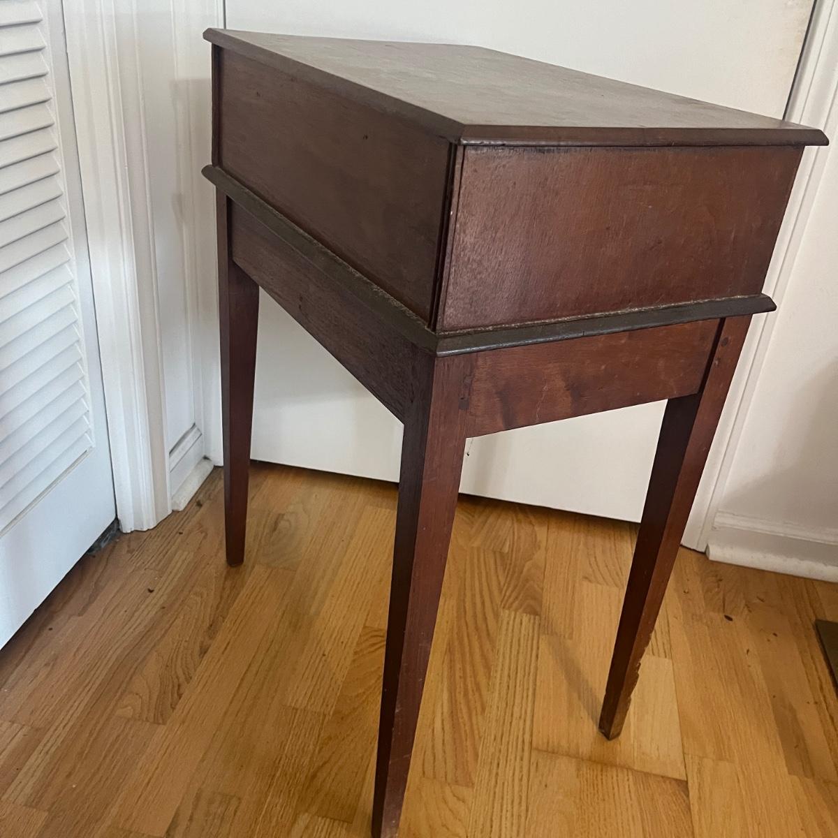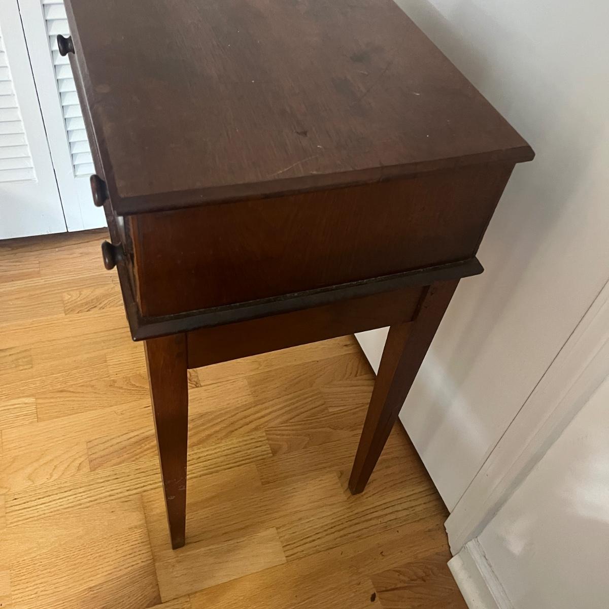 Lot includes a two dovetailed drawer rectangular side table with wooden knobs. Table measures 22” x 15” x 29”H. Top drawer is loose at the joints, but it appears to just need to be glued together.