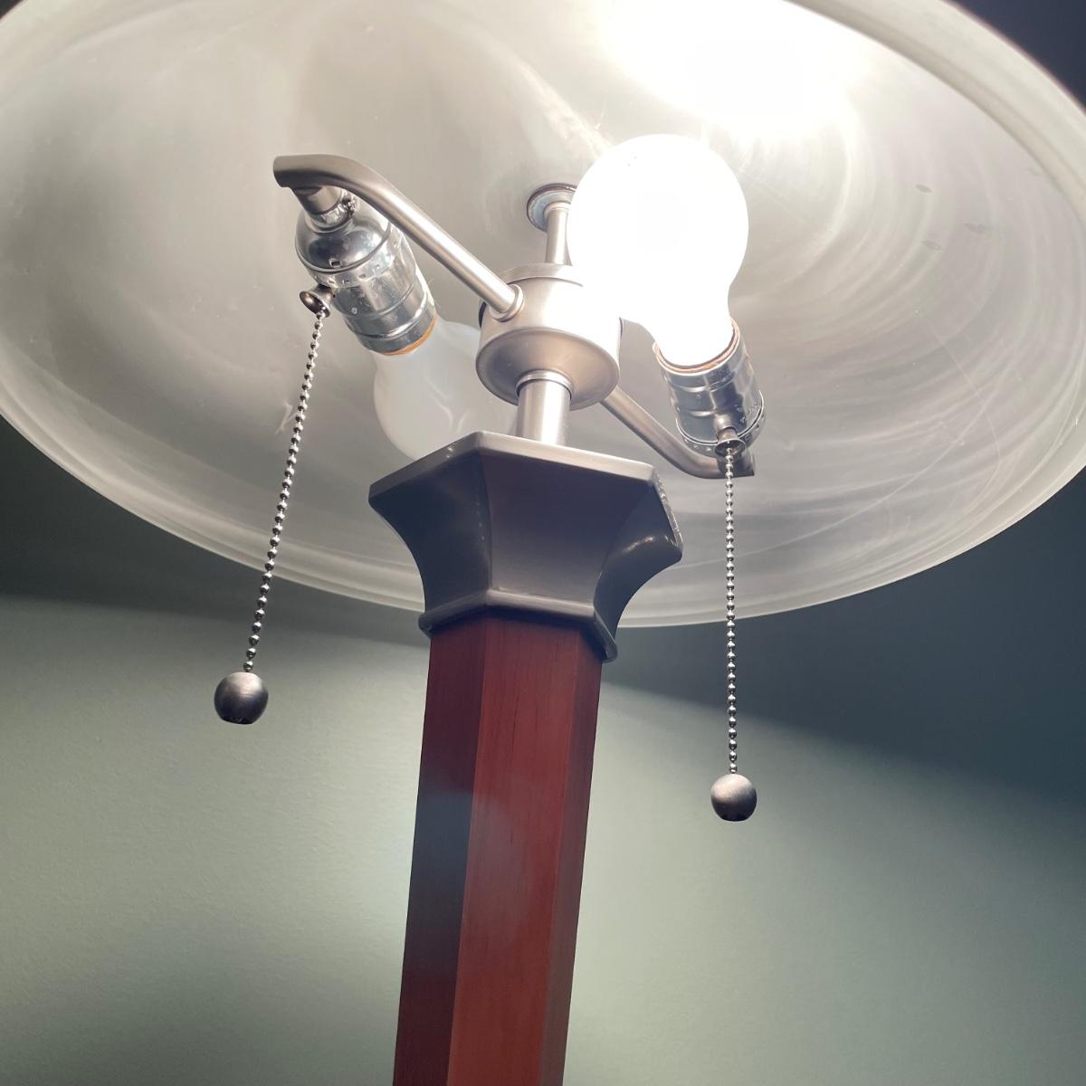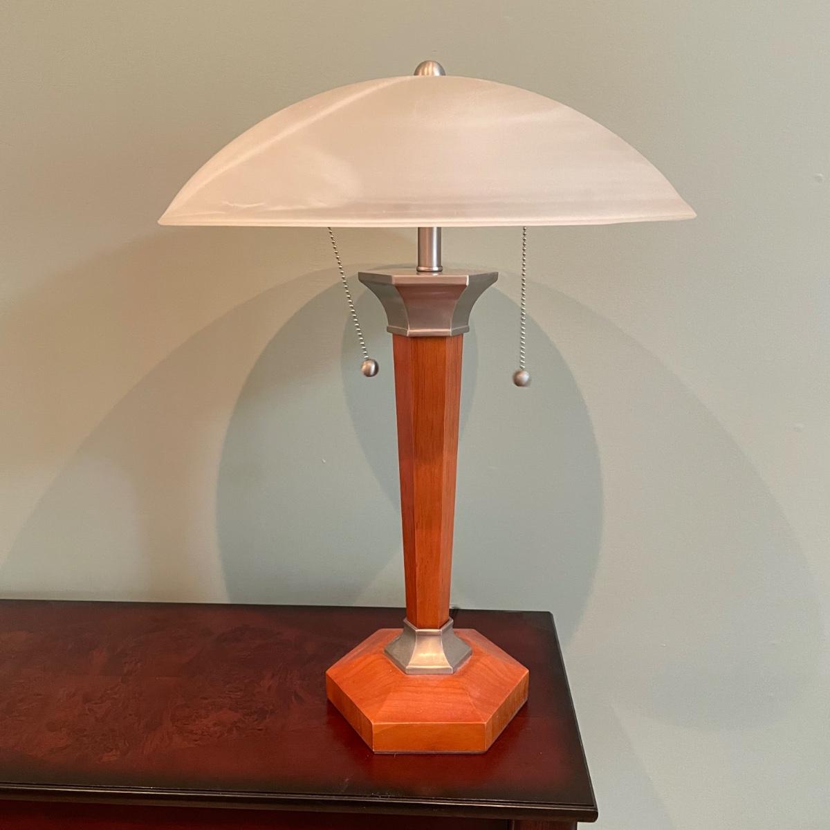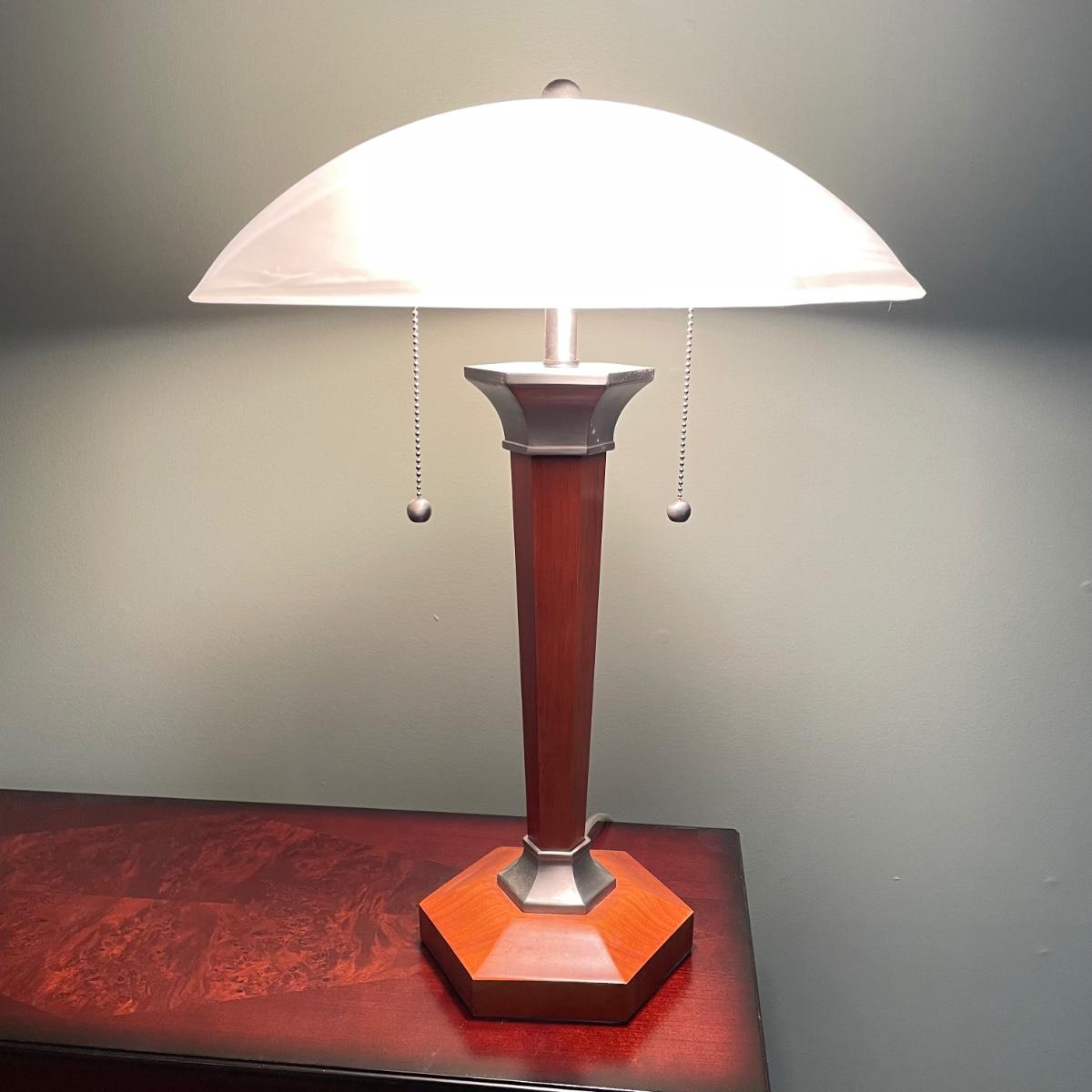 A mission style inspired lamp. Lamp has a heavy frosted shade with a wooden body and polished metal accents. Lamp has two bulbs that operate independently on pull switches. Both sockets turned on when prompted. Shade measures 15”D, lamp is approximately 22”H. See images. Local pick up only.