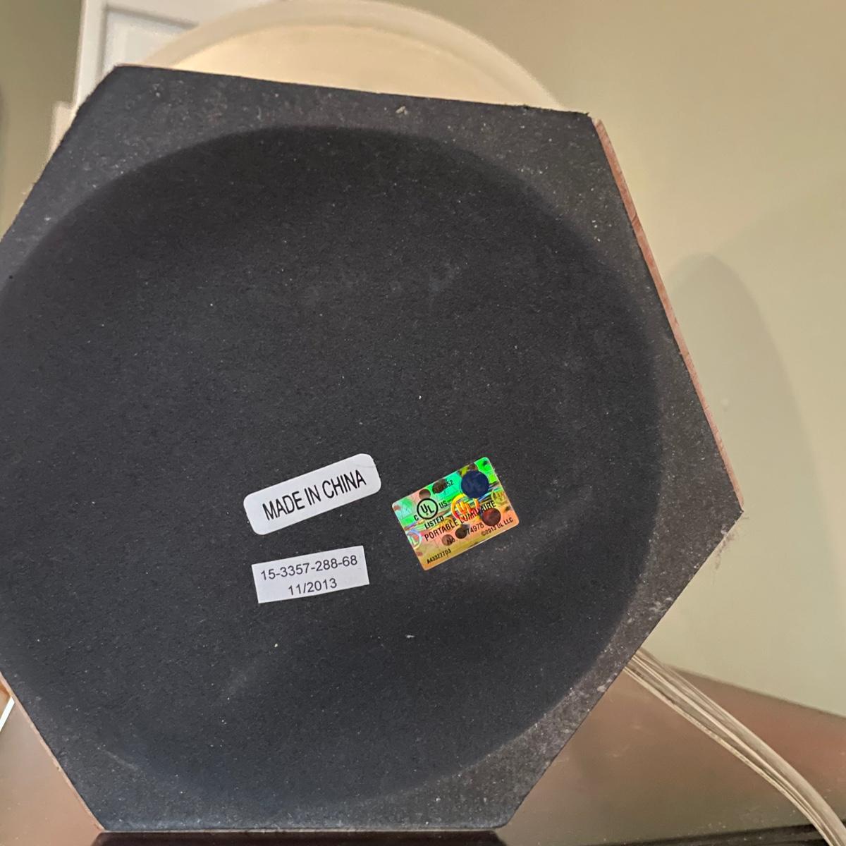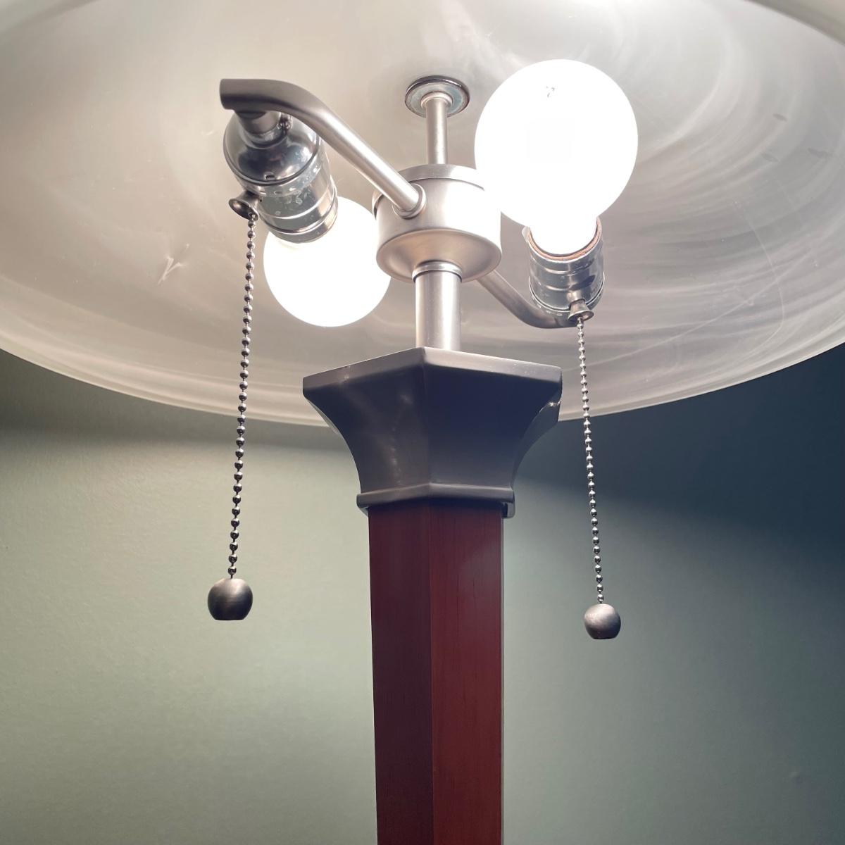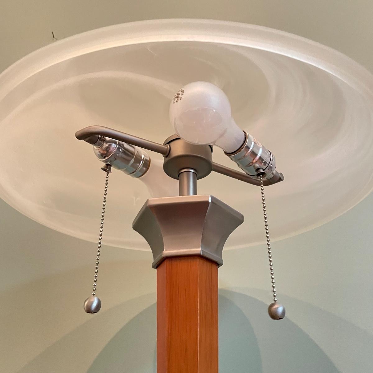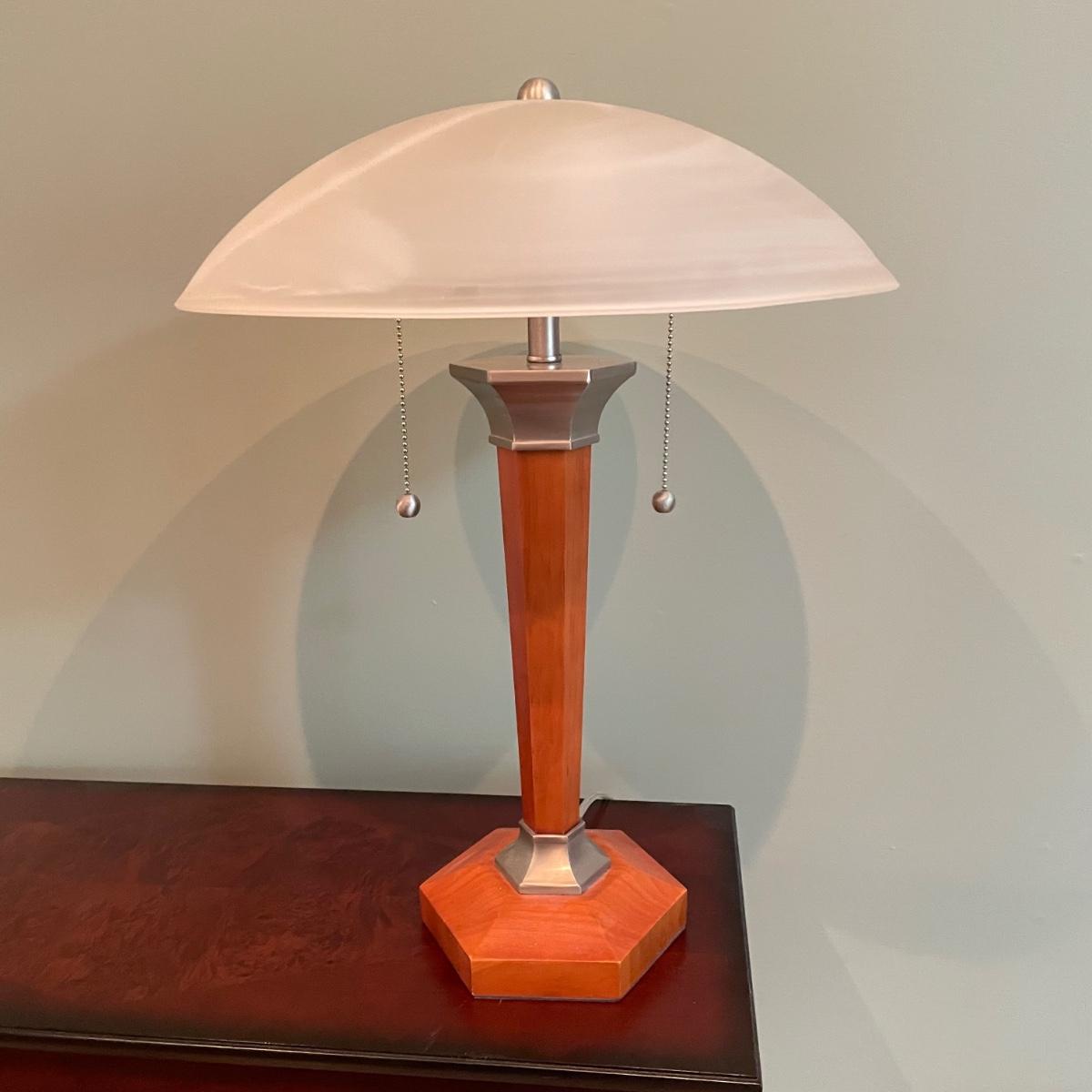 A mission style inspired lamp. Lamp has a heavy frosted shade with a wooden body and polished metal accents. Lamp has two bulbs that operate independently on pull switches. Both sockets turned on when prompted. Shade measures 15”D, lamp is approximately 22”H. See images. Local pick up only.