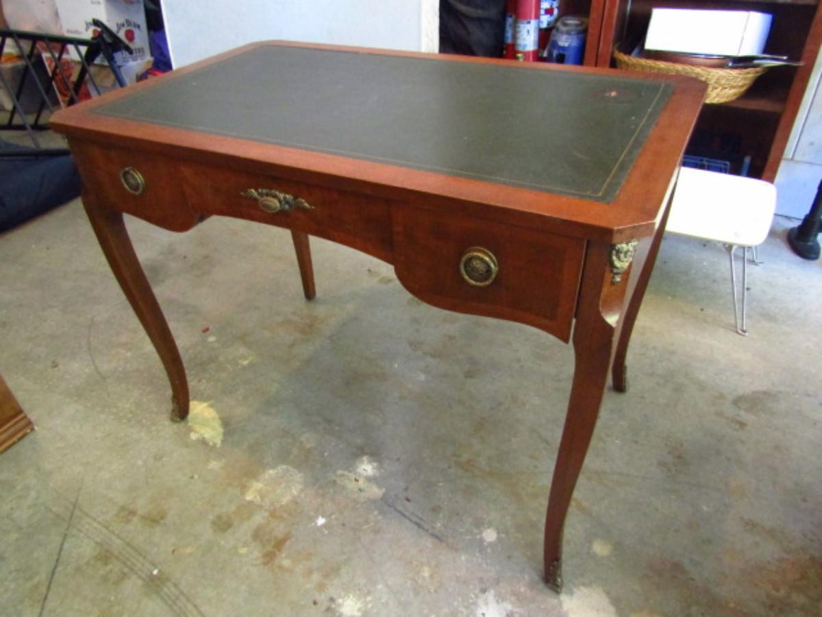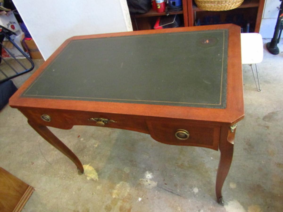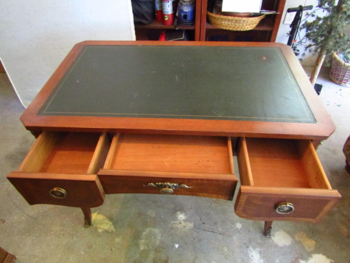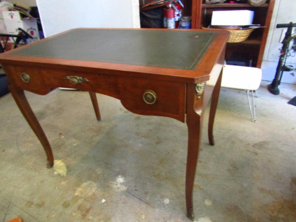 Wooden Leather Topped Writing Desk by Henredon and Ladder Back Chair with Rush Seat. Please see all pictures- top has damage in one corner.