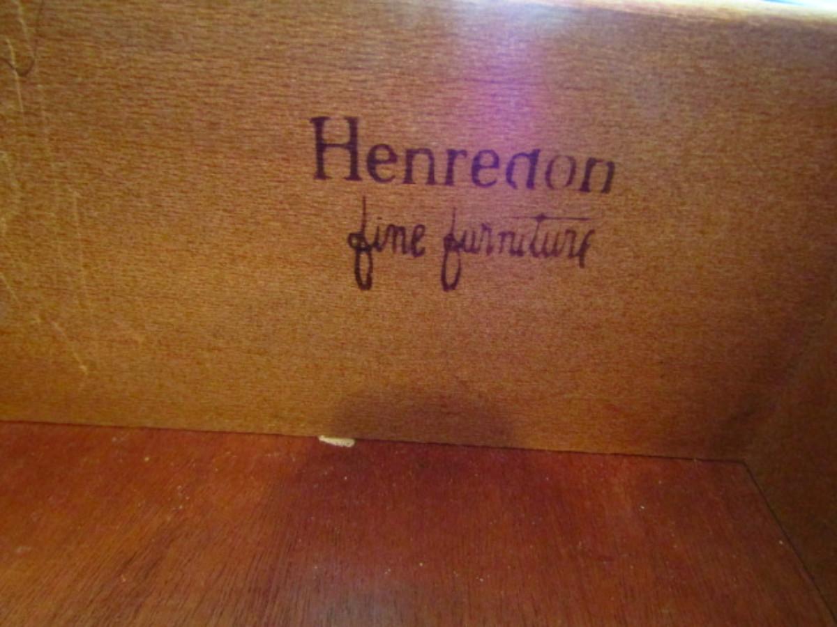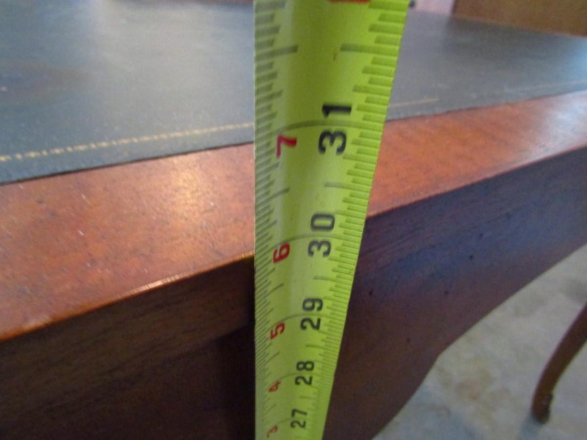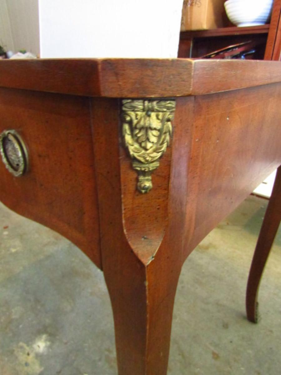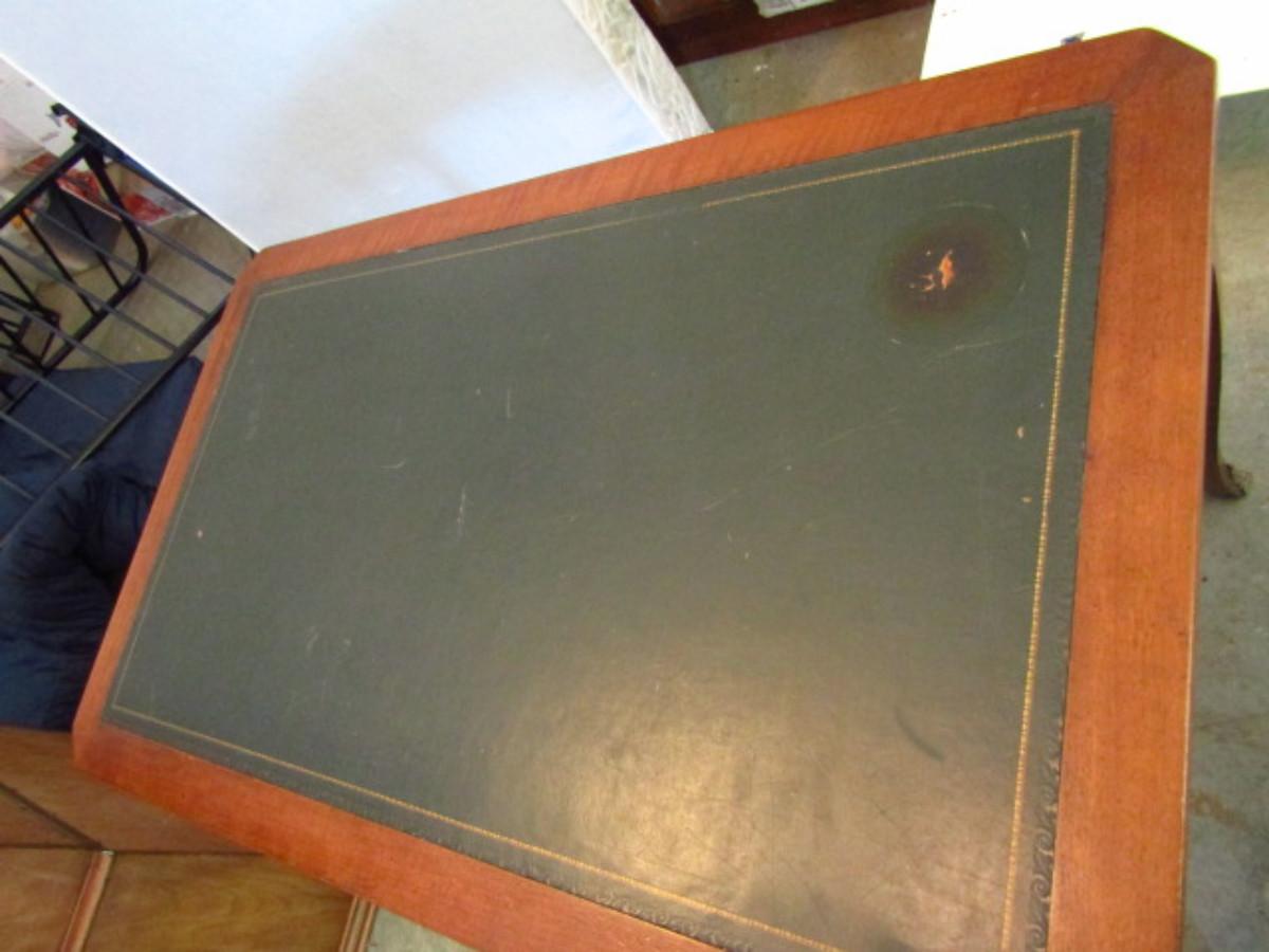 Wooden Leather Topped Writing Desk by Henredon and Ladder Back Chair with Rush Seat. Please see all pictures- top has damage in one corner.