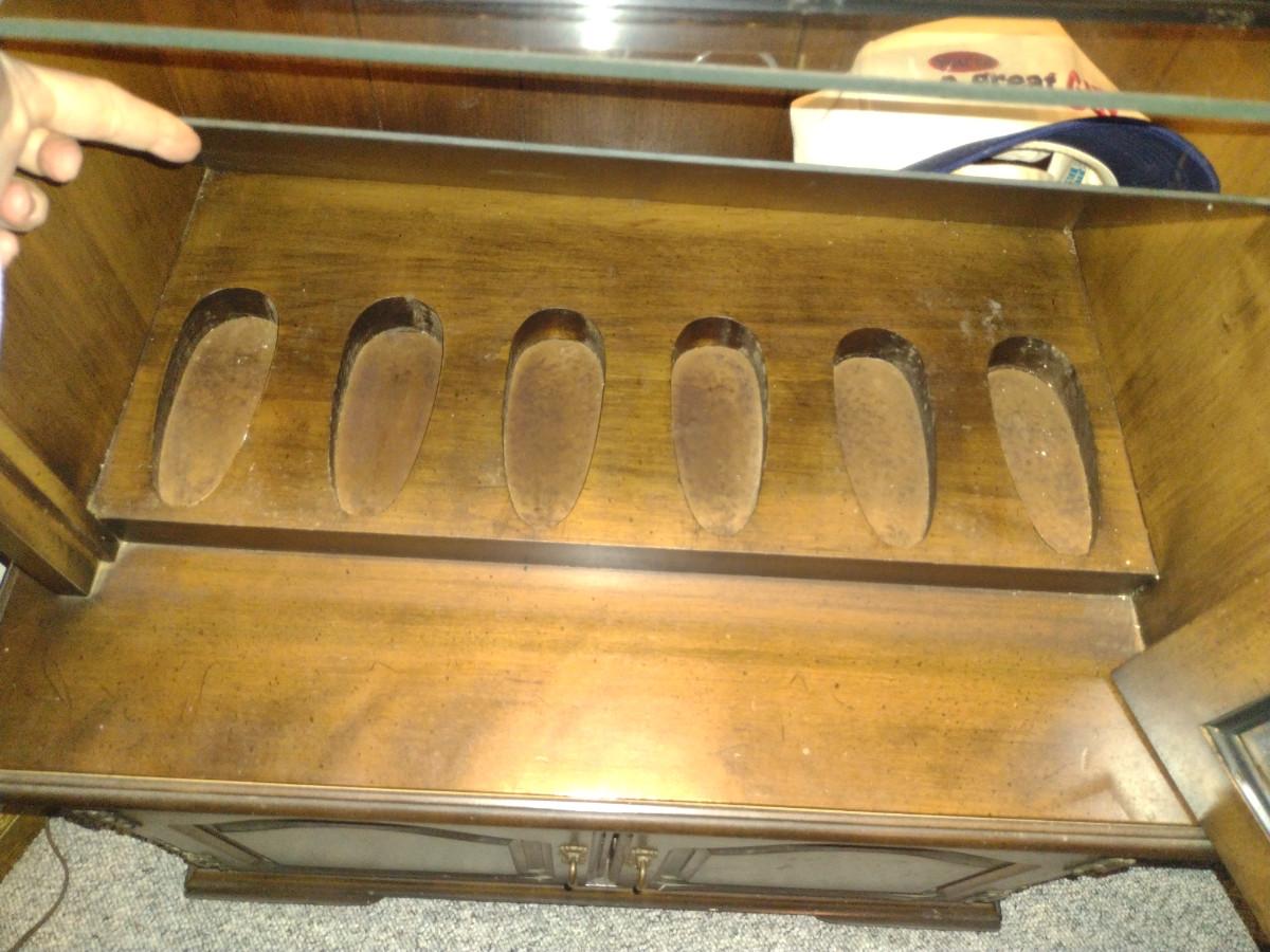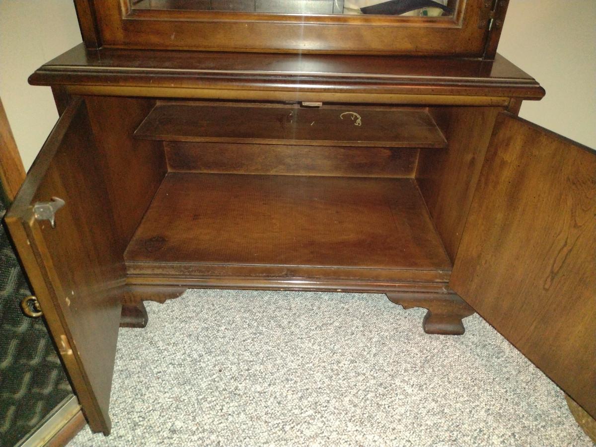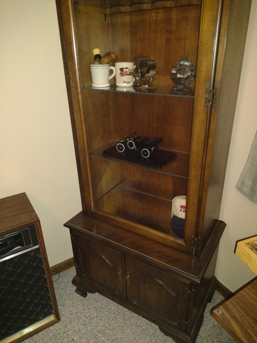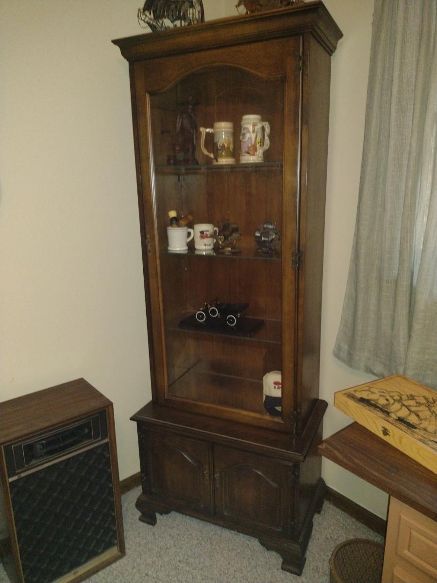 Wooden Lighted Curio/Sportsman's Gun Cabinet with Storage- Approx 28" x 16" x 74" Tall. Item has 3 glass shelves for curio use. If shelves are removed, item is grooved to fit 6 long guns.