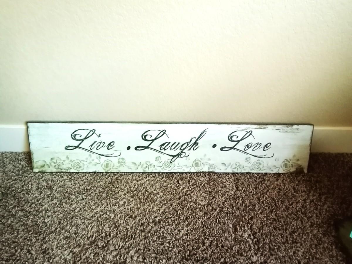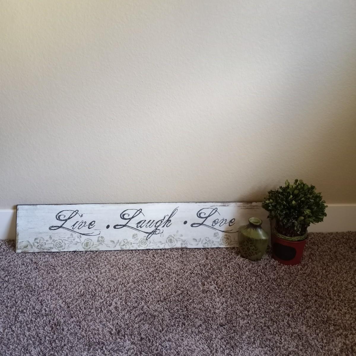 LIVE LAUGH LOVE SIGN 36X7- CERAMIC BOTTLE AND SMALL FAUX PLANT