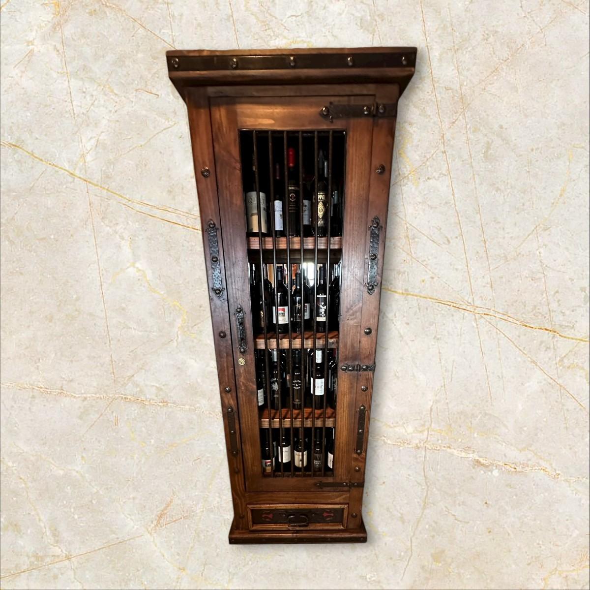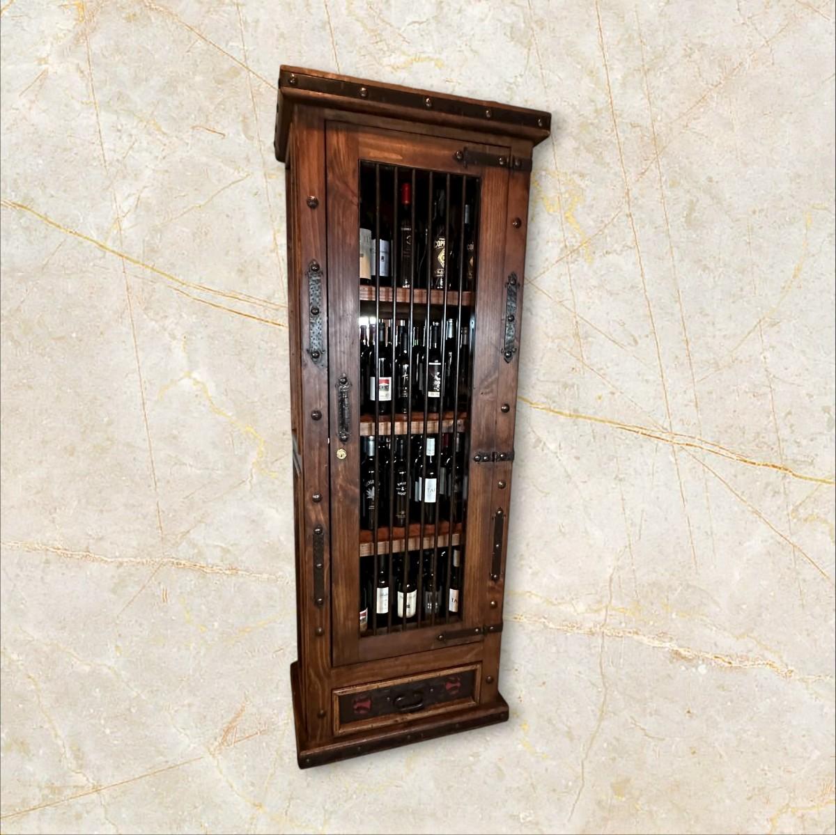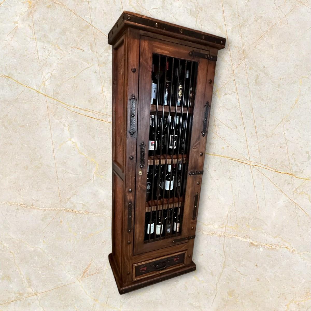 Rustic Wooden Locking Wine Cabinet (Contents Not Included) featuring a metal bar door and a bottom drawer.