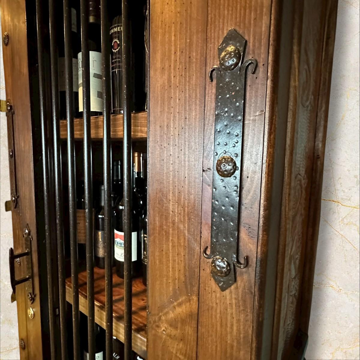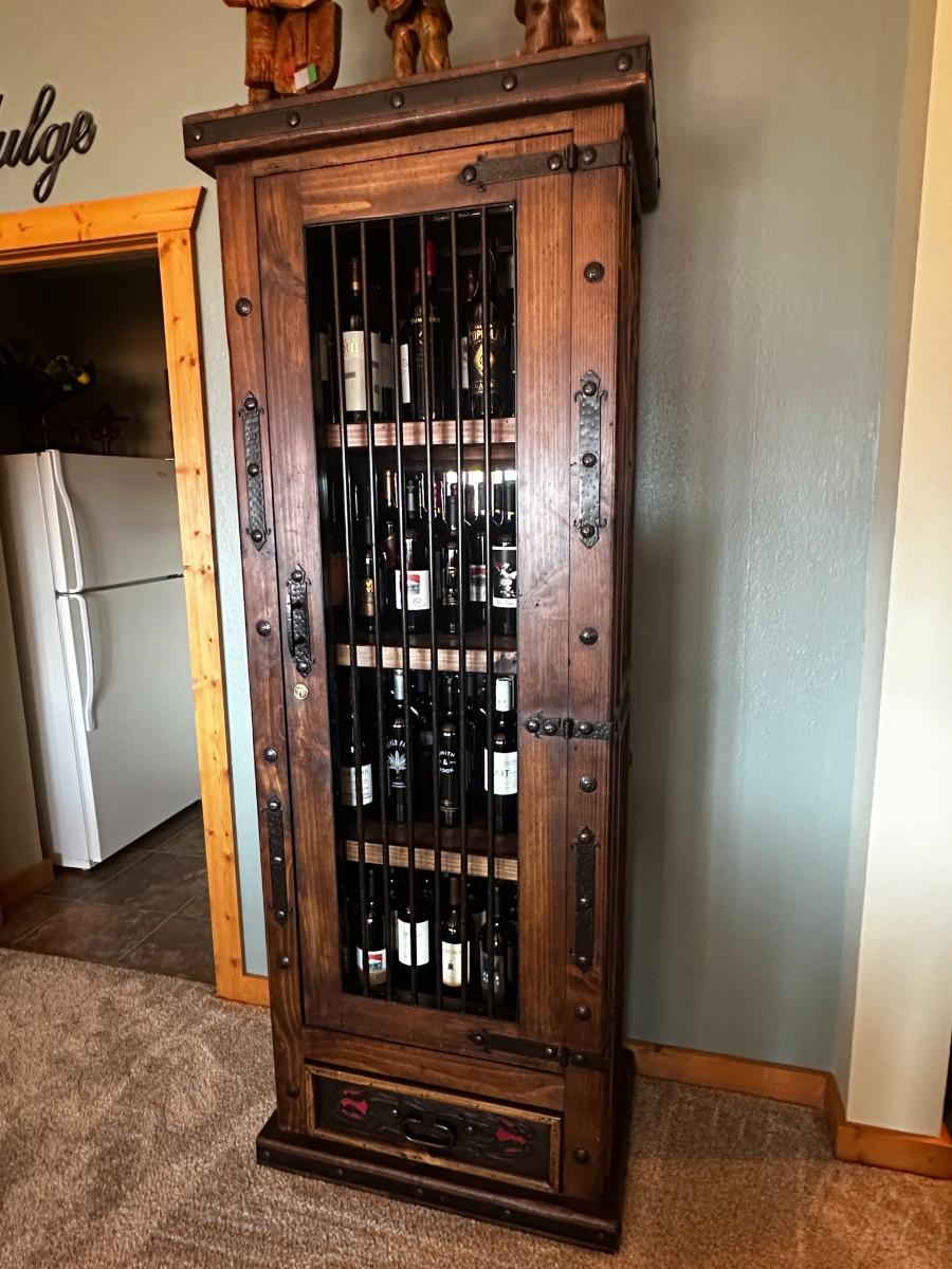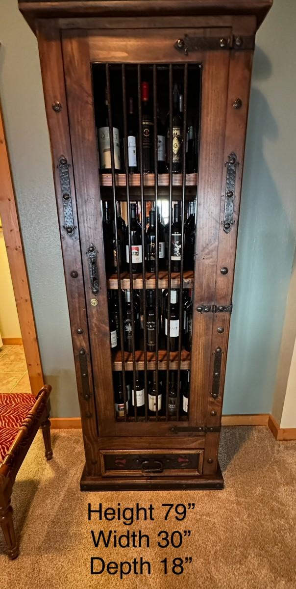 Rustic Wooden Locking Wine Cabinet (Contents Not Included) featuring a metal bar door and a bottom drawer.