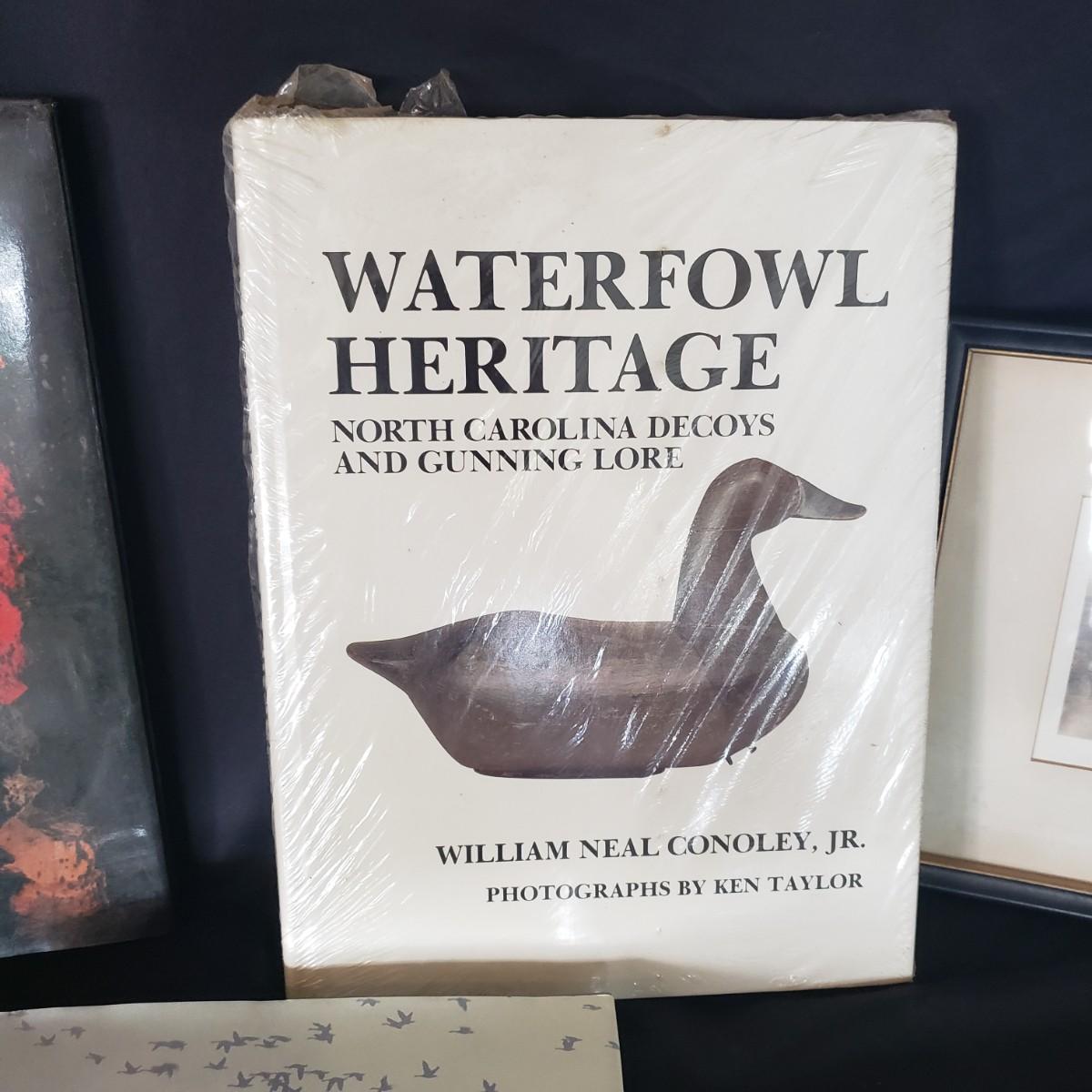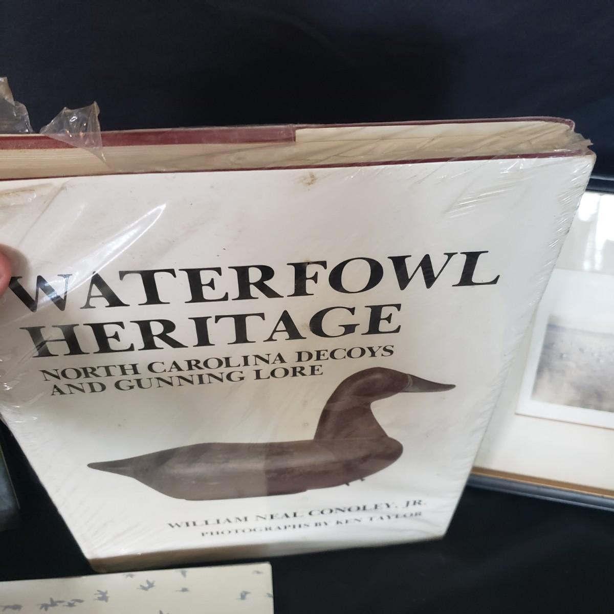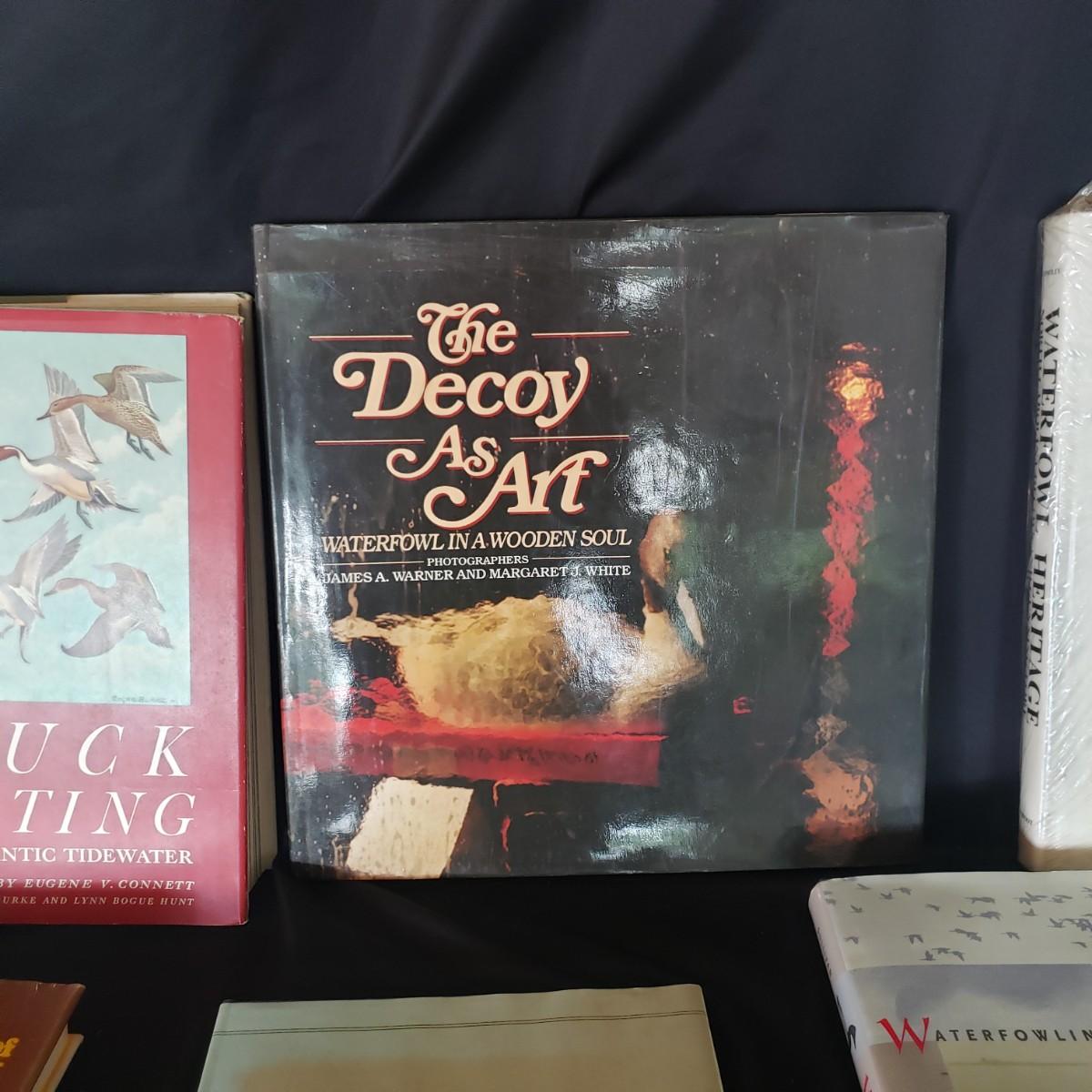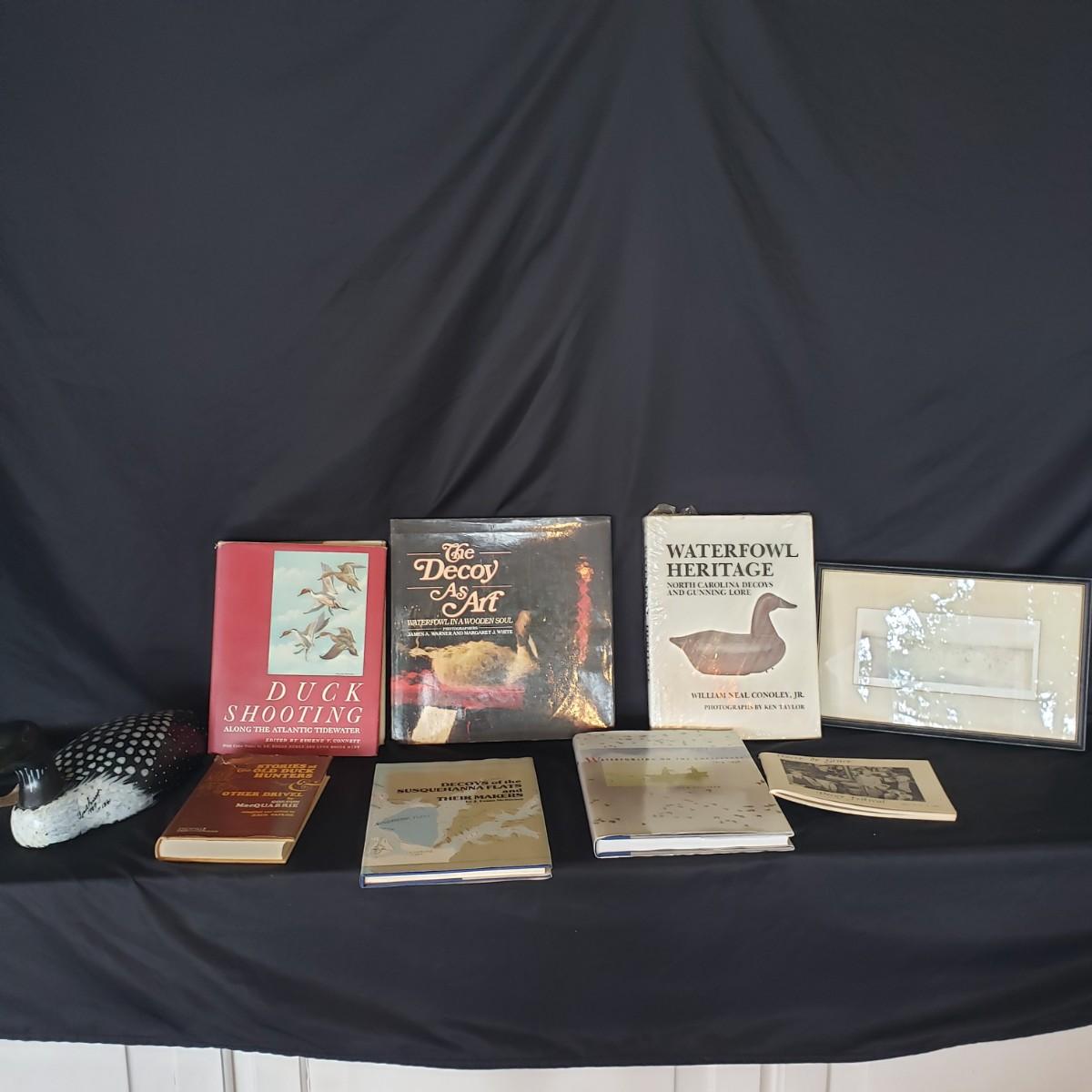 This lot features books about decoys and a wooden, hand painted Loon by April Forrest. The duck measures 18" x 6" x 6"H. The black wooden framed and matted picture of a hunter in a flock of ducks measures approximately 14" x 9". See pictures for book titles and illustrations from The Decoy as Art book. The Waterfowl Heritage book is still in its plastic from purchase.