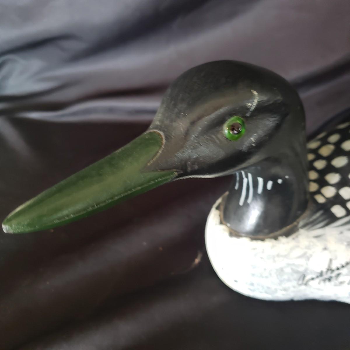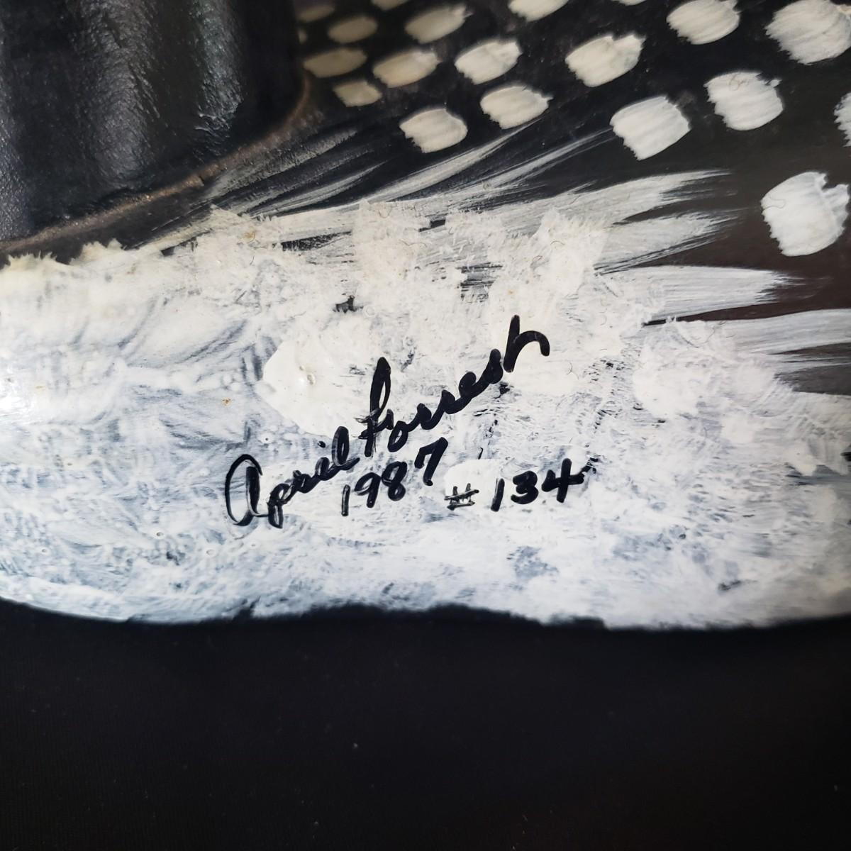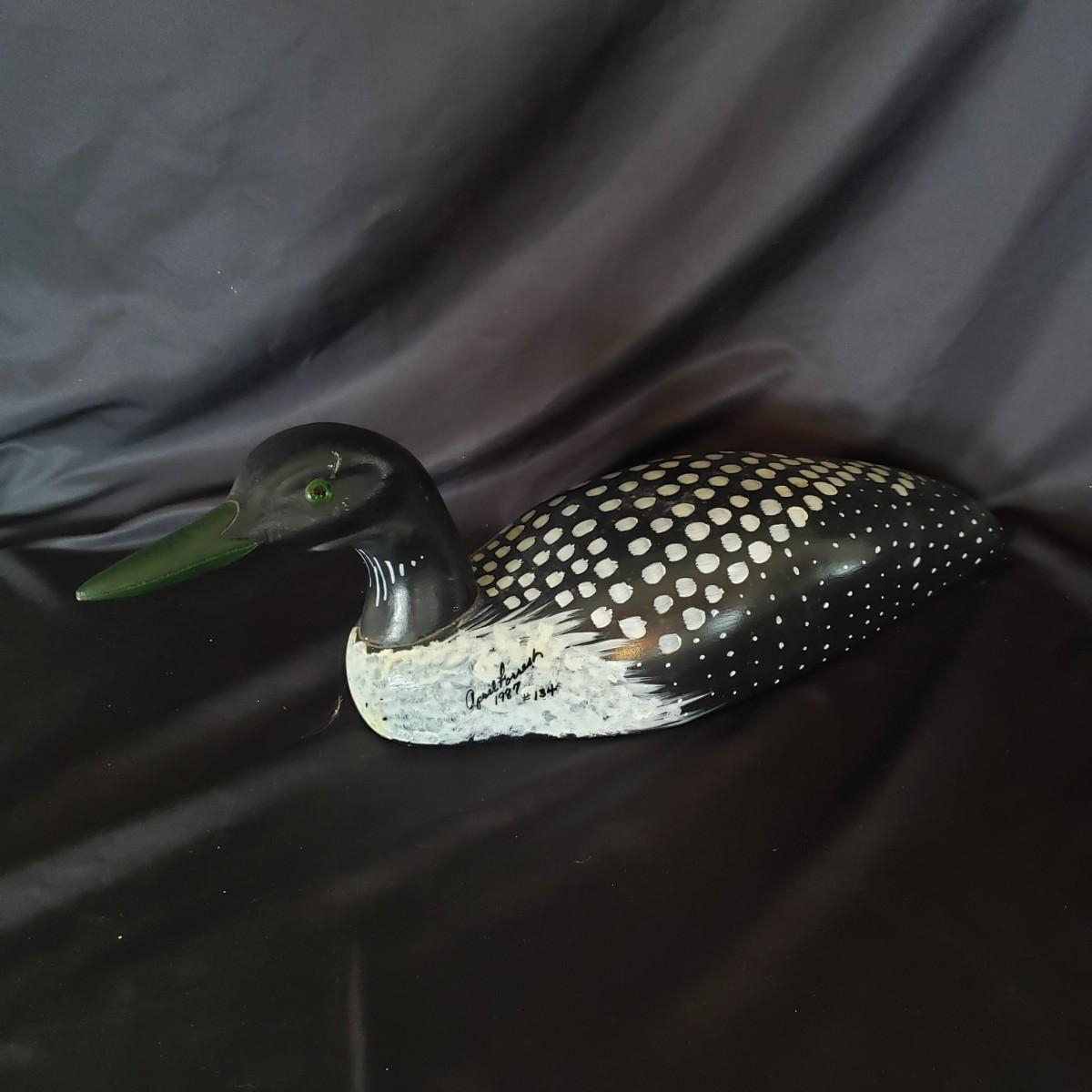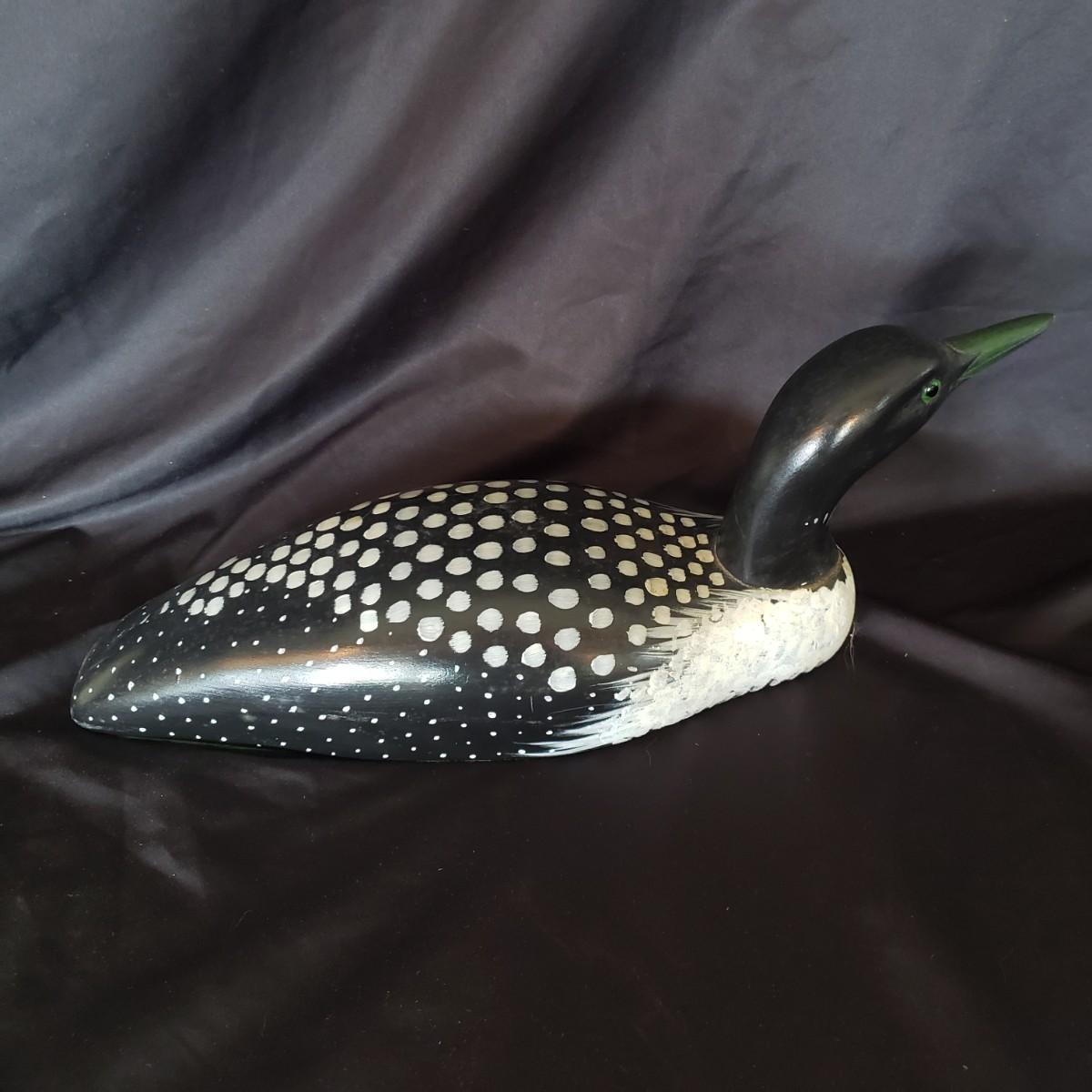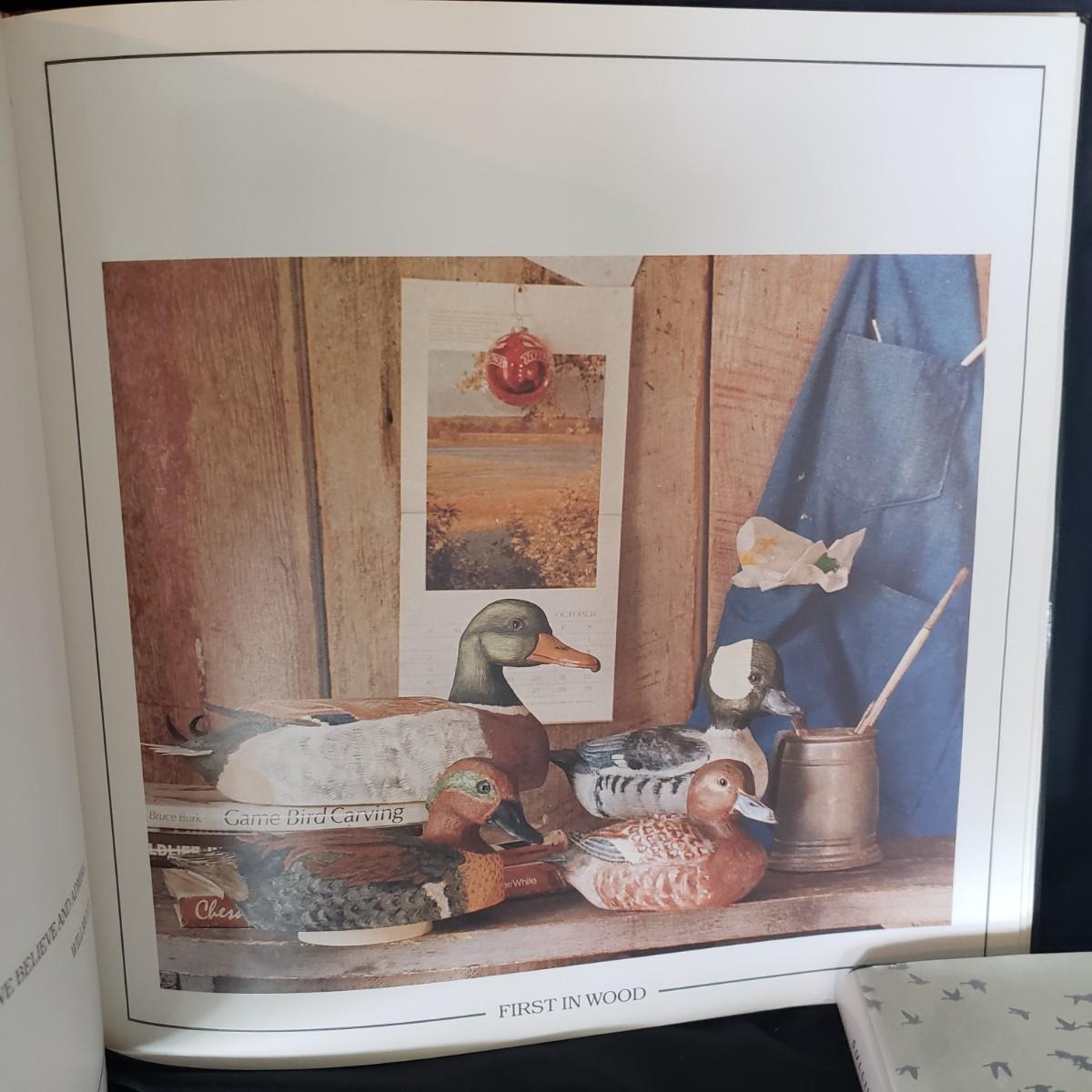 This lot features books about decoys and a wooden, hand painted Loon by April Forrest. The duck measures 18" x 6" x 6"H. The black wooden framed and matted picture of a hunter in a flock of ducks measures approximately 14" x 9". See pictures for book titles and illustrations from The Decoy as Art book. The Waterfowl Heritage book is still in its plastic from purchase.