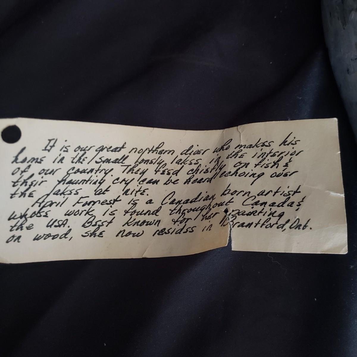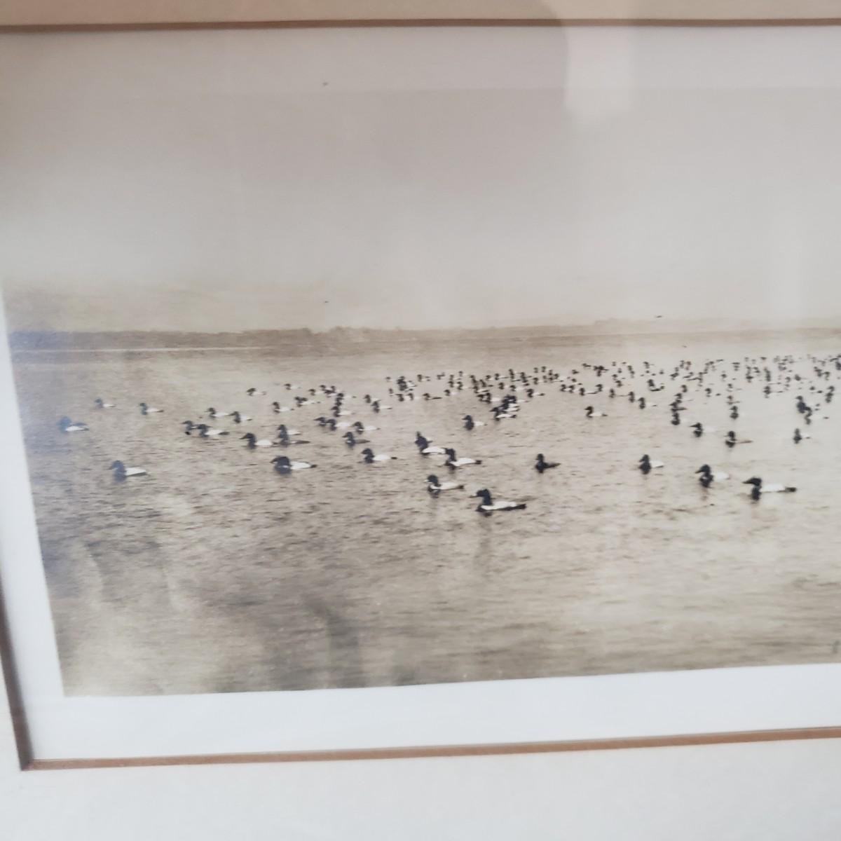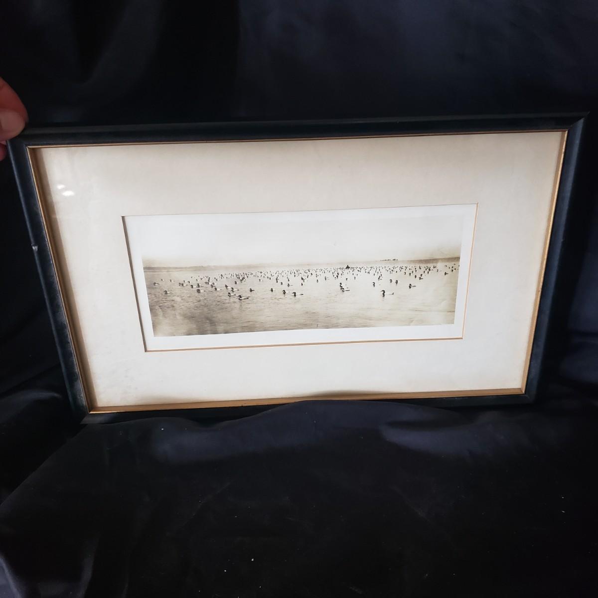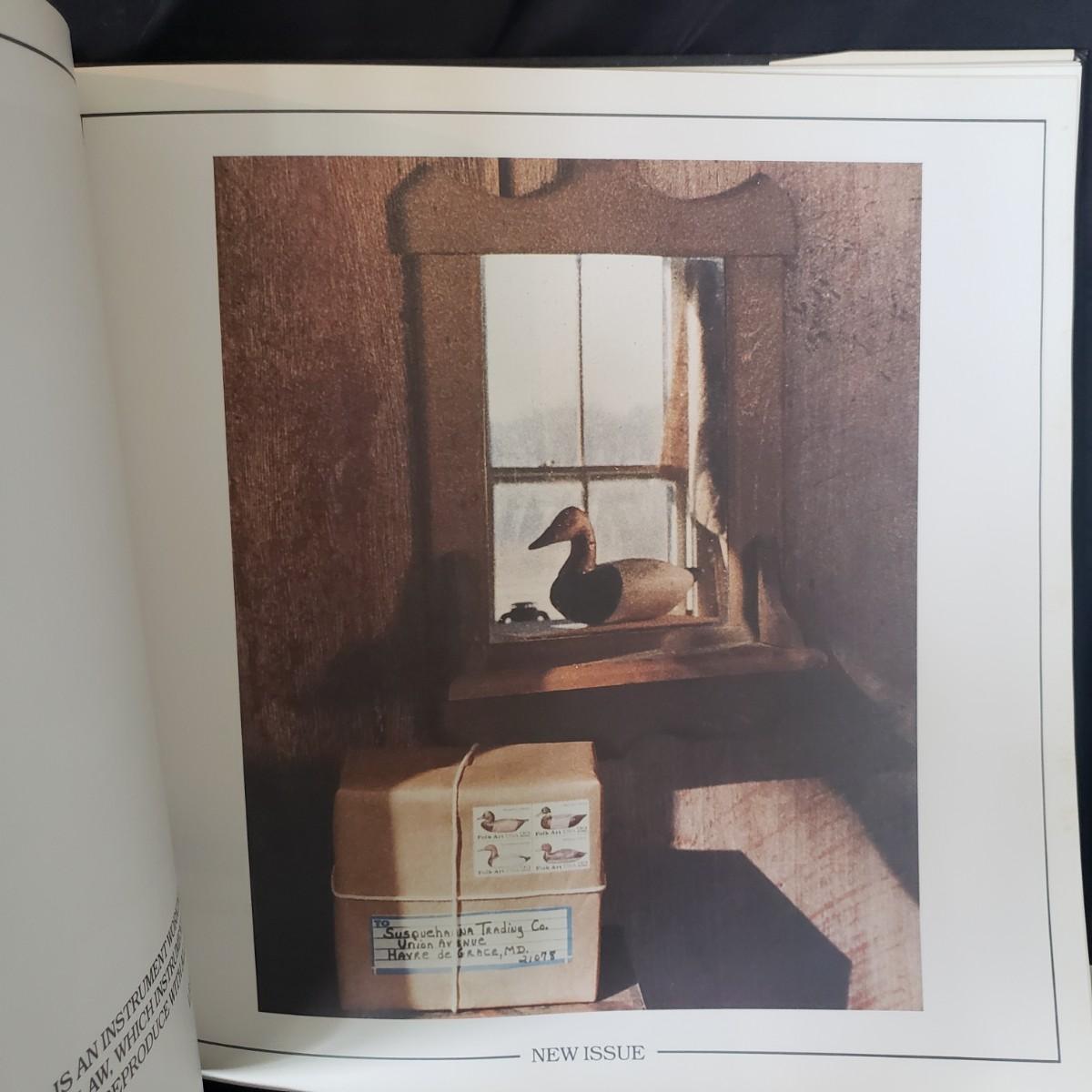 This lot features books about decoys and a wooden, hand painted Loon by April Forrest. The duck measures 18" x 6" x 6"H. The black wooden framed and matted picture of a hunter in a flock of ducks measures approximately 14" x 9". See pictures for book titles and illustrations from The Decoy as Art book. The Waterfowl Heritage book is still in its plastic from purchase.