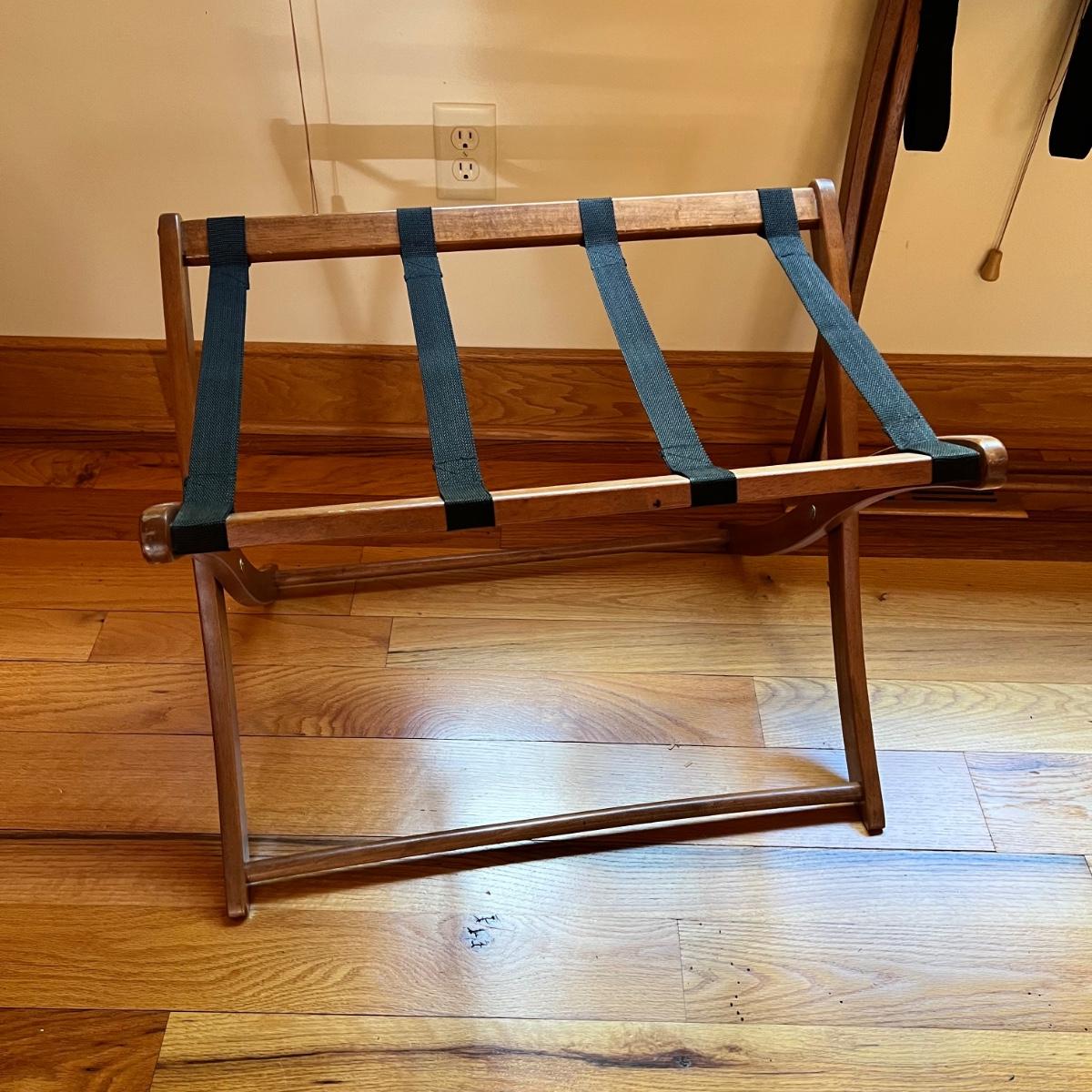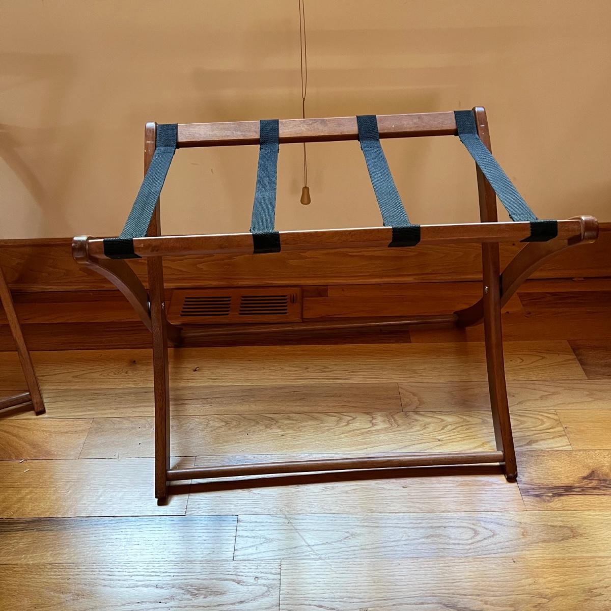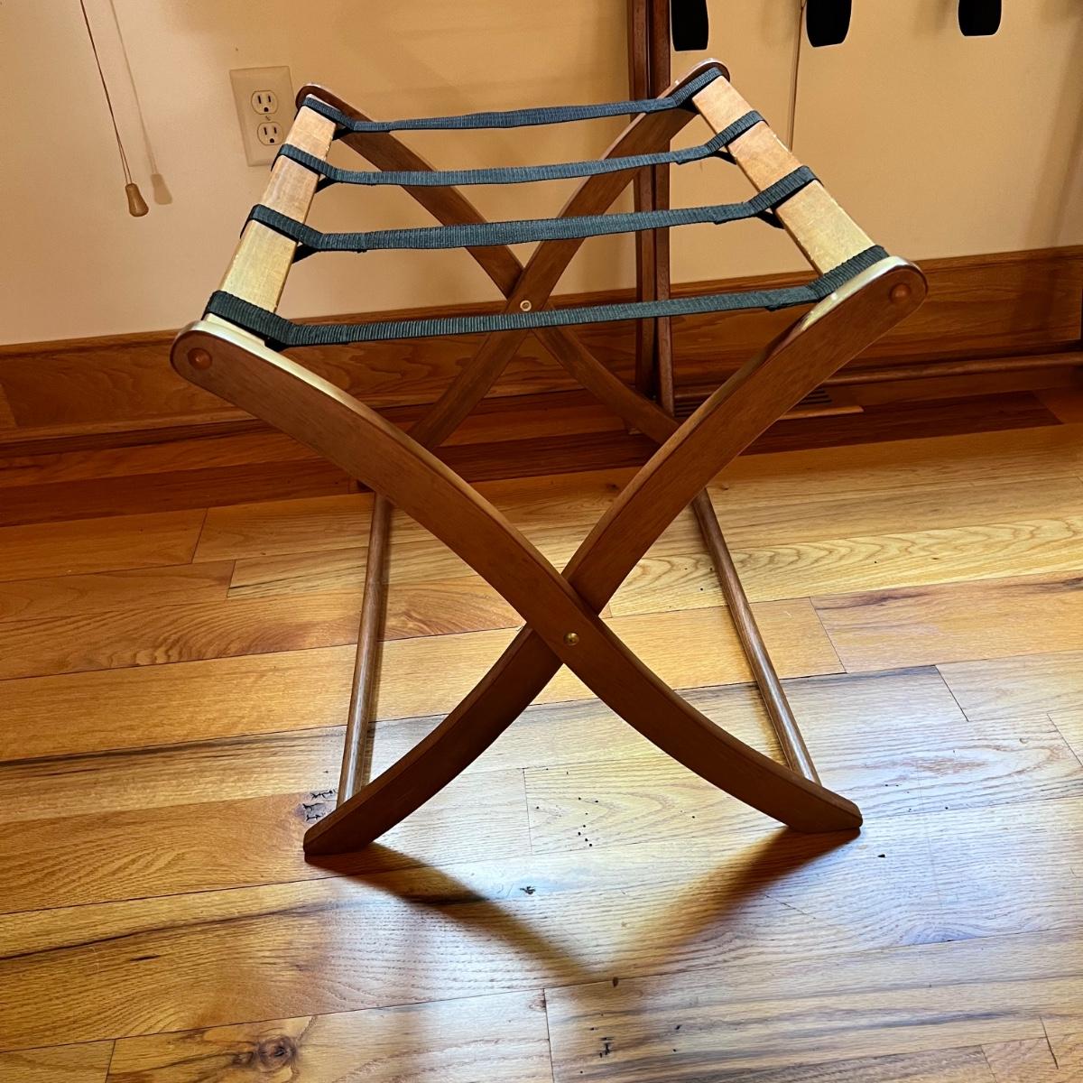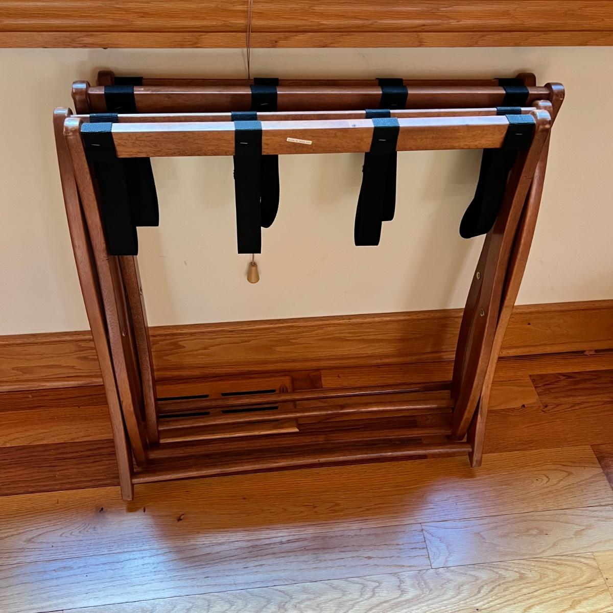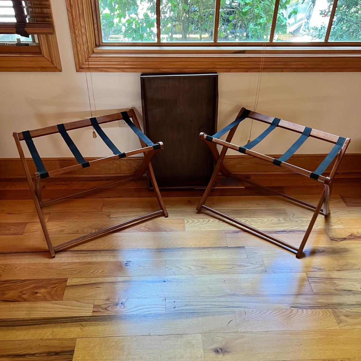 Two wooden, collapsible luggage racks and a large wooden tray. The wooden tray has cut-out handholds on either side and measures approximately 27” x 17” x 4”H. The luggage racks are identical and measure approximately26.5” x 18.5 x 20”H.