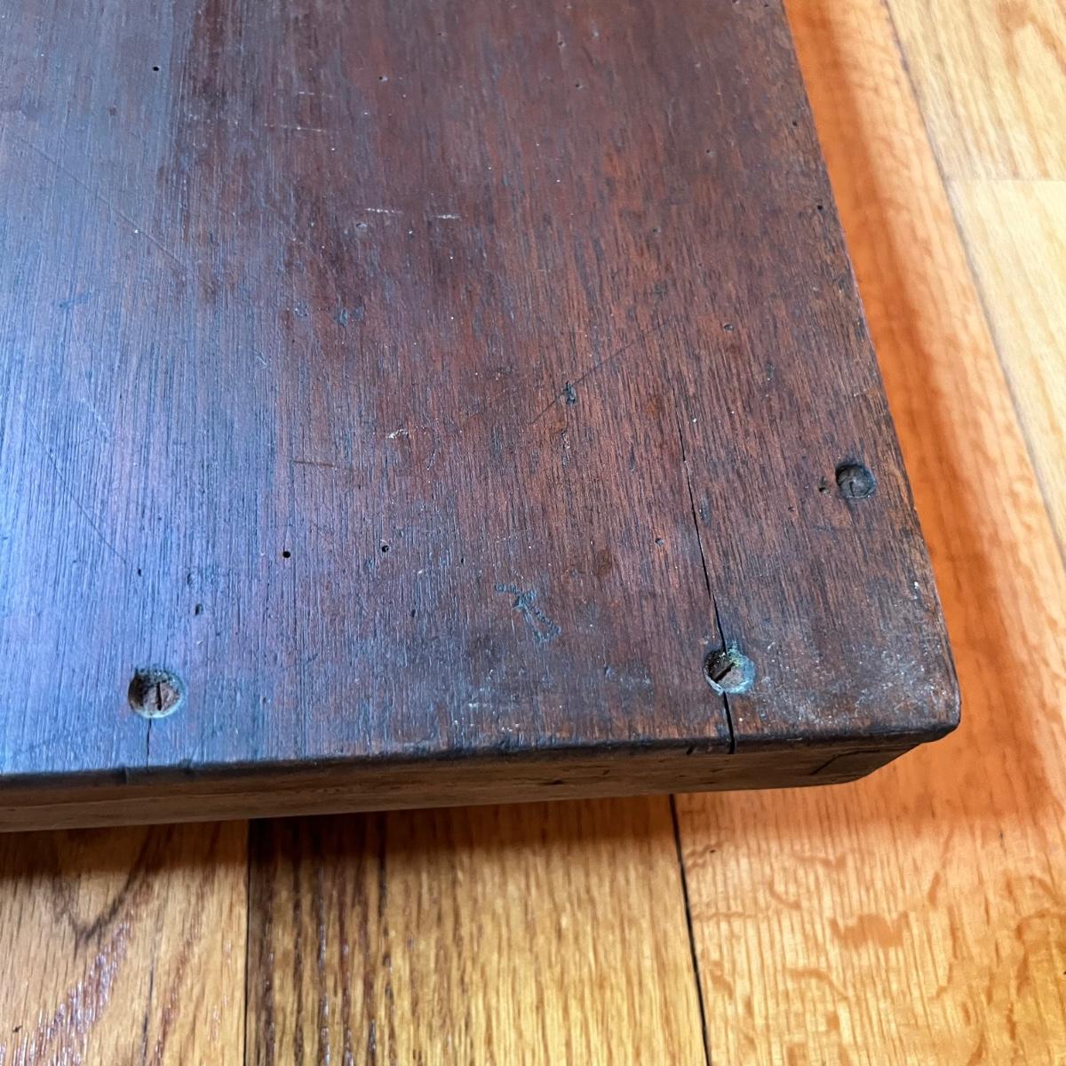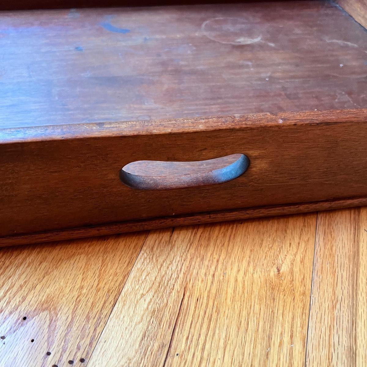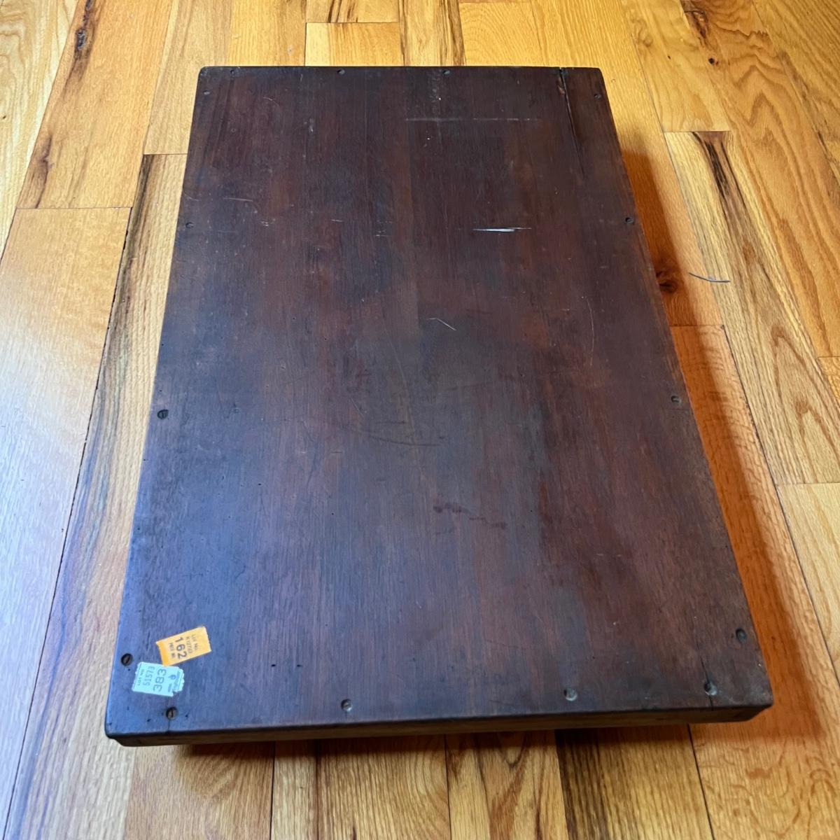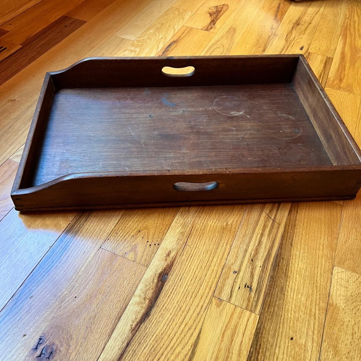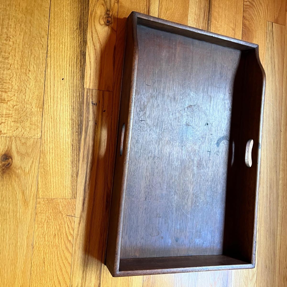 Two wooden, collapsible luggage racks and a large wooden tray. The wooden tray has cut-out handholds on either side and measures approximately 27” x 17” x 4”H. The luggage racks are identical and measure approximately26.5” x 18.5 x 20”H.