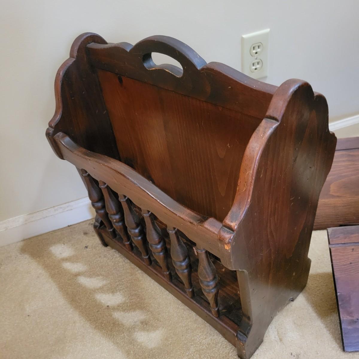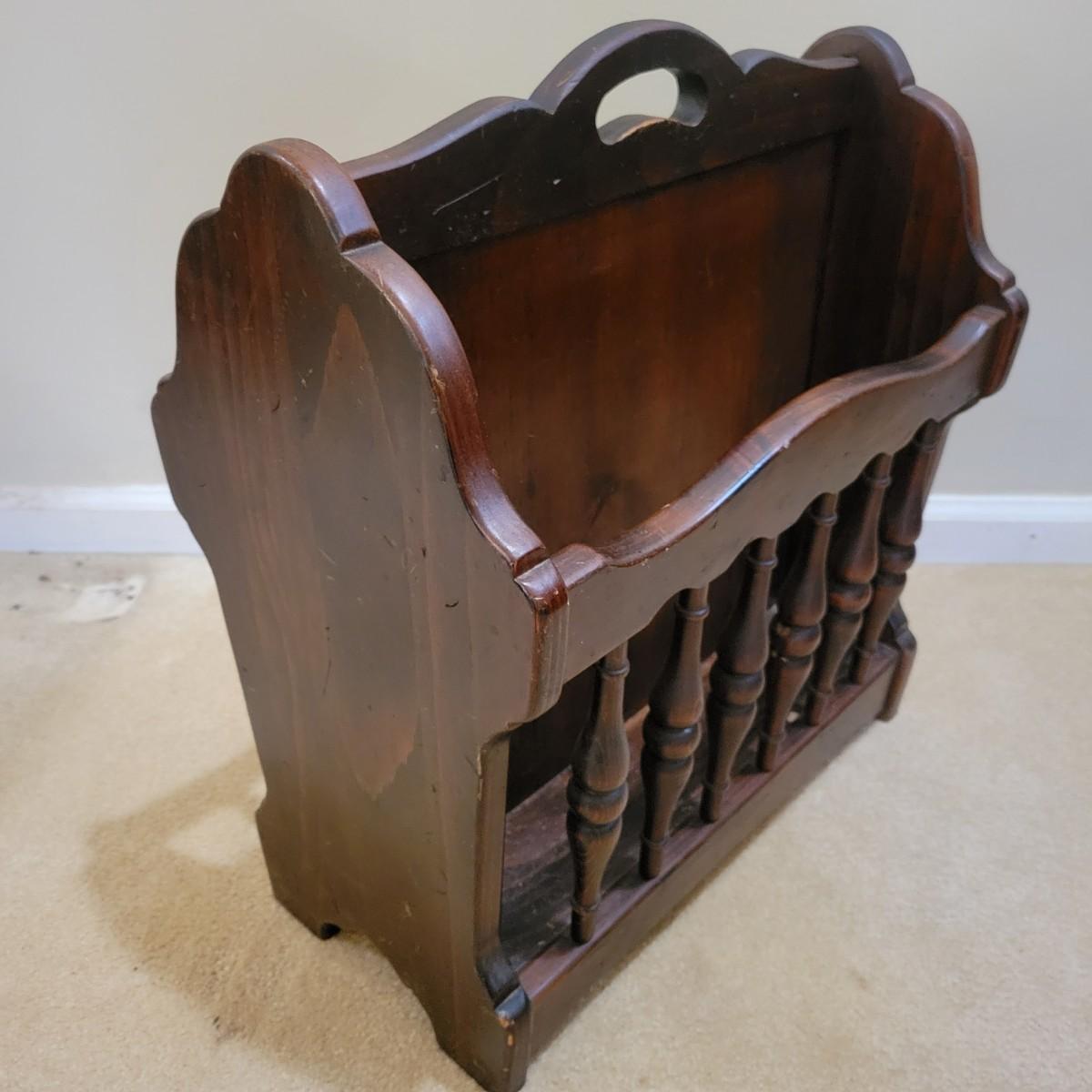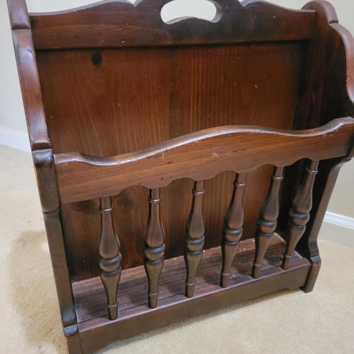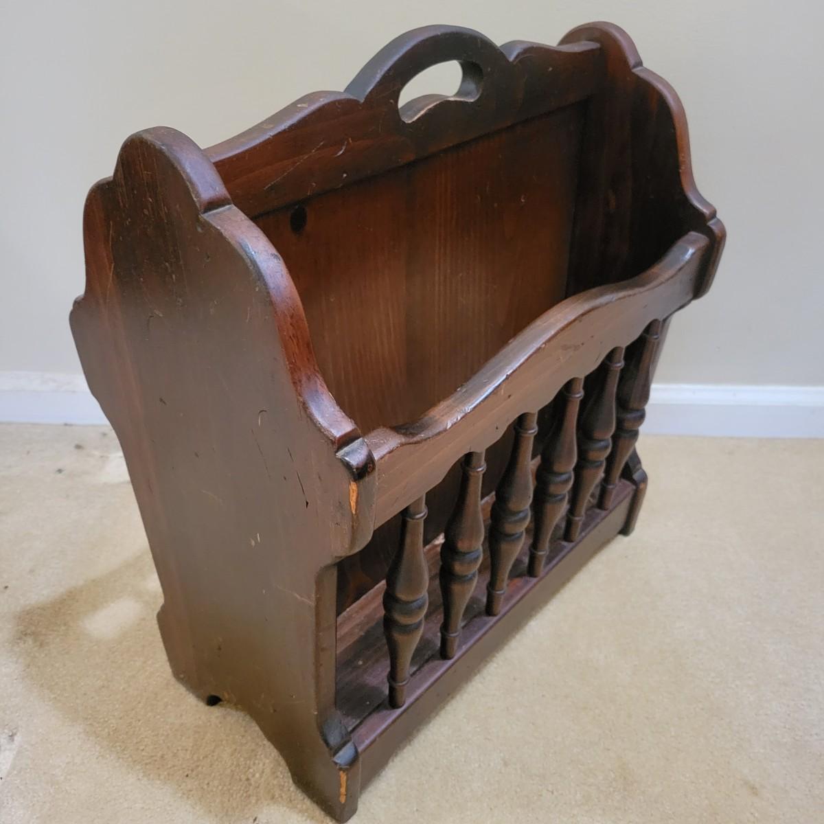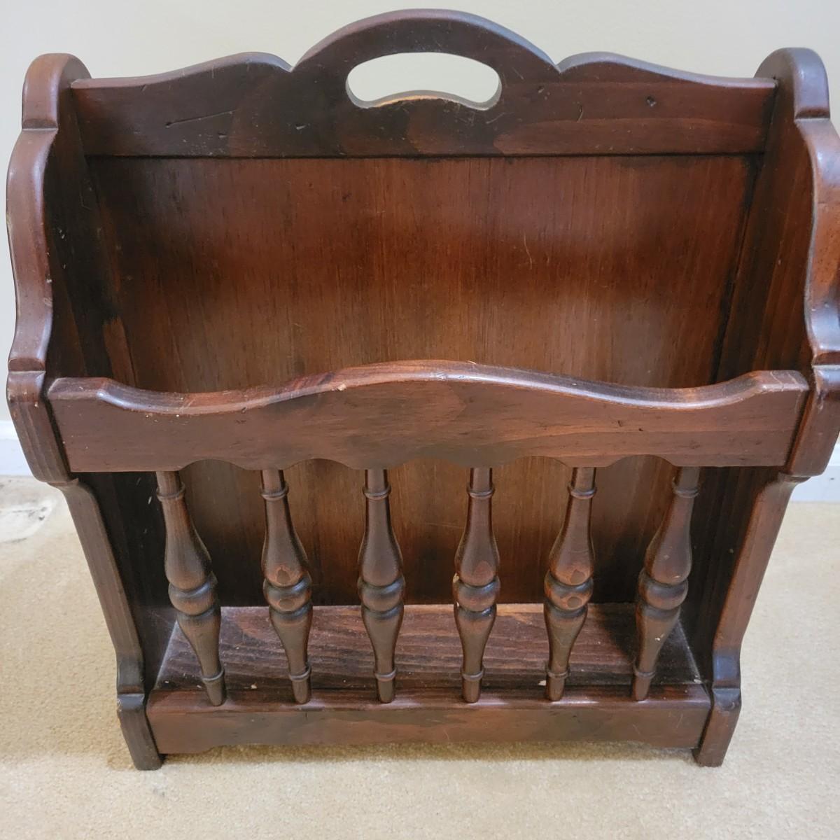 A wooden magazine caddy and two small shelves in good condition with some minor blemishes. All three pieces feature a rich, dark brown stain. The magazine caddy has spindle sides with a convenient handle on its top. Also included is two small wall shelves that each have a groove for displaying plates. Shelves measure approximately 24" x 8" x 7.5". The magazine caddy measures approximately 16.5" x 10" x 18.5". Local pickup only