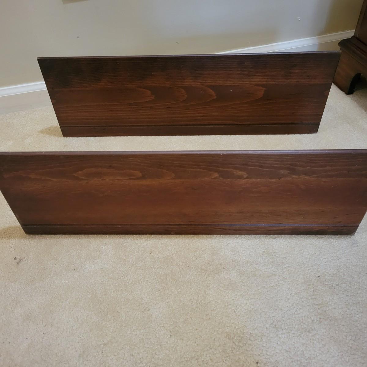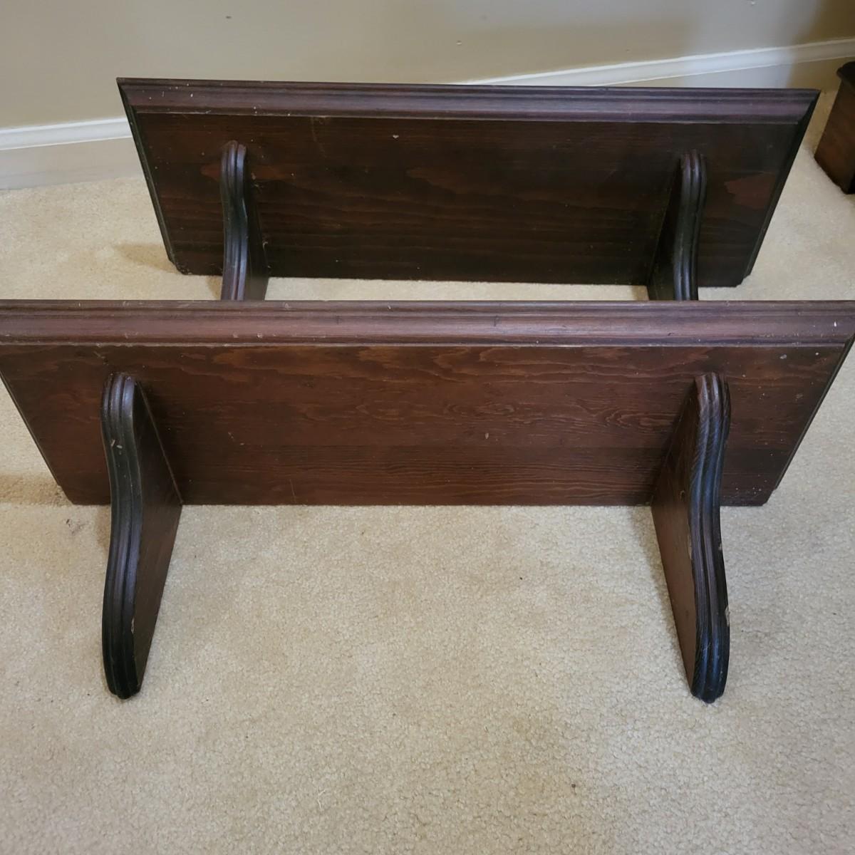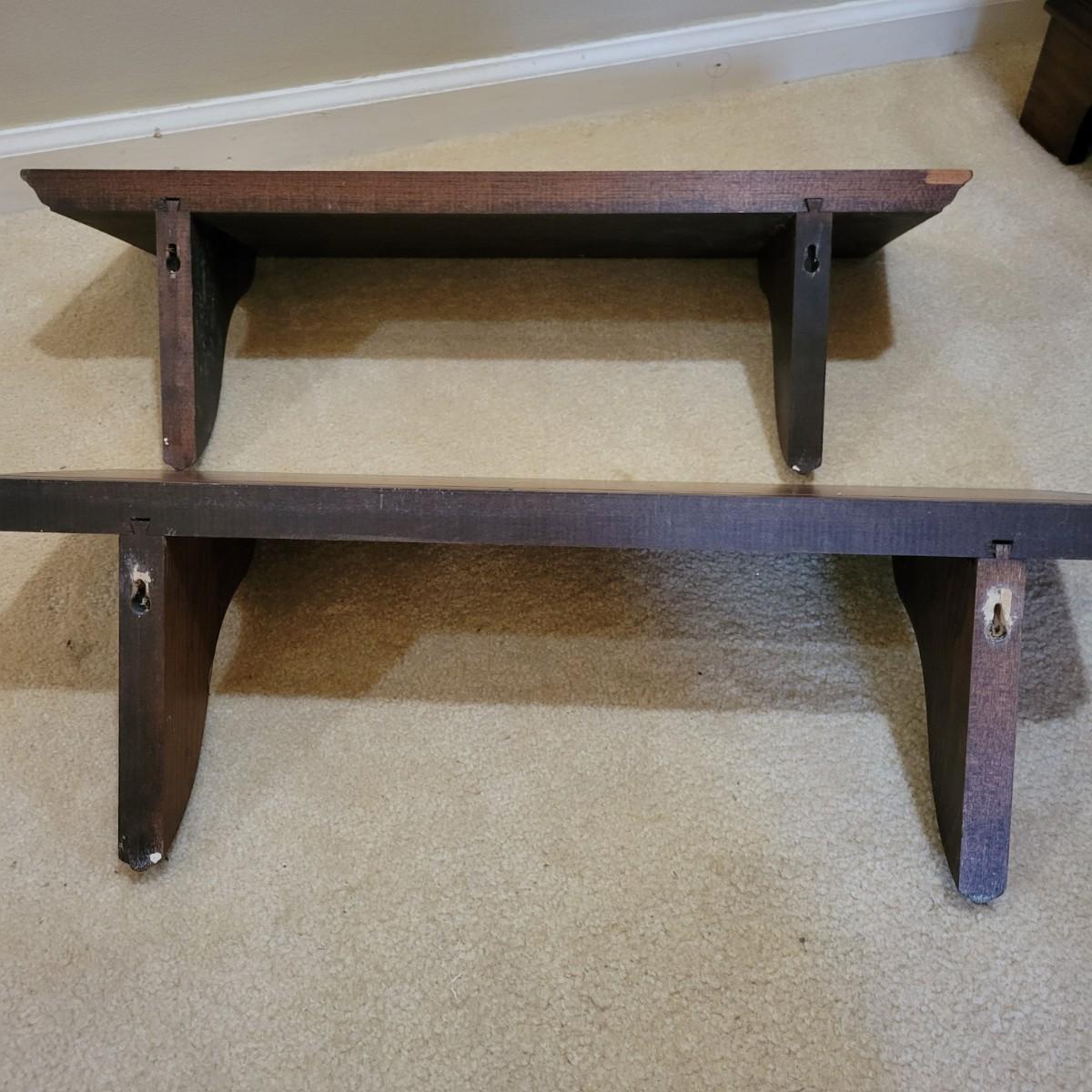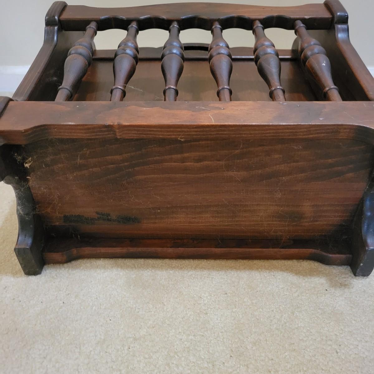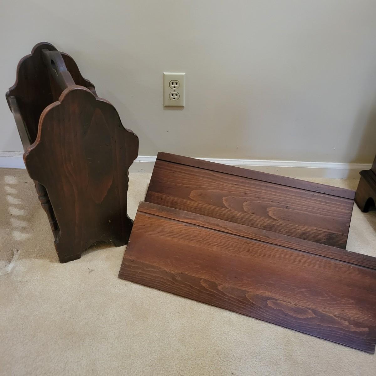 A wooden magazine caddy and two small shelves in good condition with some minor blemishes. All three pieces feature a rich, dark brown stain. The magazine caddy has spindle sides with a convenient handle on its top. Also included is two small wall shelves that each have a groove for displaying plates. Shelves measure approximately 24" x 8" x 7.5". The magazine caddy measures approximately 16.5" x 10" x 18.5". Local pickup only