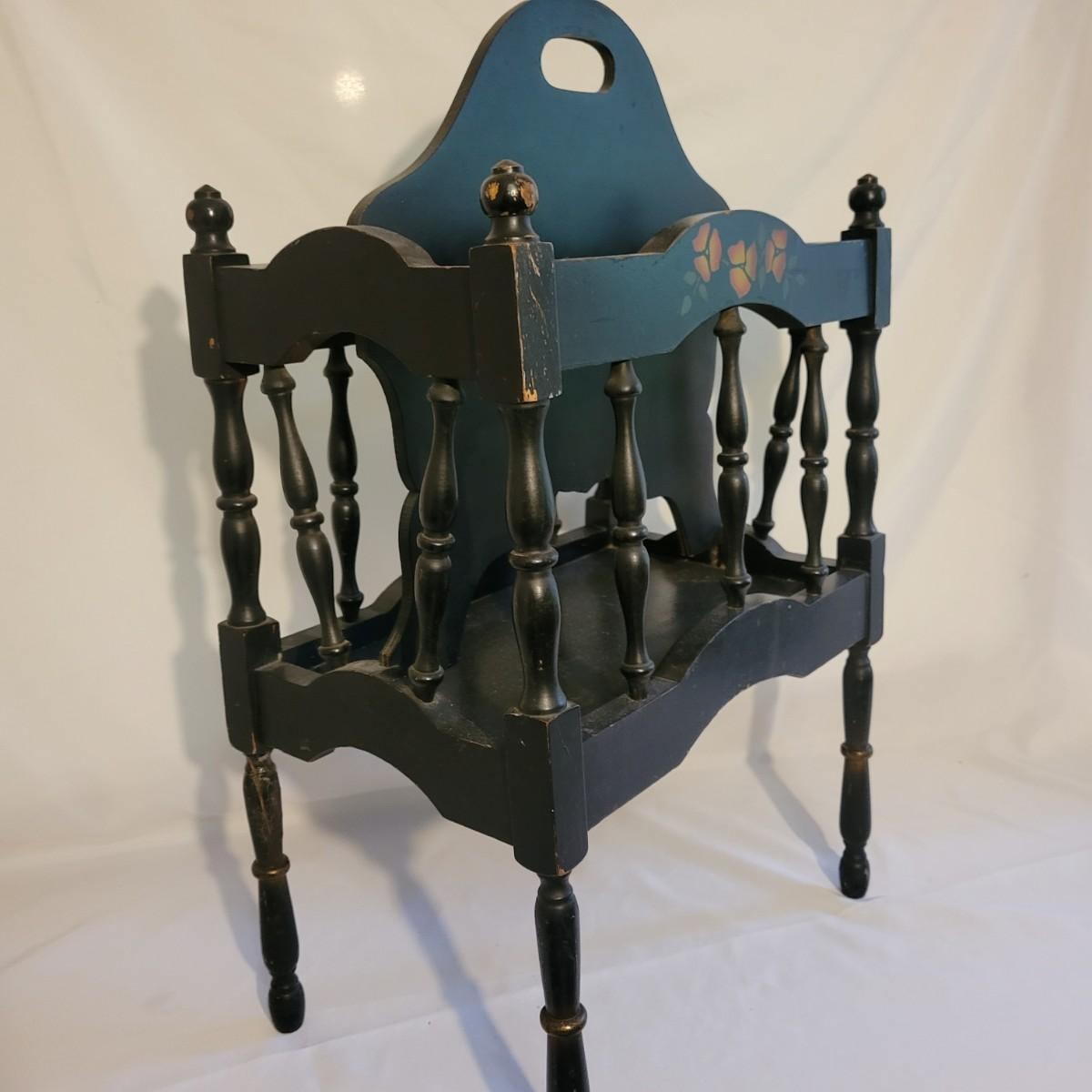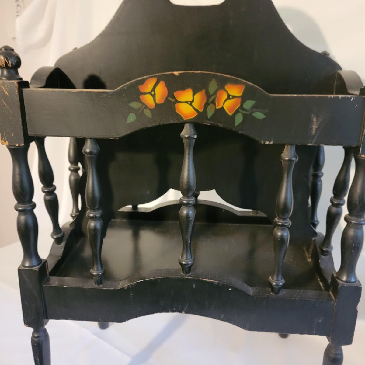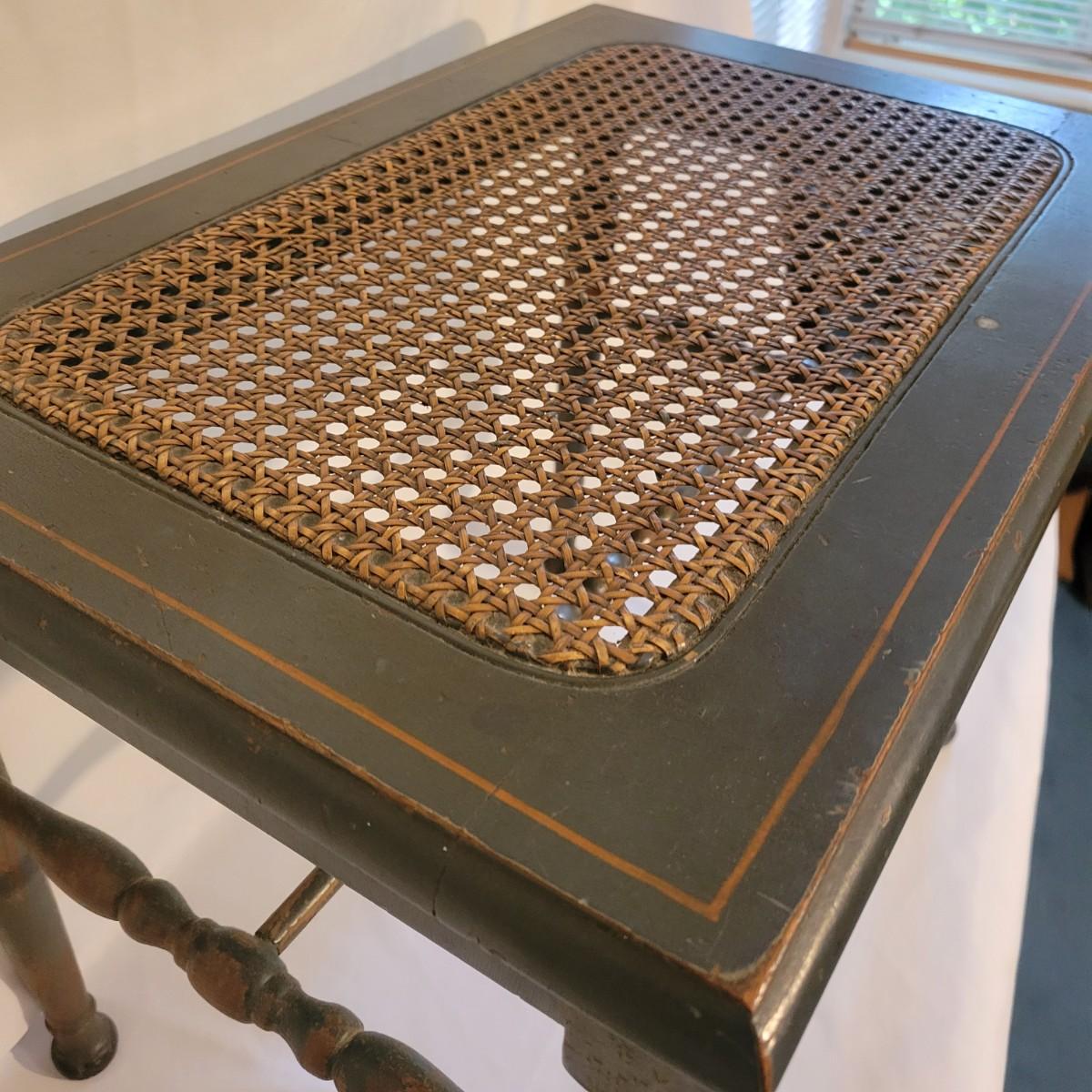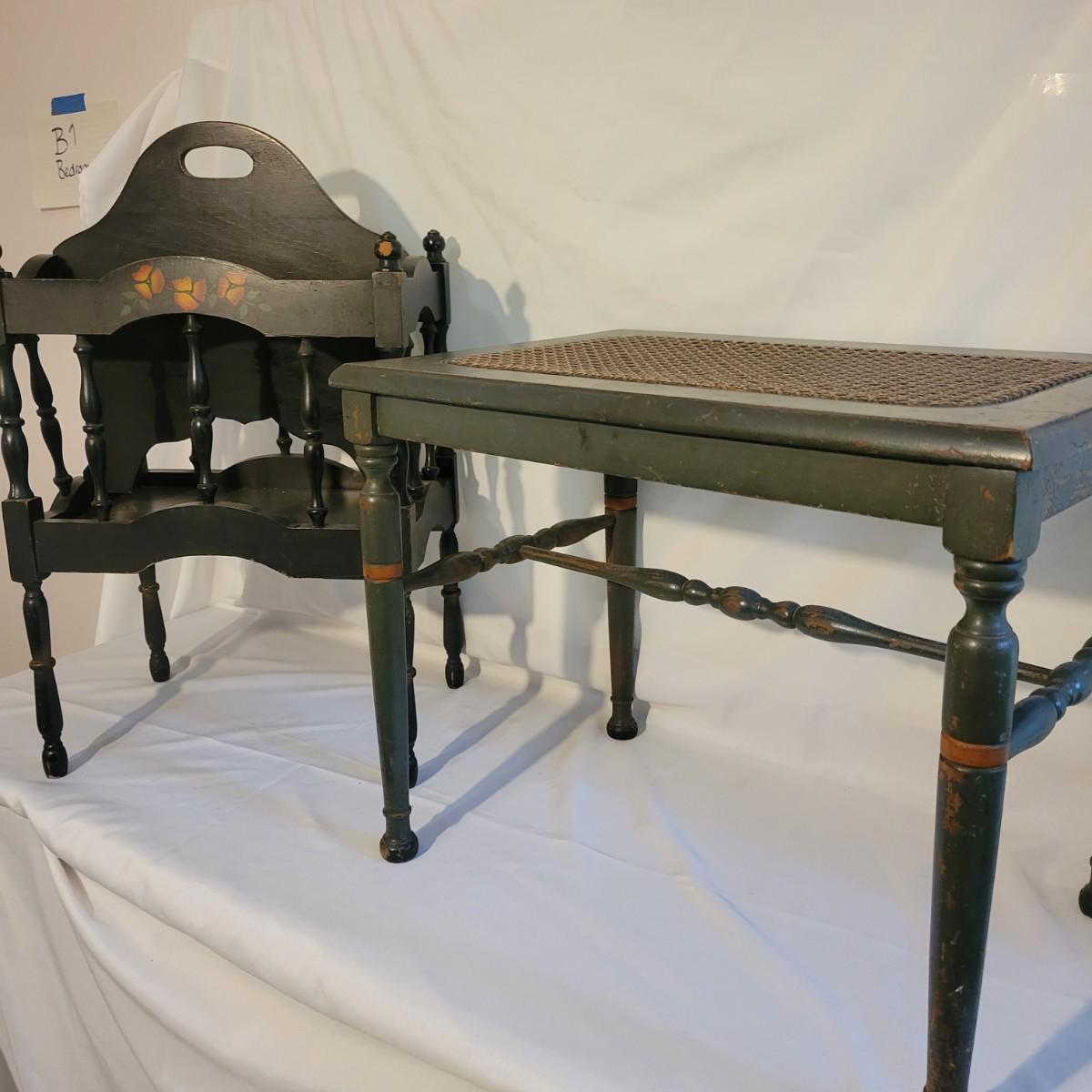 A wooden vanity stool with a woven cane seat in good condition. The stool does show some worn paint, but is still solidly constructed. Also included is a wooden magazine rack that is painted black with floral details painted on. Rack is in good condition, but does have some areas where the paint has worn off. Magazine rack measures approximately 16" x 10" x 26". Local pickup only.