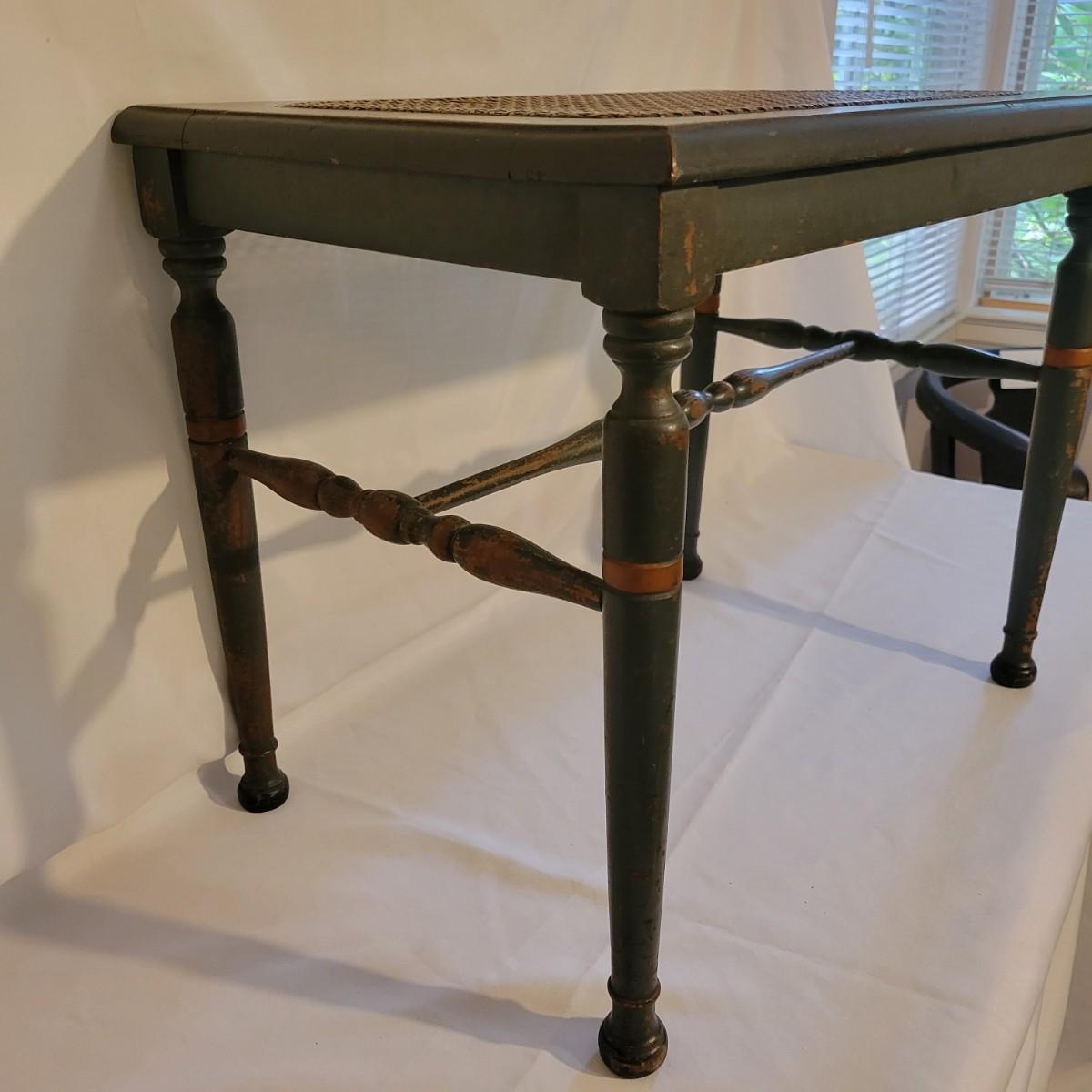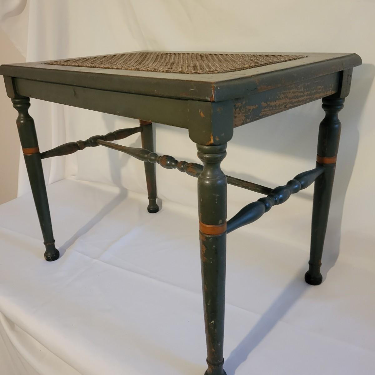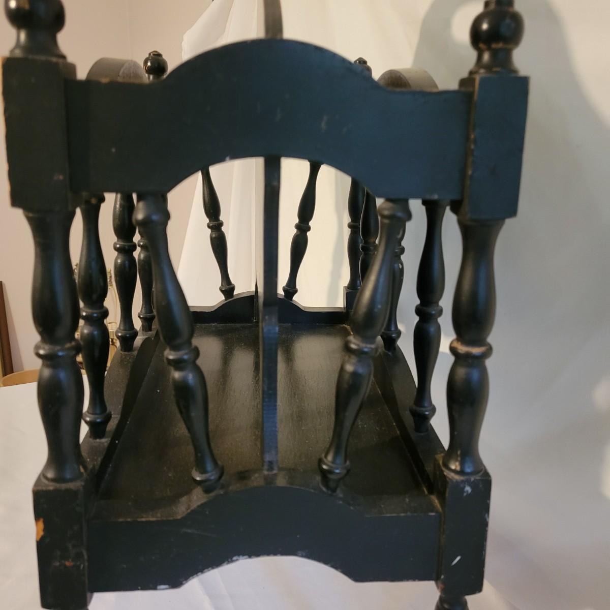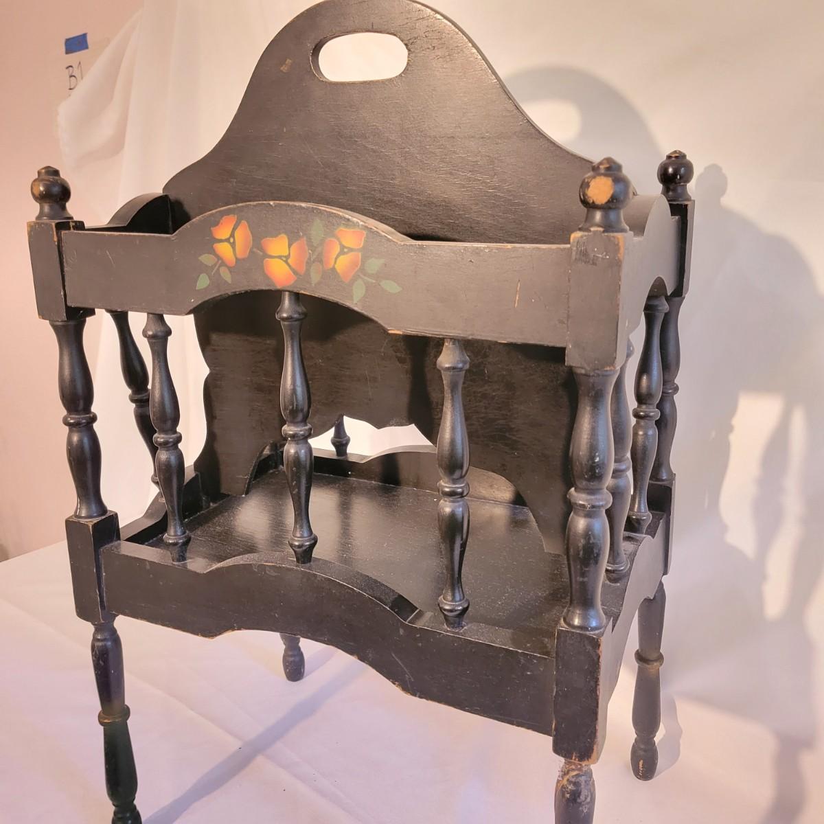 A wooden vanity stool with a woven cane seat in good condition. The stool does show some worn paint, but is still solidly constructed. Also included is a wooden magazine rack that is painted black with floral details painted on. Rack is in good condition, but does have some areas where the paint has worn off. Magazine rack measures approximately 16" x 10" x 26". Local pickup only.