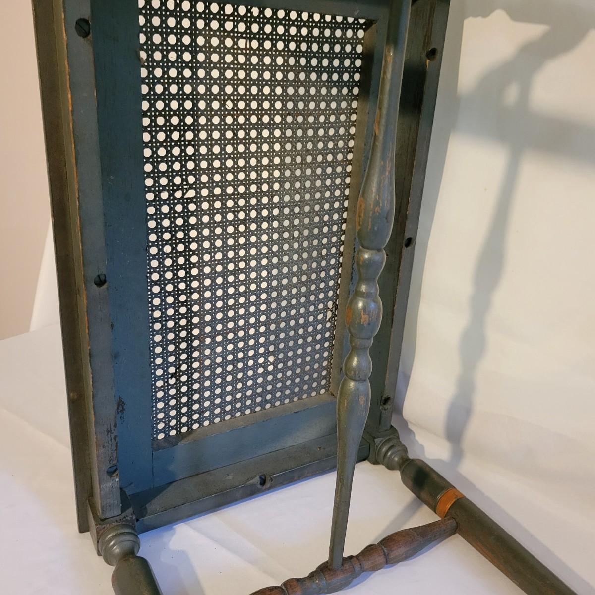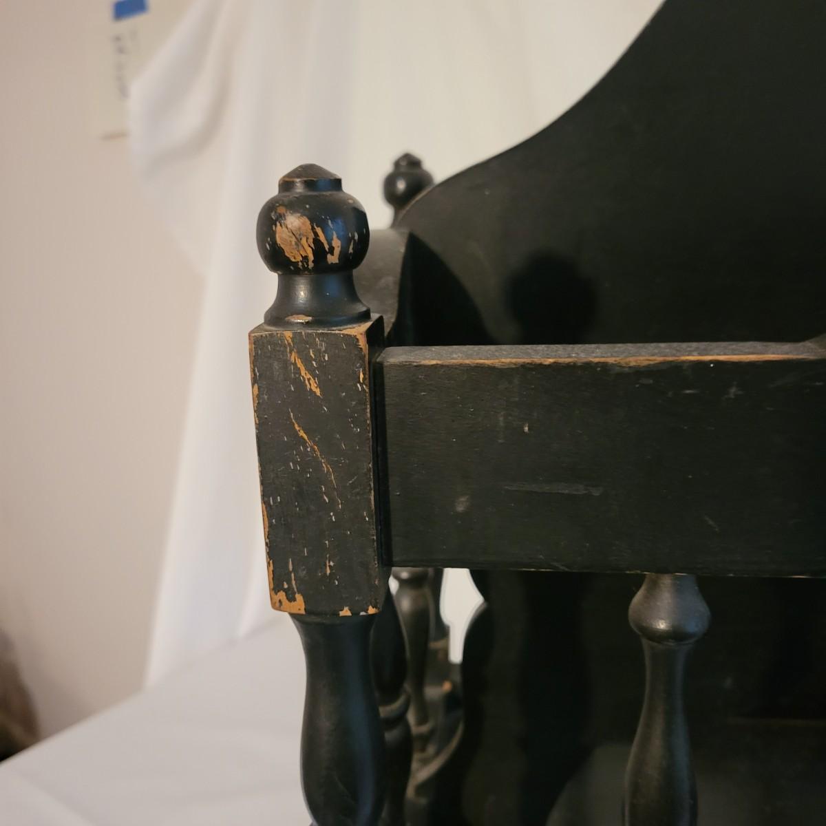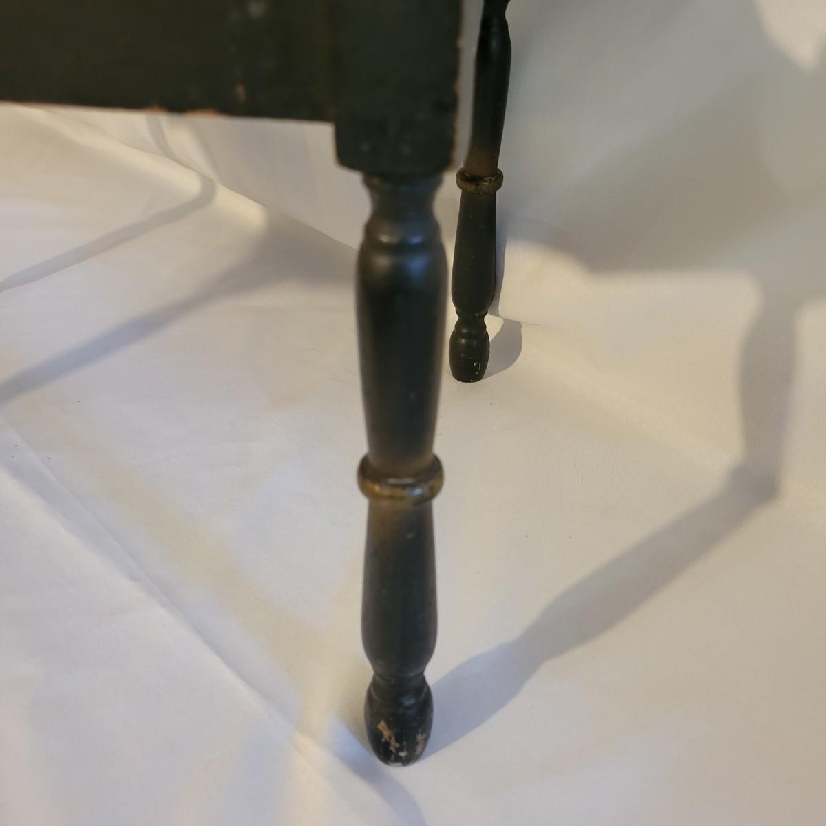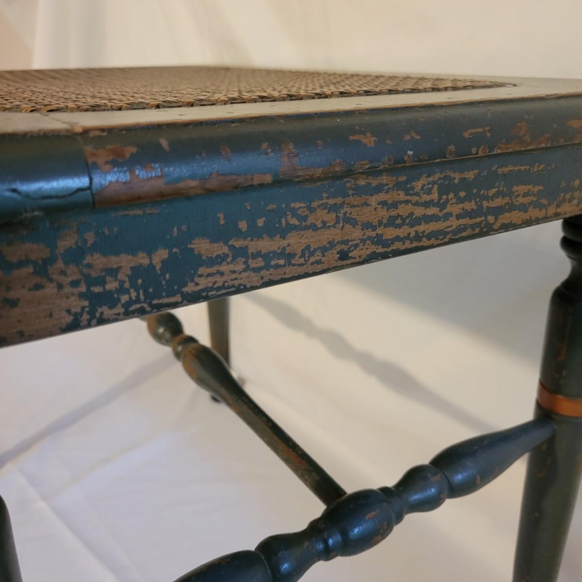 A wooden vanity stool with a woven cane seat in good condition. The stool does show some worn paint, but is still solidly constructed. Also included is a wooden magazine rack that is painted black with floral details painted on. Rack is in good condition, but does have some areas where the paint has worn off. Magazine rack measures approximately 16" x 10" x 26". Local pickup only.