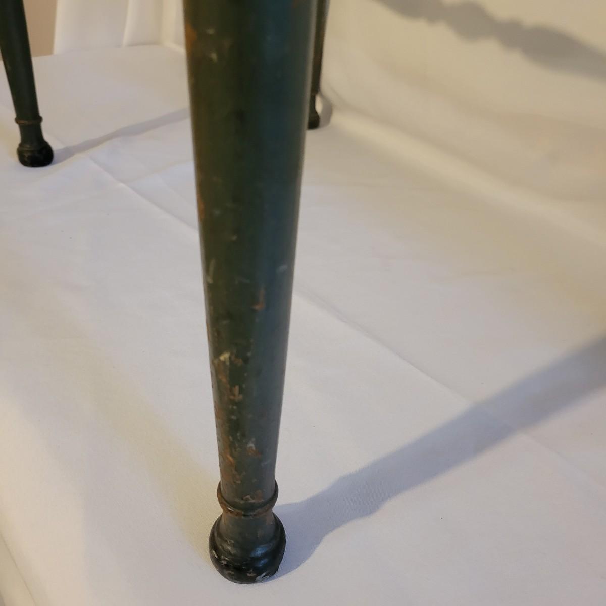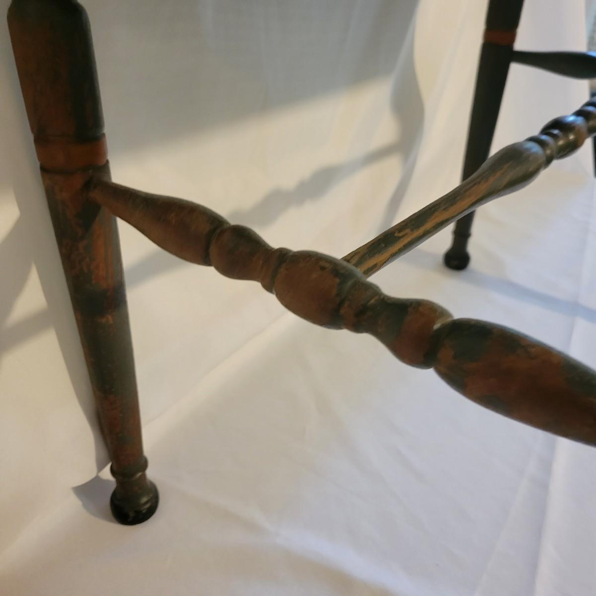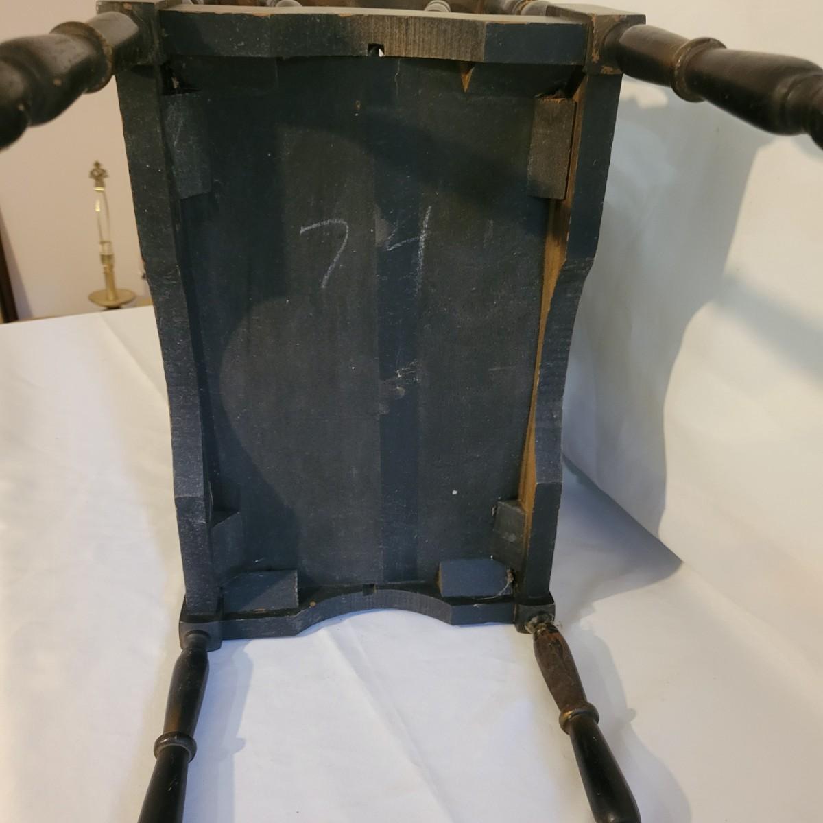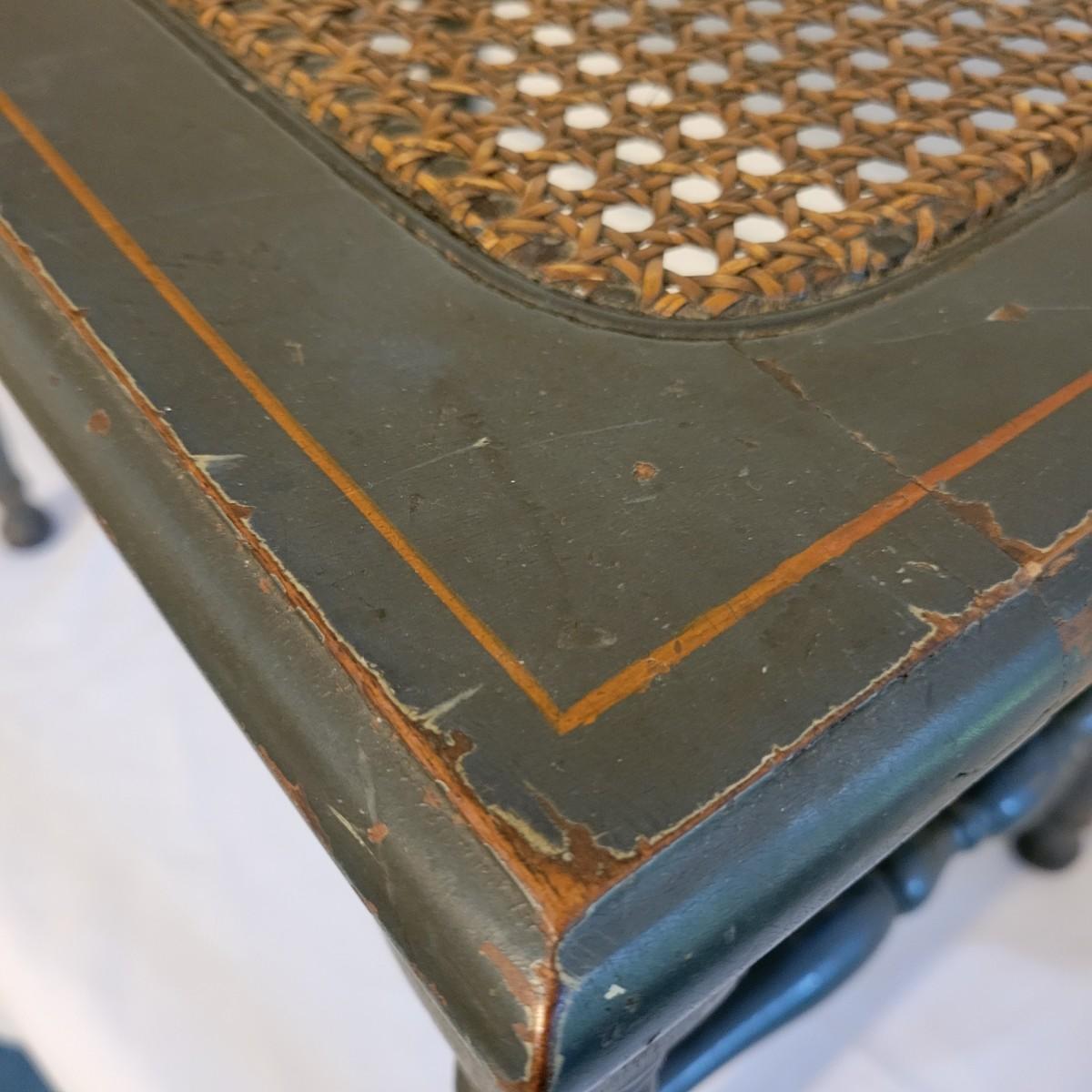 A wooden vanity stool with a woven cane seat in good condition. The stool does show some worn paint, but is still solidly constructed. Also included is a wooden magazine rack that is painted black with floral details painted on. Rack is in good condition, but does have some areas where the paint has worn off. Magazine rack measures approximately 16" x 10" x 26". Local pickup only.