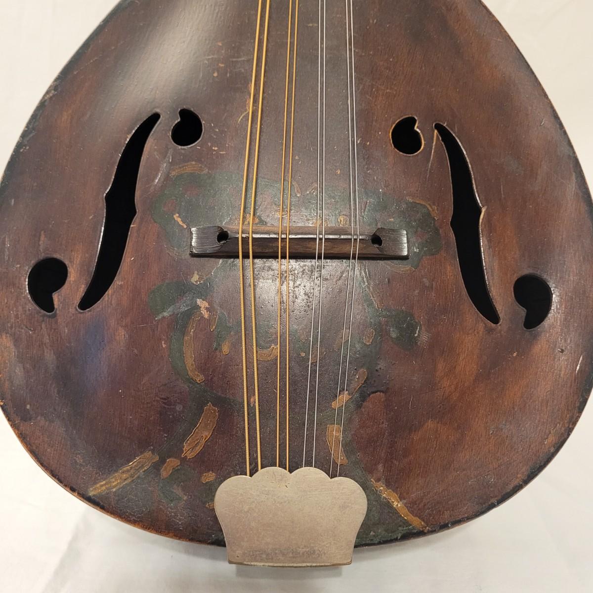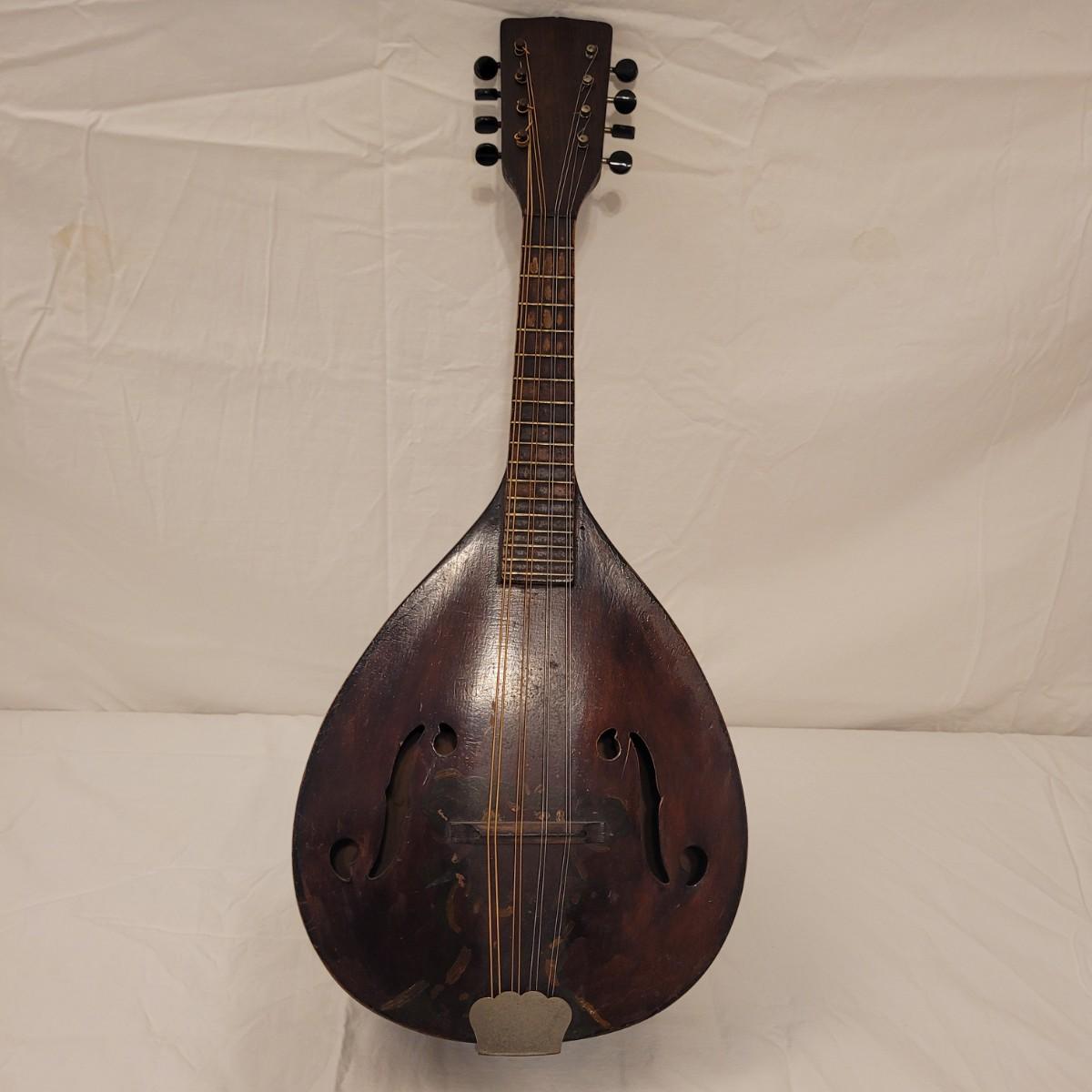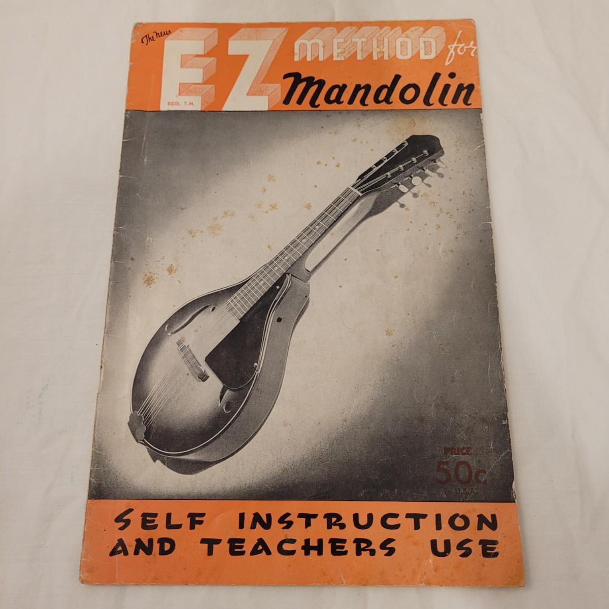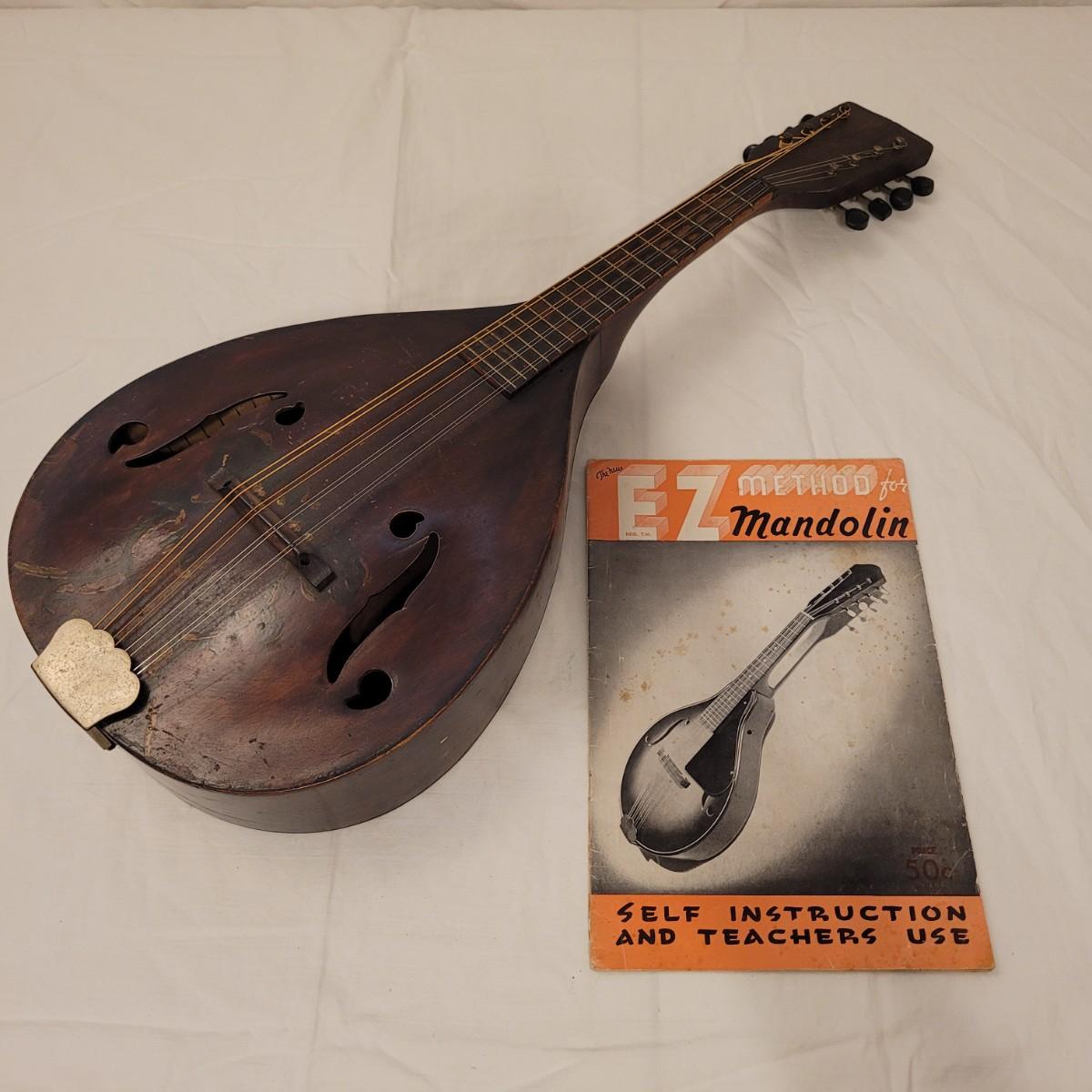This lot includes one wooden mandolin and one vintage self instruction book. The mandolin is made from wood and appears to be vintage. It is still strung and is ready to be tuned and played. There does not appear to be a makers mark or signature anywhere on the instrument. The book is titled "EZ Method for Mandolin" and features songs and instructions for learning to play the mandolin. The instrument measures 10" x 3" x 24"H.