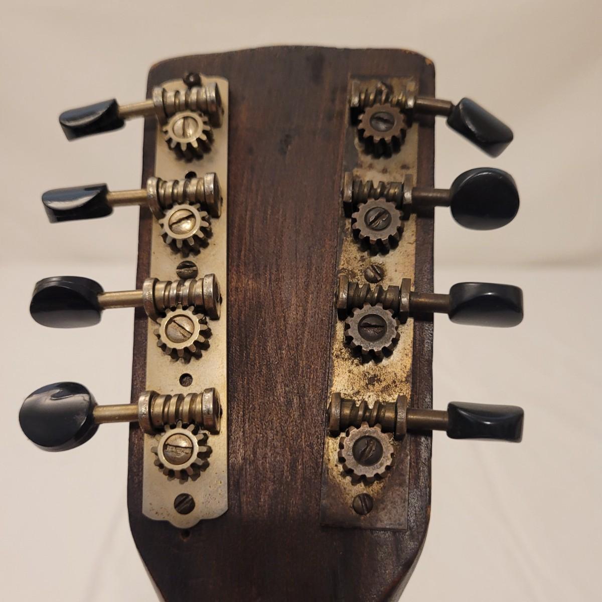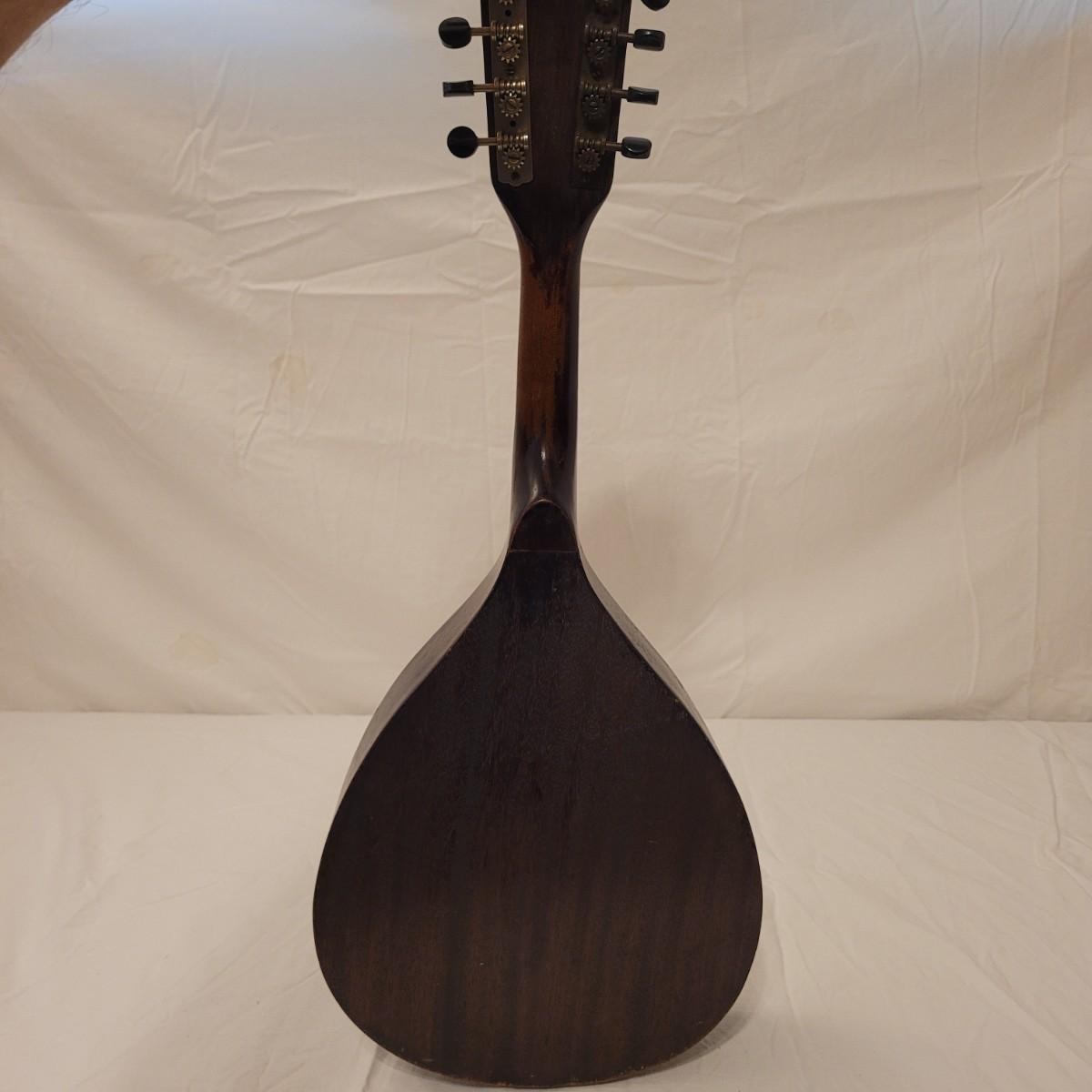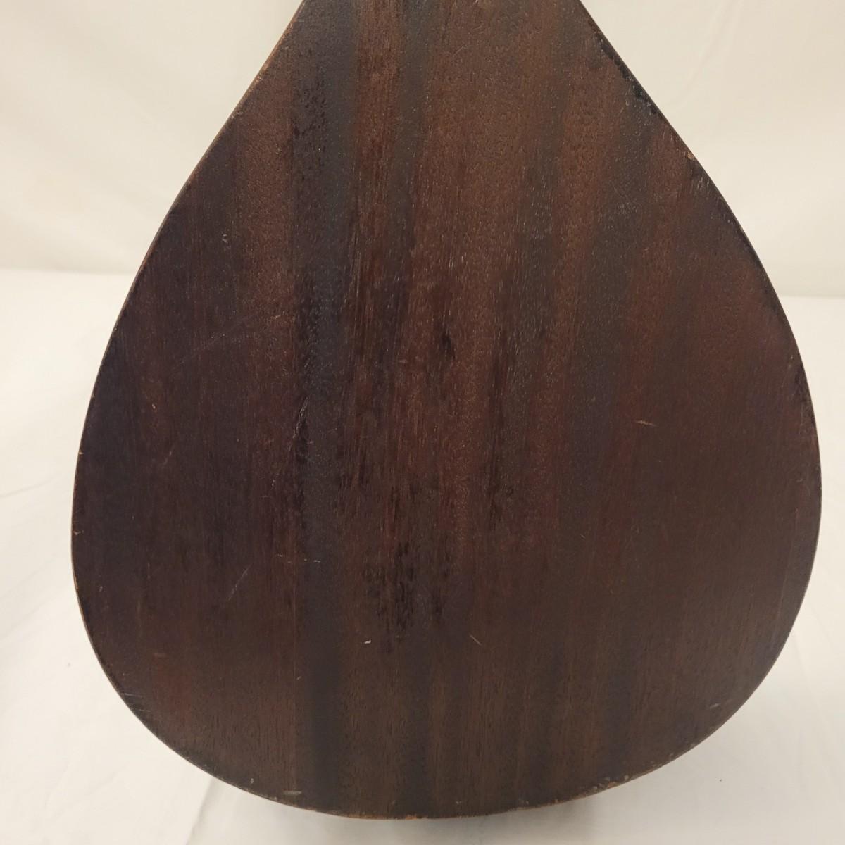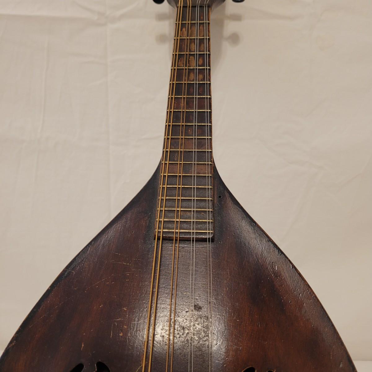This lot includes one wooden mandolin and one vintage self instruction book. The mandolin is made from wood and appears to be vintage. It is still strung and is ready to be tuned and played. There does not appear to be a makers mark or signature anywhere on the instrument. The book is titled "EZ Method for Mandolin" and features songs and instructions for learning to play the mandolin. The instrument measures 10" x 3" x 24"H.