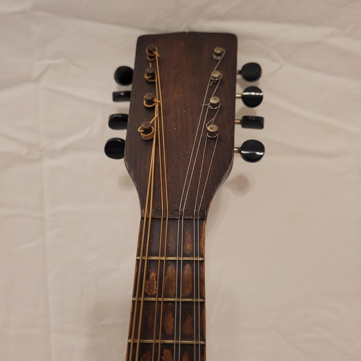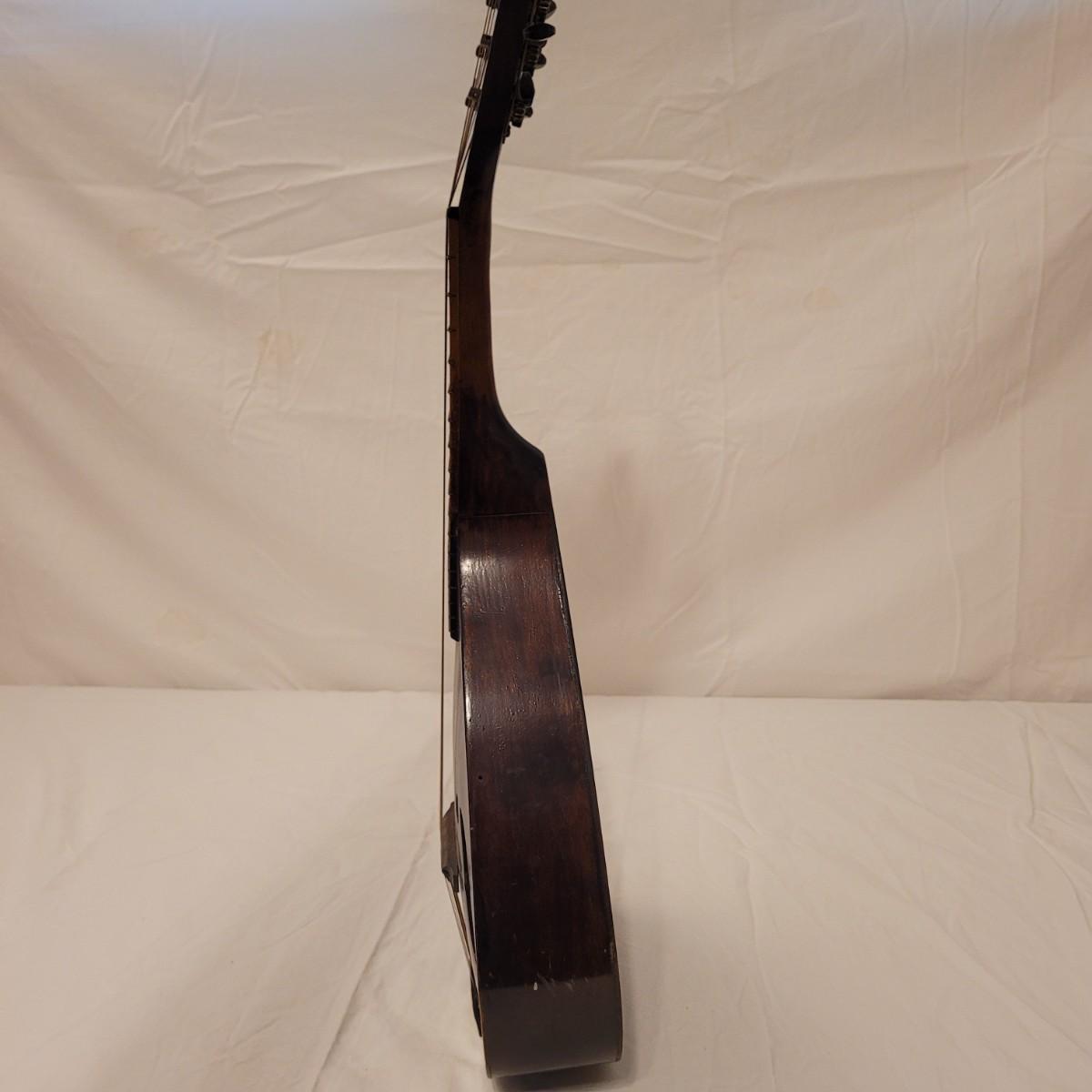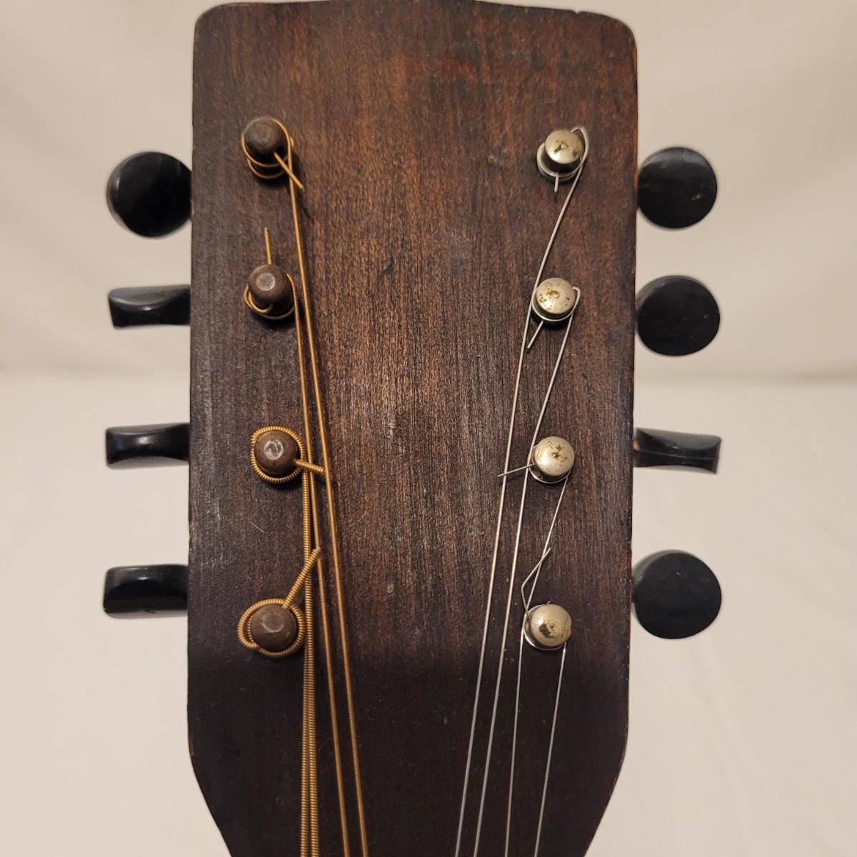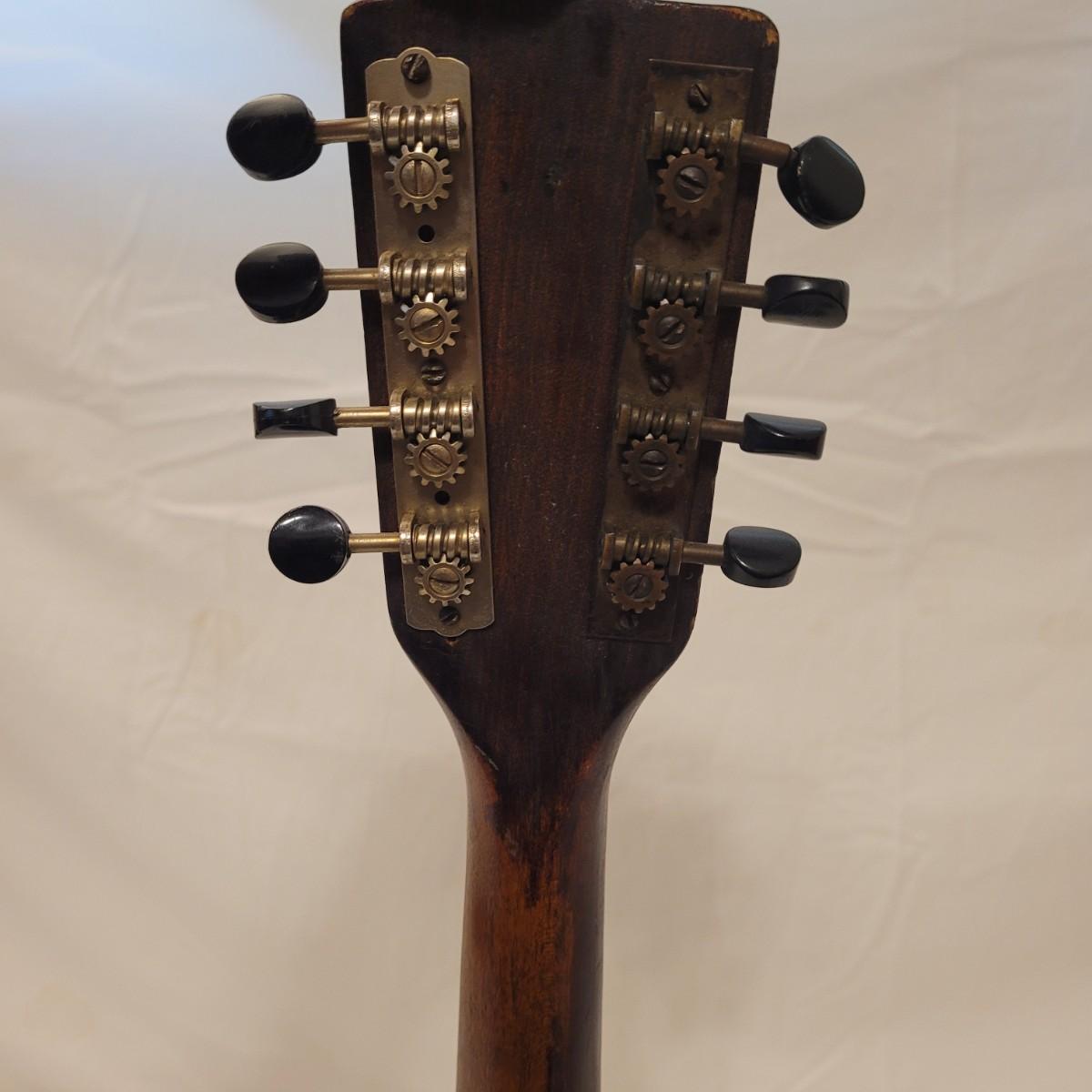 This lot includes one wooden mandolin and one vintage self instruction book. The mandolin is made from wood and appears to be vintage. It is still strung and is ready to be tuned and played. There does not appear to be a makers mark or signature anywhere on the instrument. The book is titled "EZ Method for Mandolin" and features songs and instructions for learning to play the mandolin. The instrument measures 10" x 3" x 24"H.