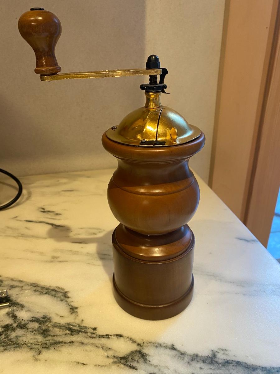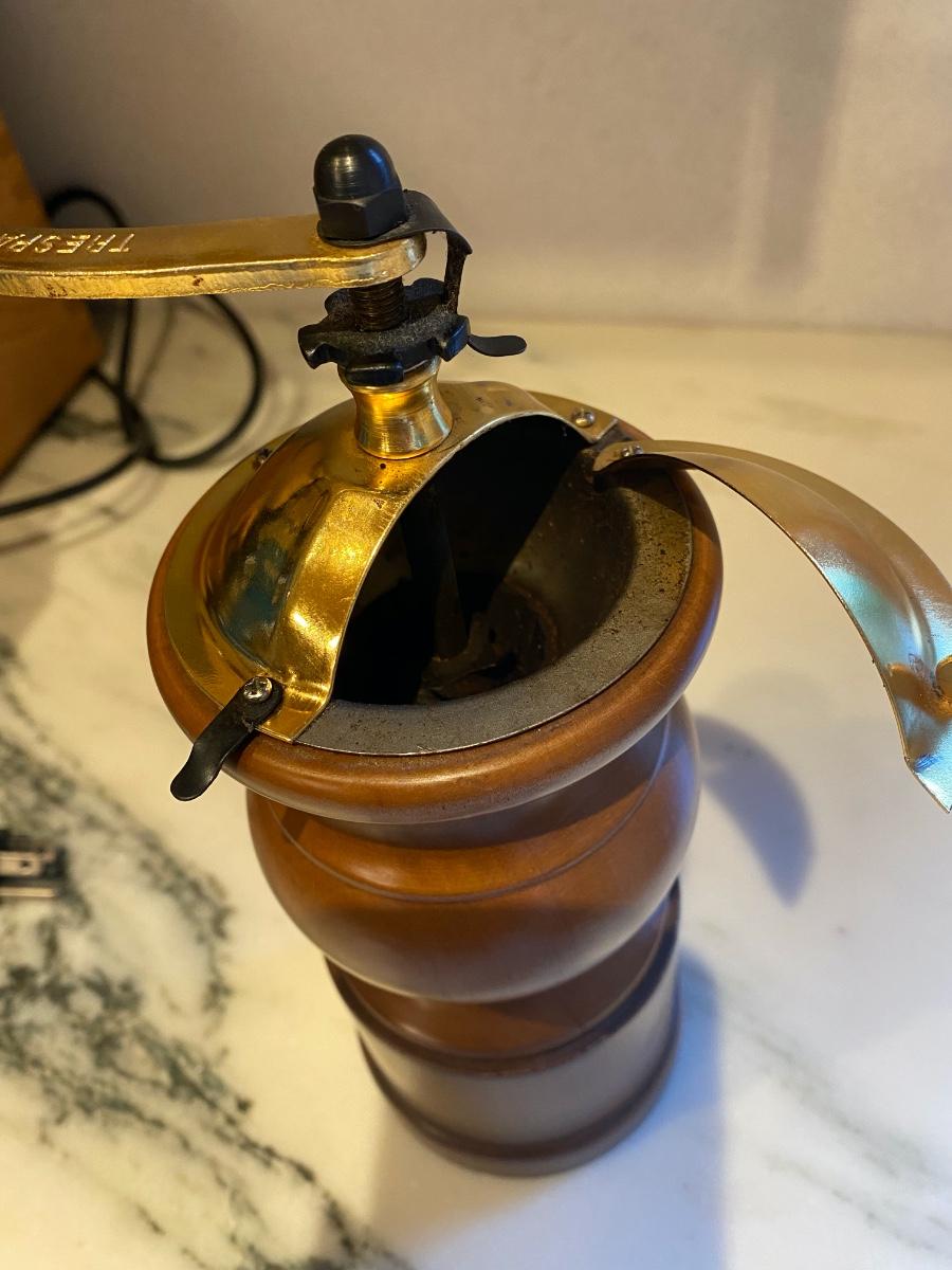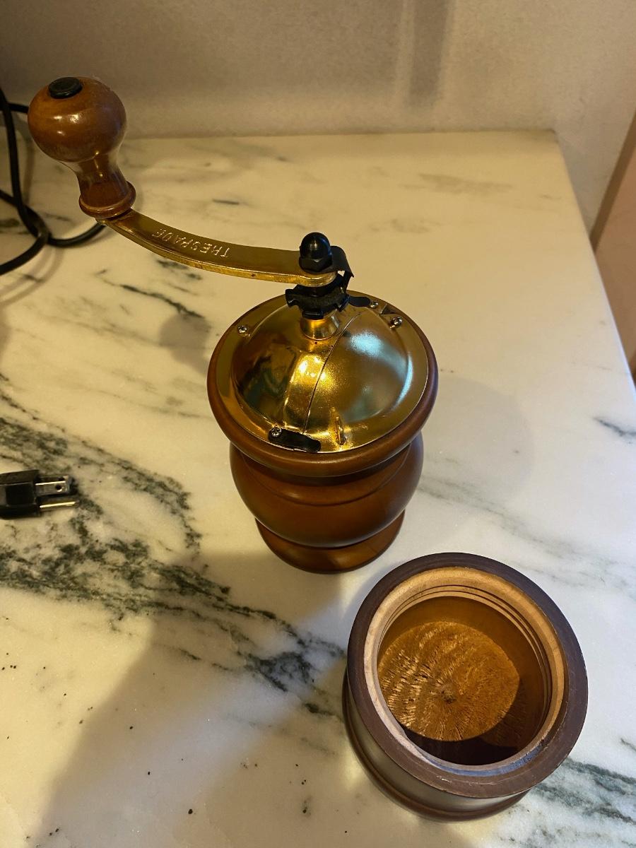 Made in Italy handmade coffee grinder with cast iron millstones and brass handle. Grinds coffee perfect for a French press. Put the beans in the top and grinds are stored in a screw off canister on the bottom. Looks great on the counter too.