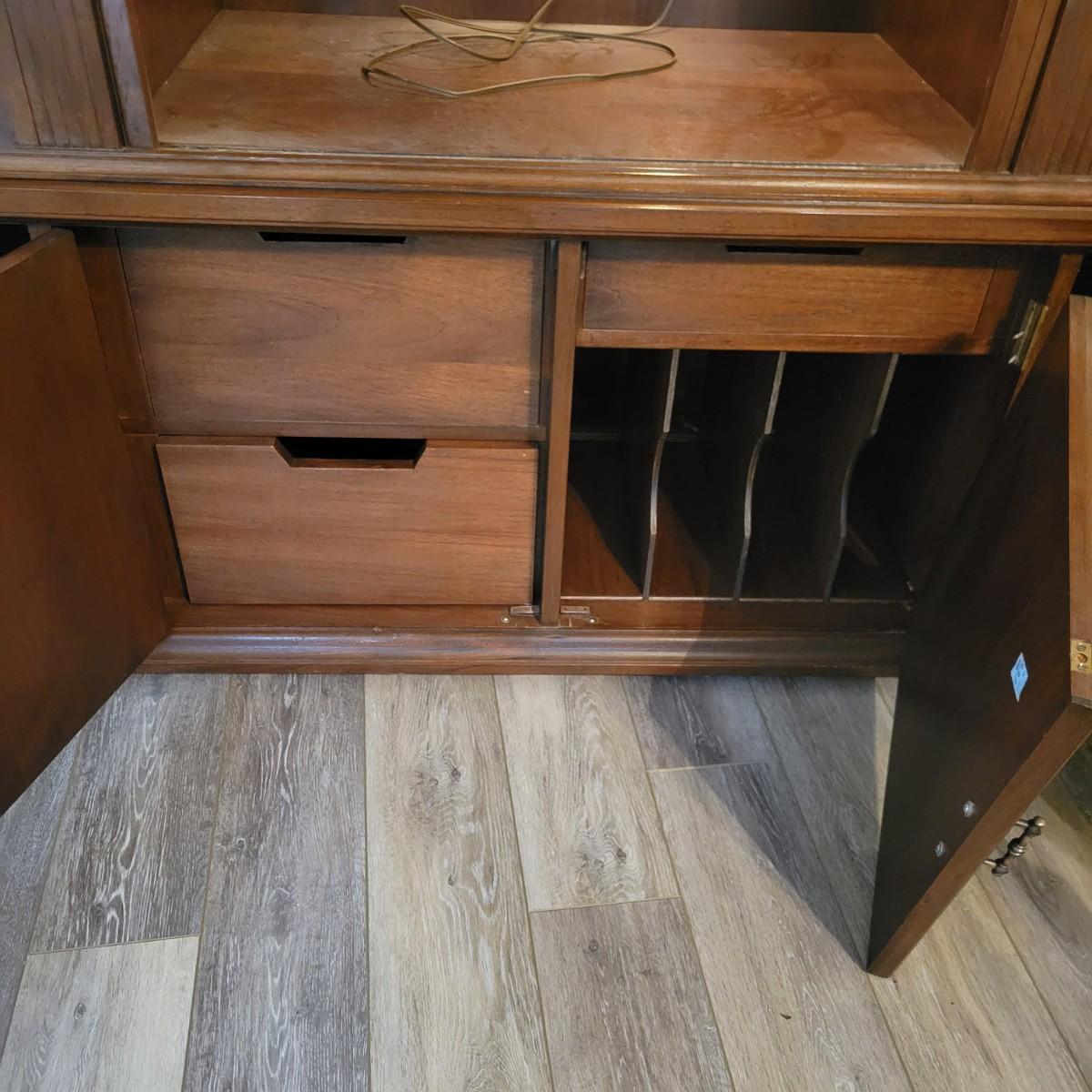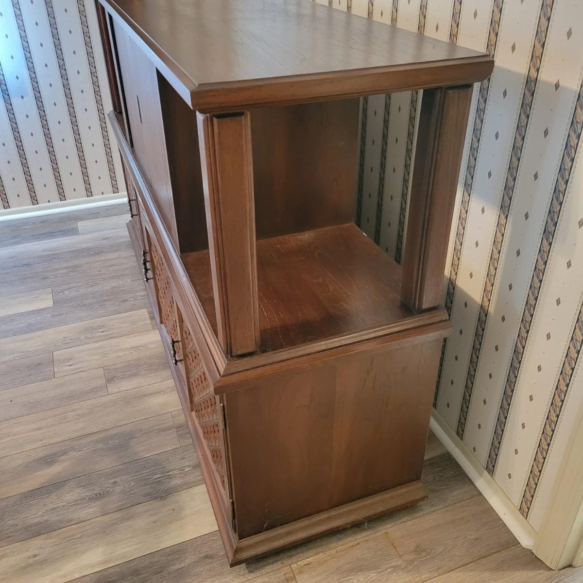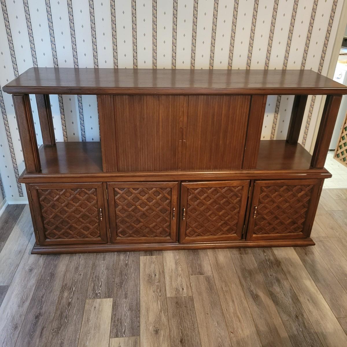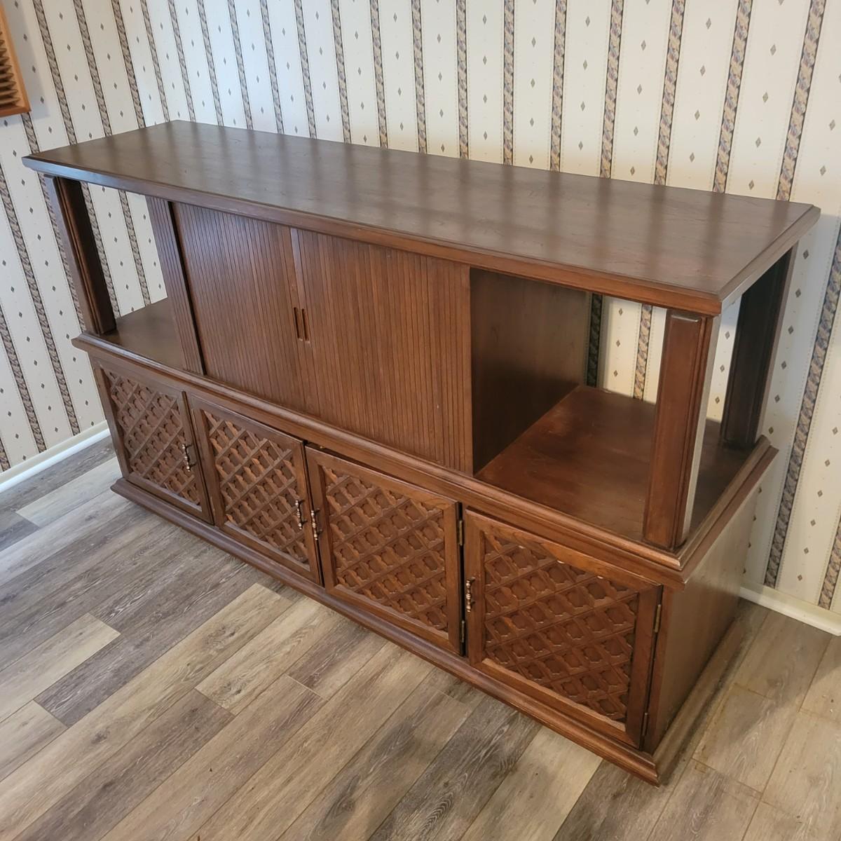 A solid wood, mid century modern credenza that separates into two separate pieces. It features a lighted cabinet with tambour doors. The lower cabinet has four doors that open to a variety of storage options that includes multiple dovetailed drawers. Stacked, this piece measures approximately 73" x 20" x 43"H. One cabinet door does need a hinge reattached. Local pickup only. Winning bidder must bring assistance to help move and load this item due to its weight and/or size.
