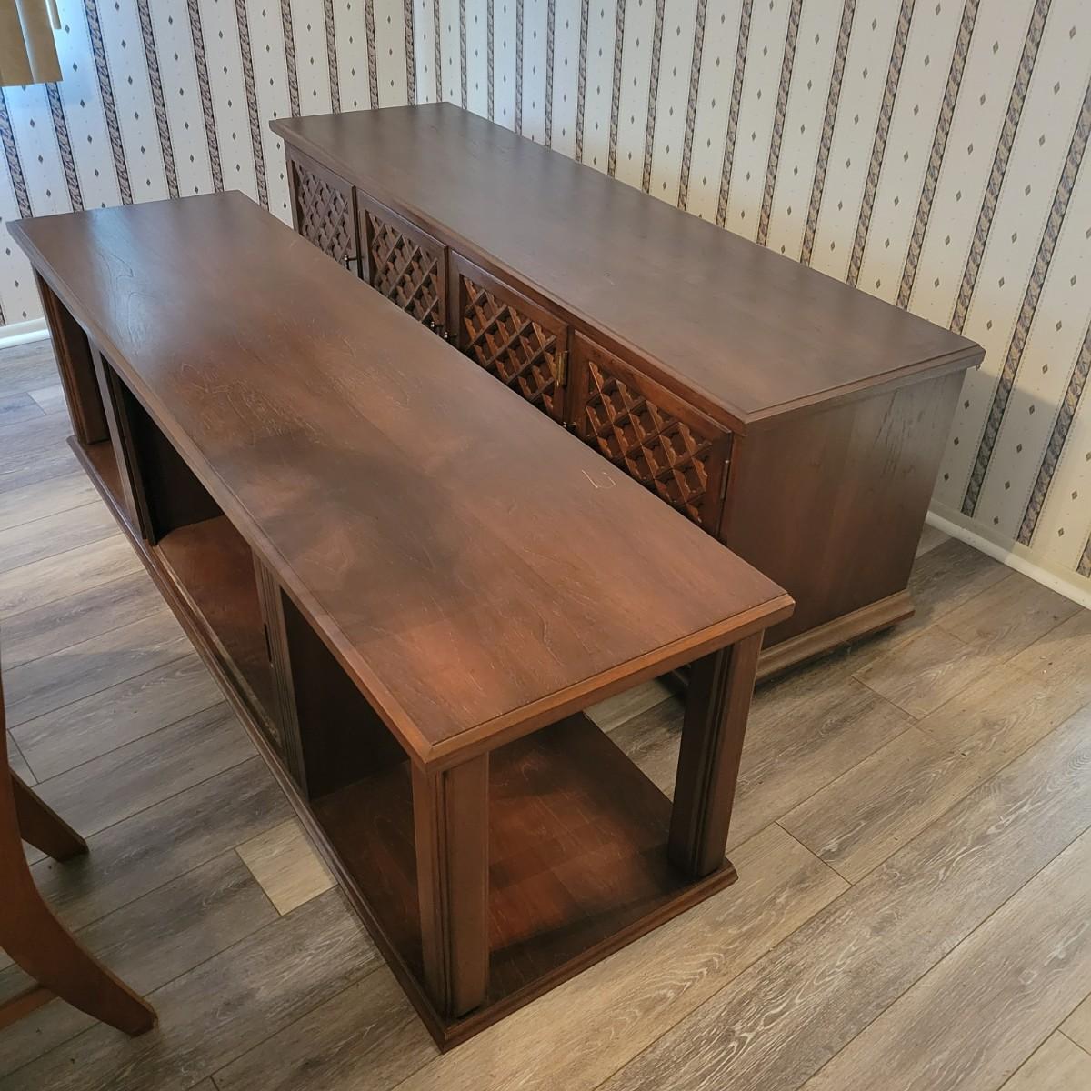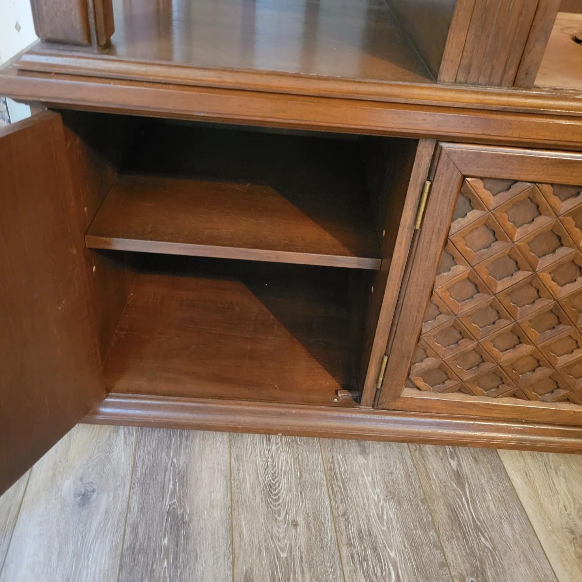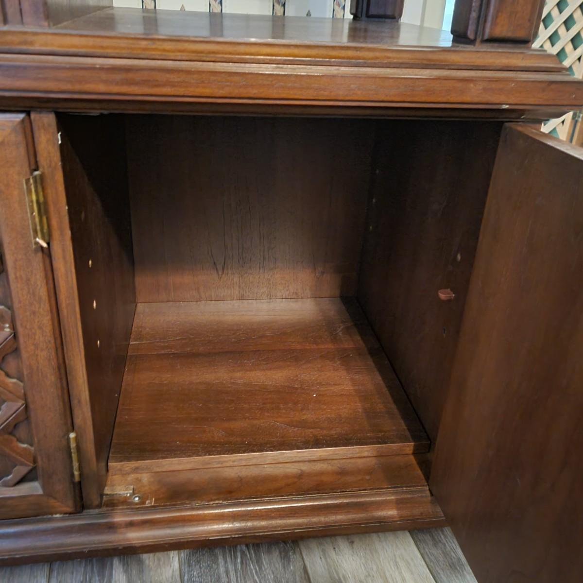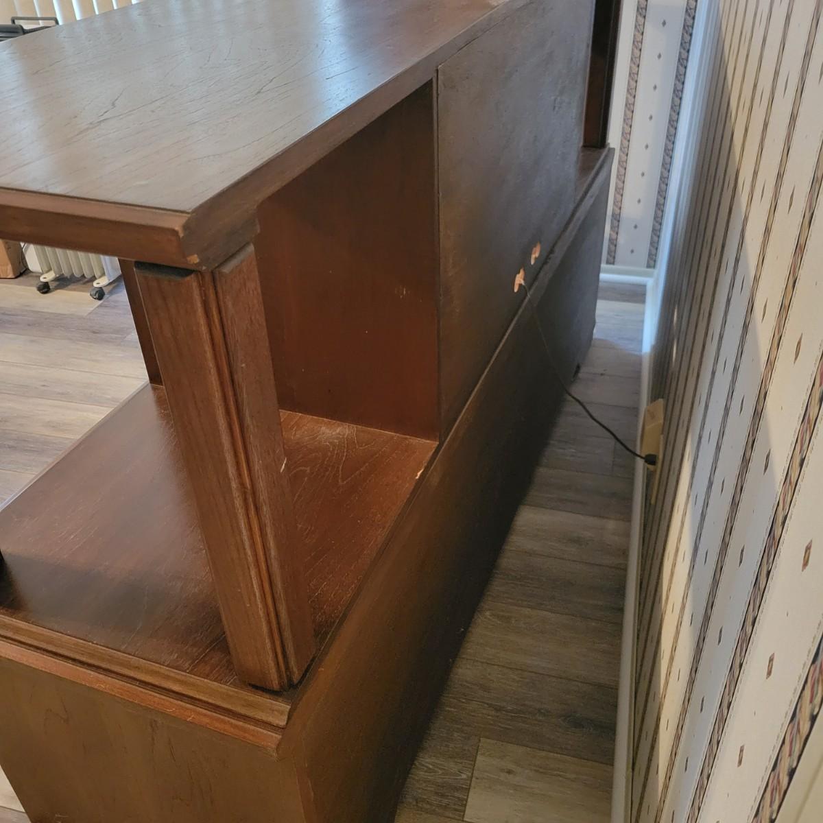 A solid wood, mid century modern credenza that separates into two separate pieces. It features a lighted cabinet with tambour doors. The lower cabinet has four doors that open to a variety of storage options that includes multiple dovetailed drawers. Stacked, this piece measures approximately 73" x 20" x 43"H. One cabinet door does need a hinge reattached. Local pickup only. Winning bidder must bring assistance to help move and load this item due to its weight and/or size.