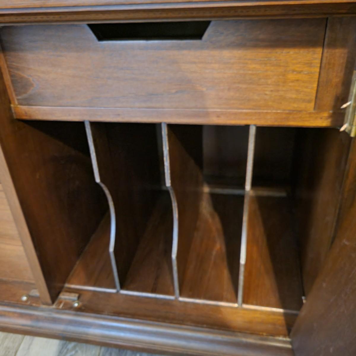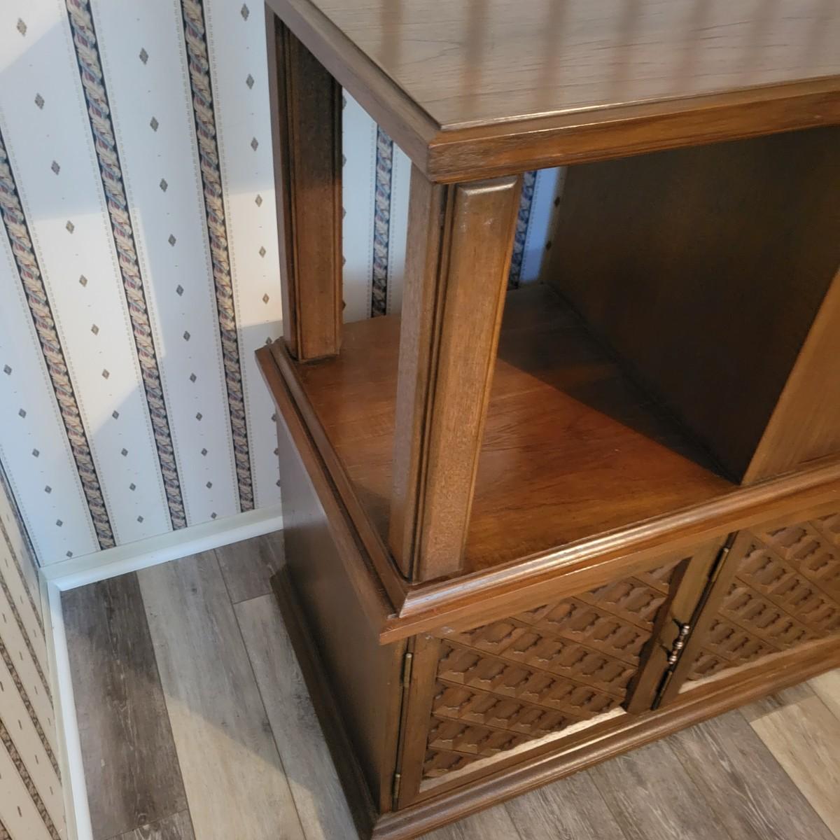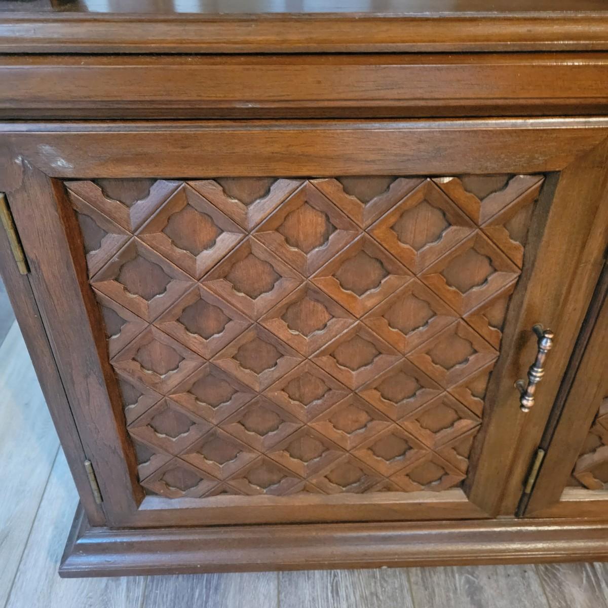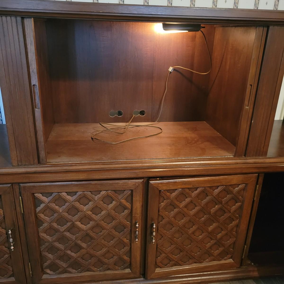 A solid wood, mid century modern credenza that separates into two separate pieces. It features a lighted cabinet with tambour doors. The lower cabinet has four doors that open to a variety of storage options that includes multiple dovetailed drawers. Stacked, this piece measures approximately 73" x 20" x 43"H. One cabinet door does need a hinge reattached. Local pickup only. Winning bidder must bring assistance to help move and load this item due to its weight and/or size.
