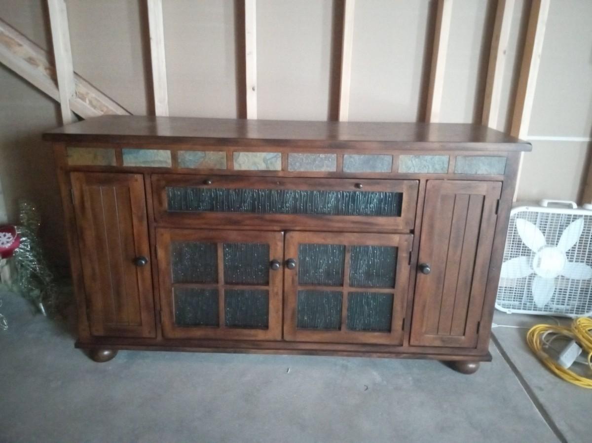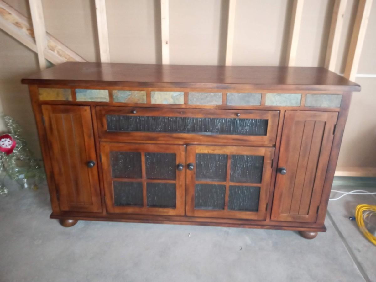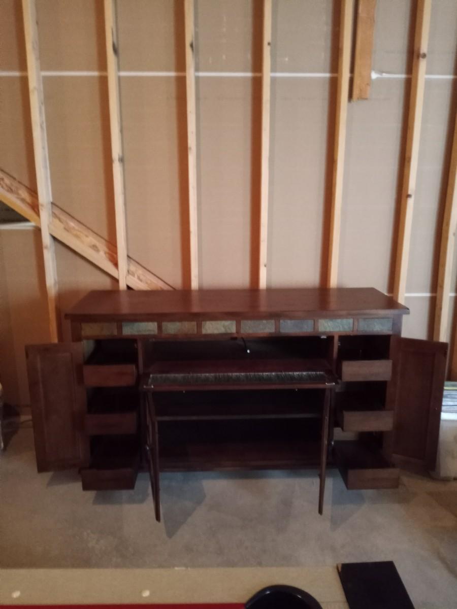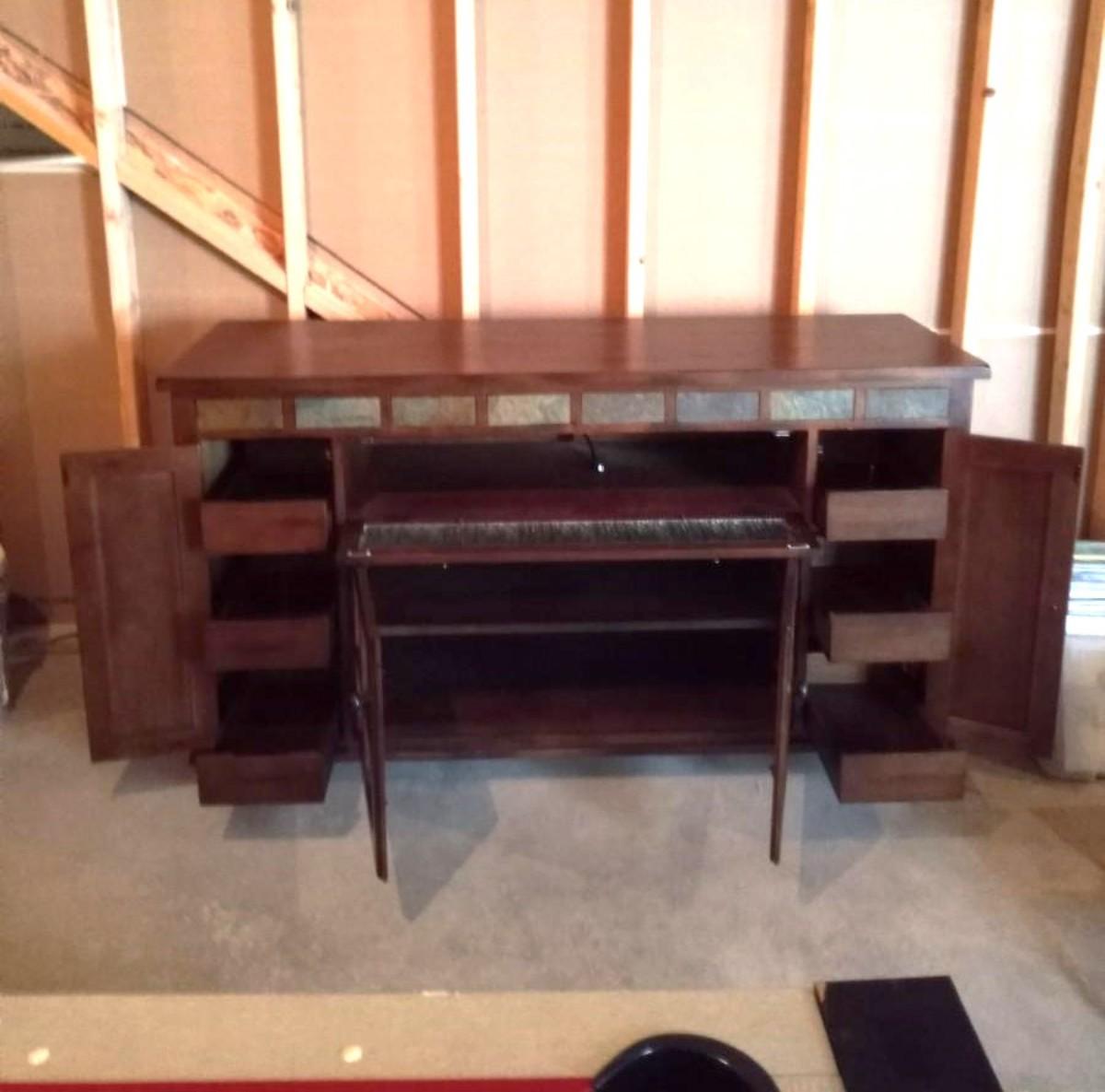 THE 2 SIDE CABINET DOORS OPEN UP TO 3 SLIDE OUT DRAWERS EACH, THE TOP MIDDLE DOOR PULLS DOWN TO ACCOMMODATE A CONSOLE, AND THE 2 MIDDLE CABINET DOORS HOUSE A SHELVED AREA