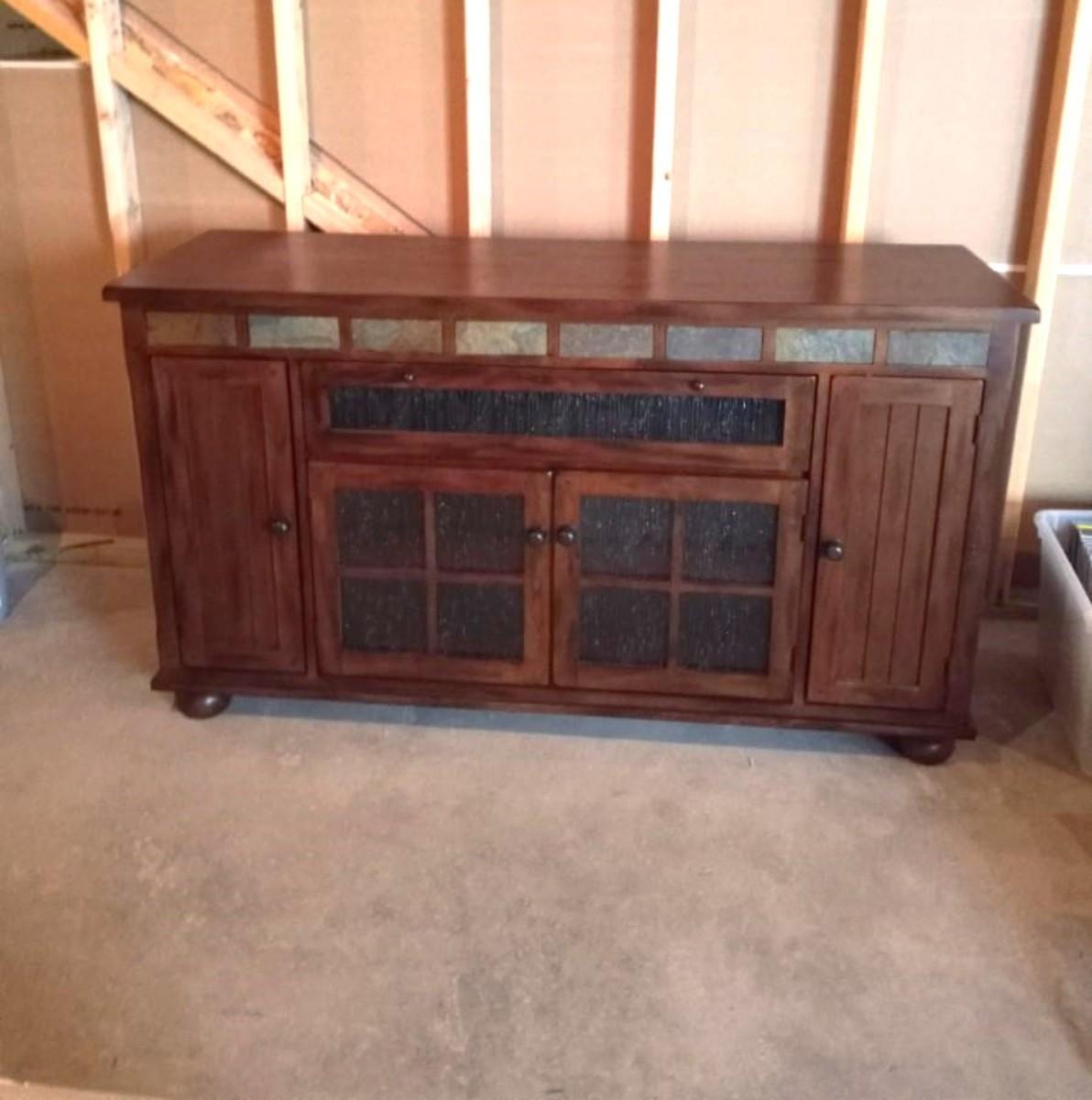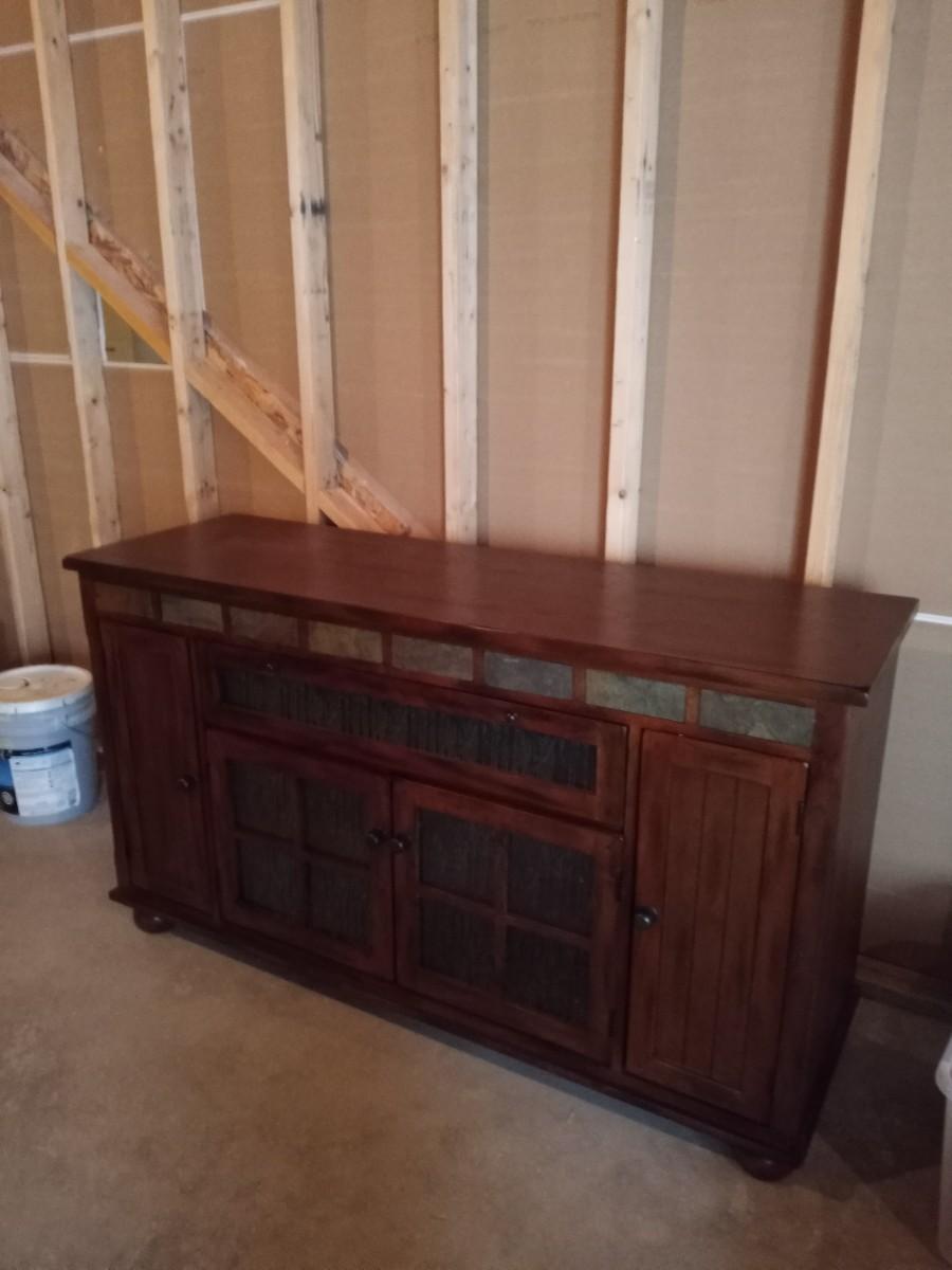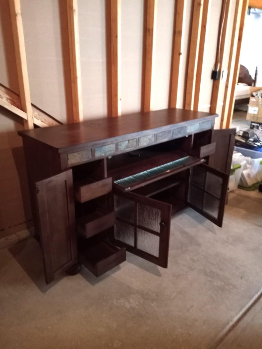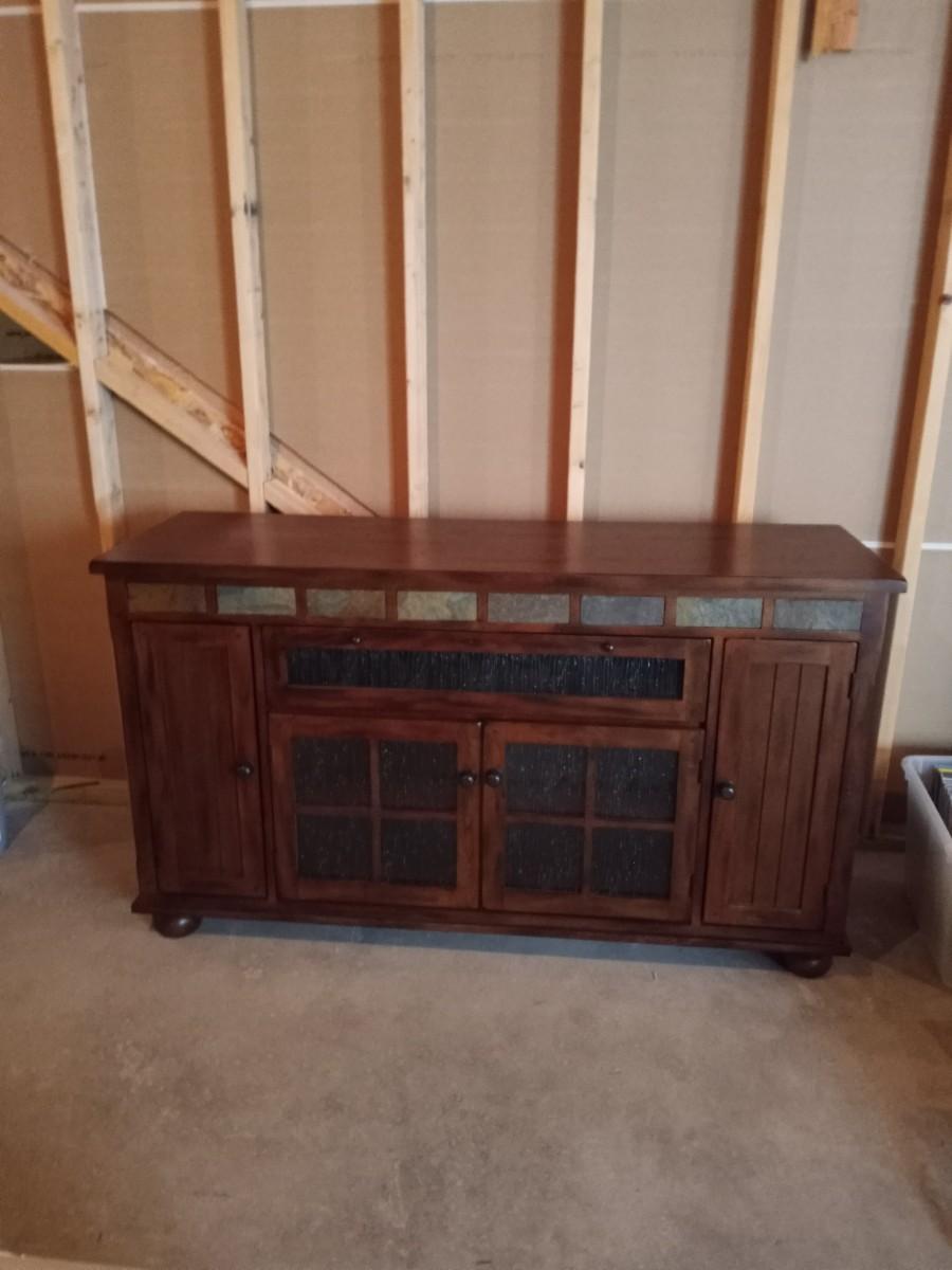 THE 2 SIDE CABINET DOORS OPEN UP TO 3 SLIDE OUT DRAWERS EACH, THE TOP MIDDLE DOOR PULLS DOWN TO ACCOMMODATE A CONSOLE, AND THE 2 MIDDLE CABINET DOORS HOUSE A SHELVED AREA