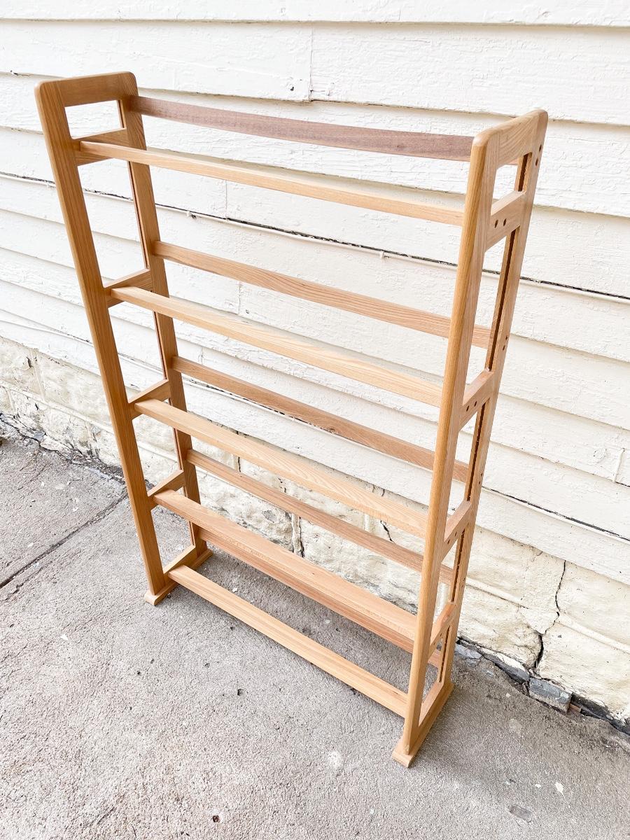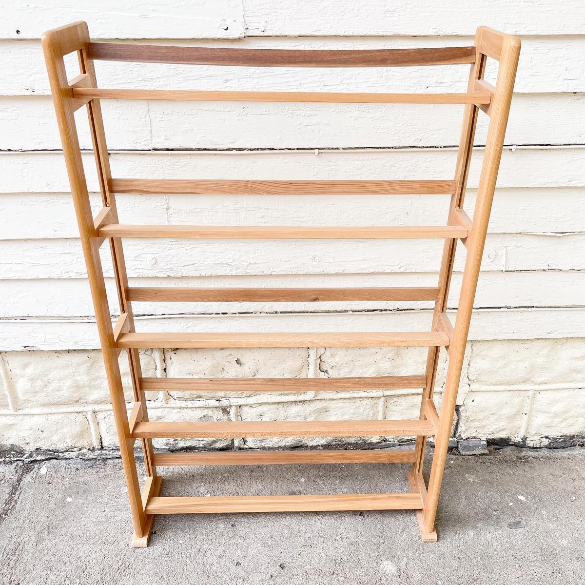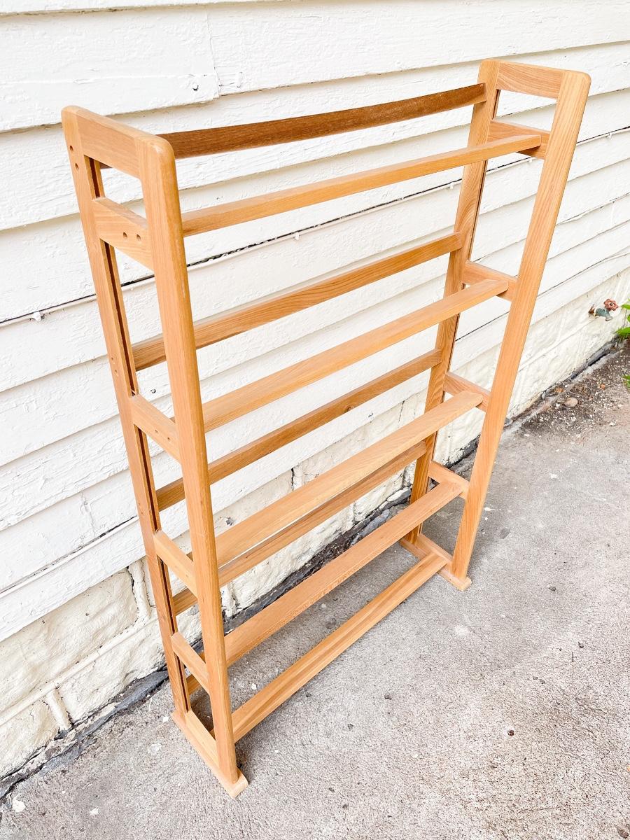 In good solid condition. Great for holdings DVDs and CDs. Measures 29” wide x 8” deep x 46” tall.