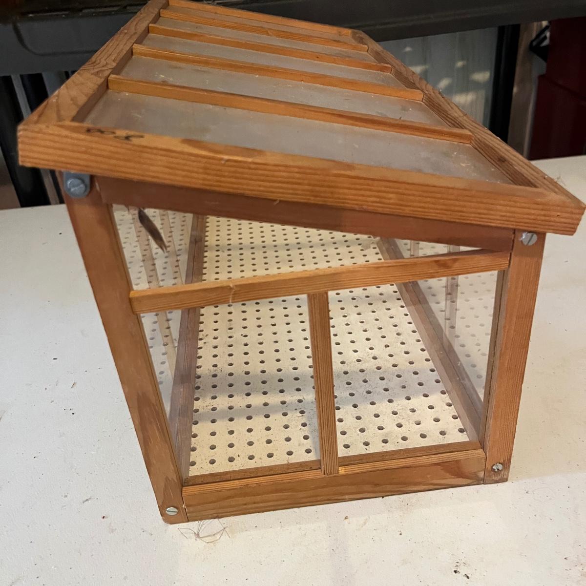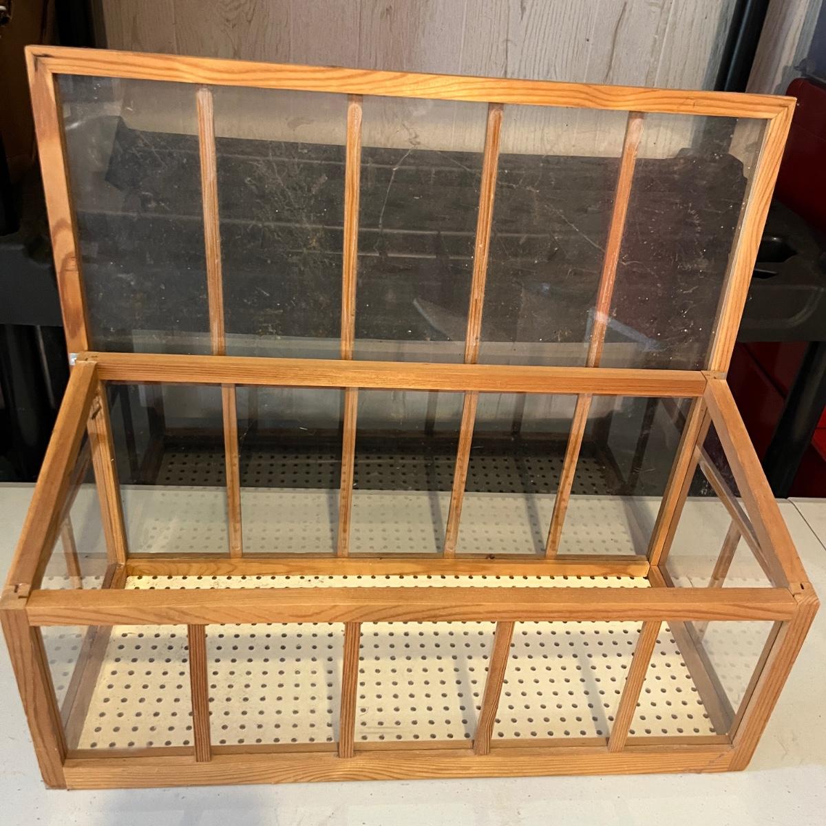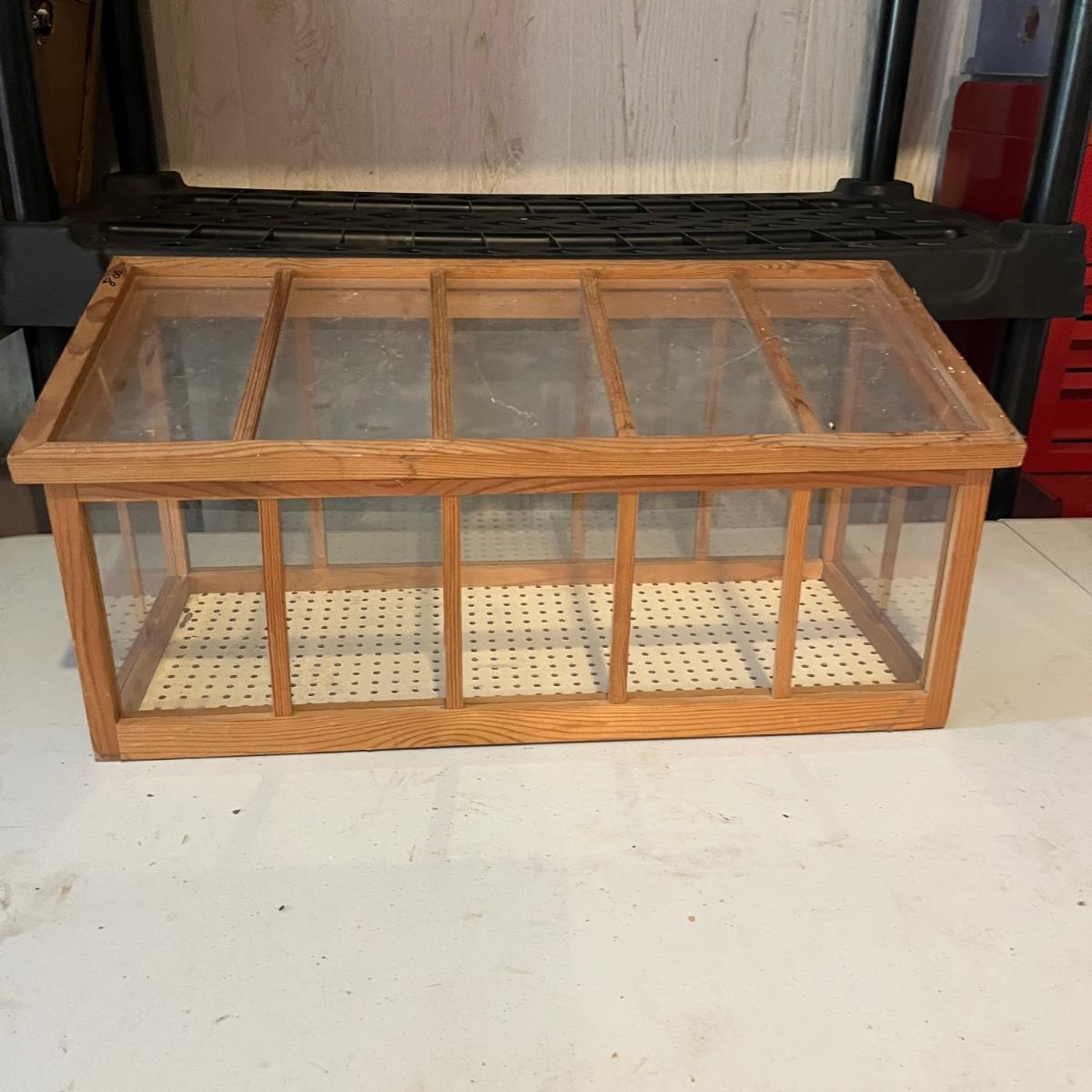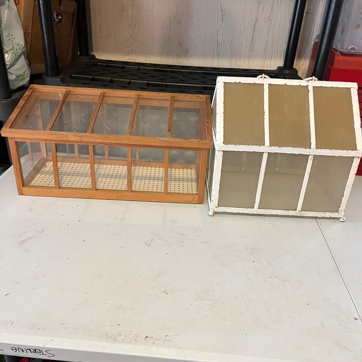 Lot includes a wooden framed terrarium with clear plastic inside frame and a metal terrarium with plastic inside frame. Wooden terrarium measures 20.5” x 9.5” x 10”H.