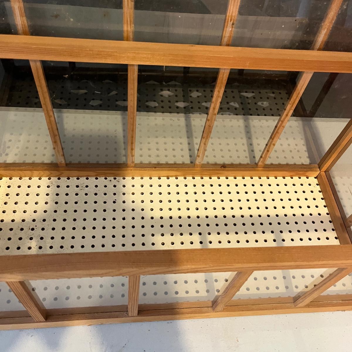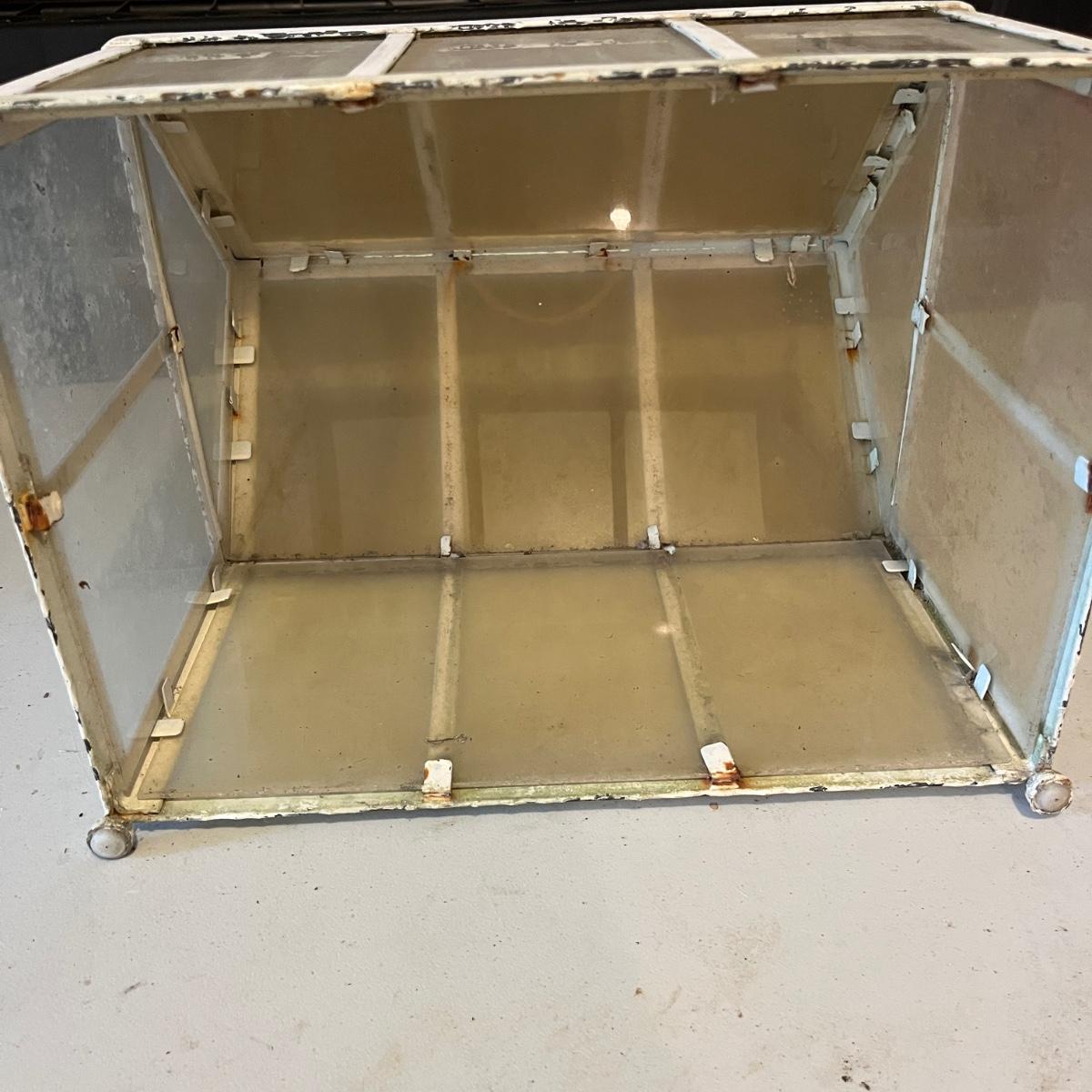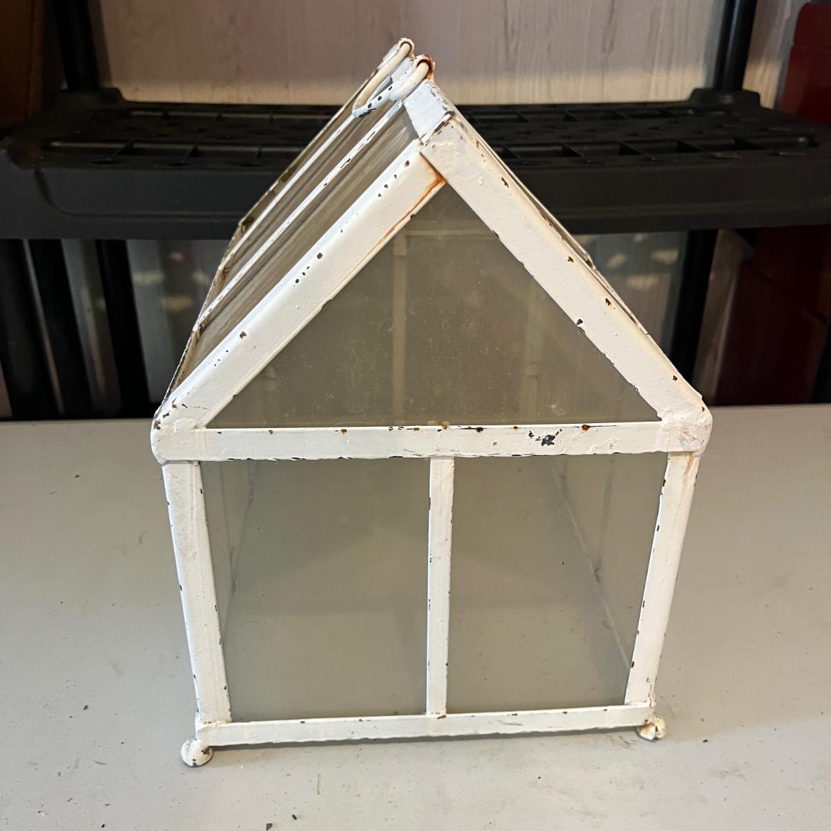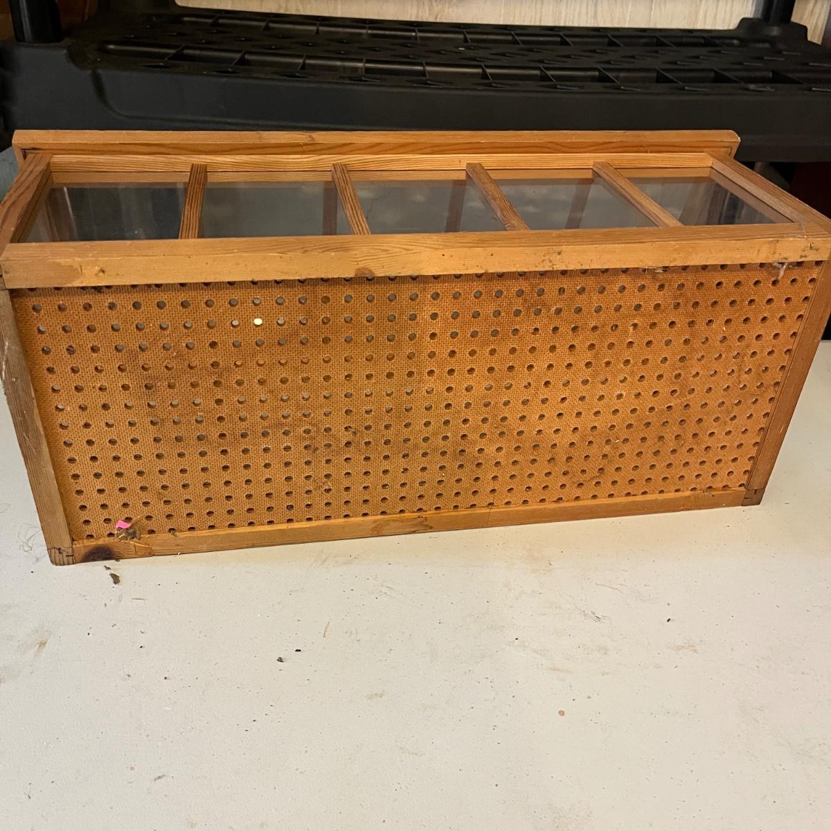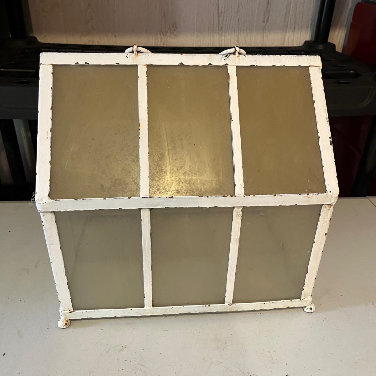 Lot includes a wooden framed terrarium with clear plastic inside frame and a metal terrarium with plastic inside frame. Wooden terrarium measures 20.5” x 9.5” x 10”H.