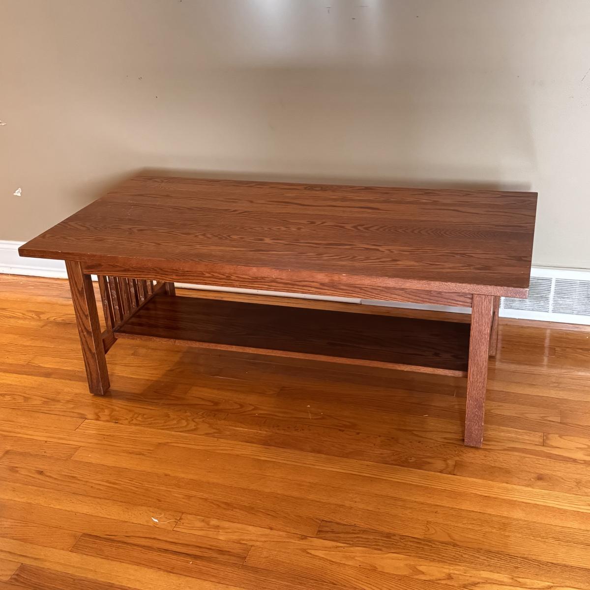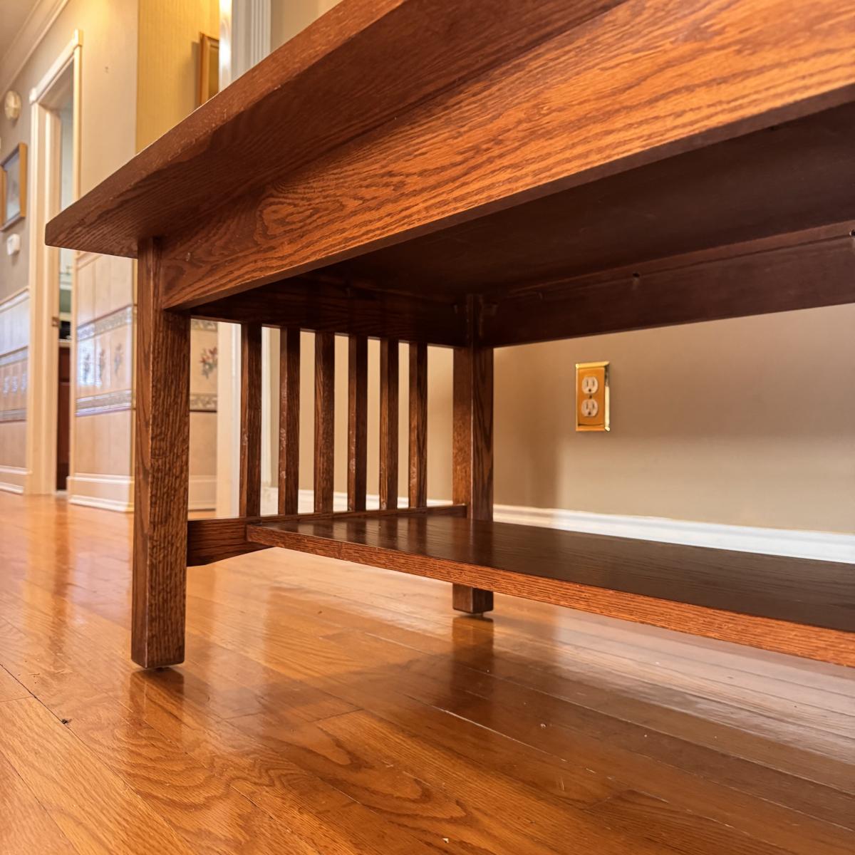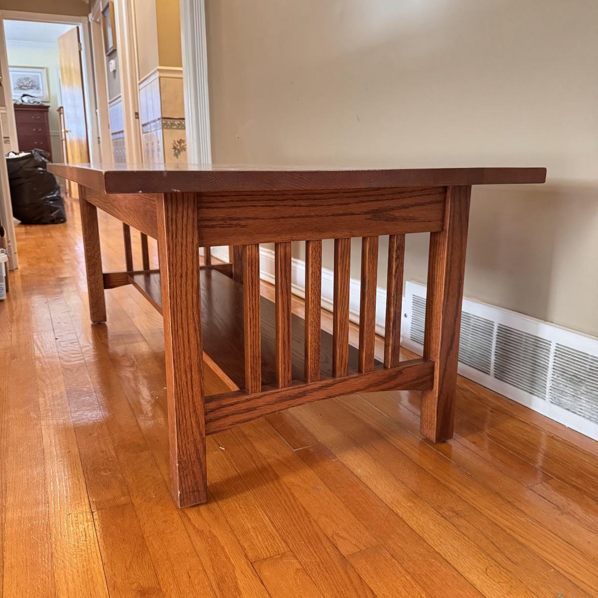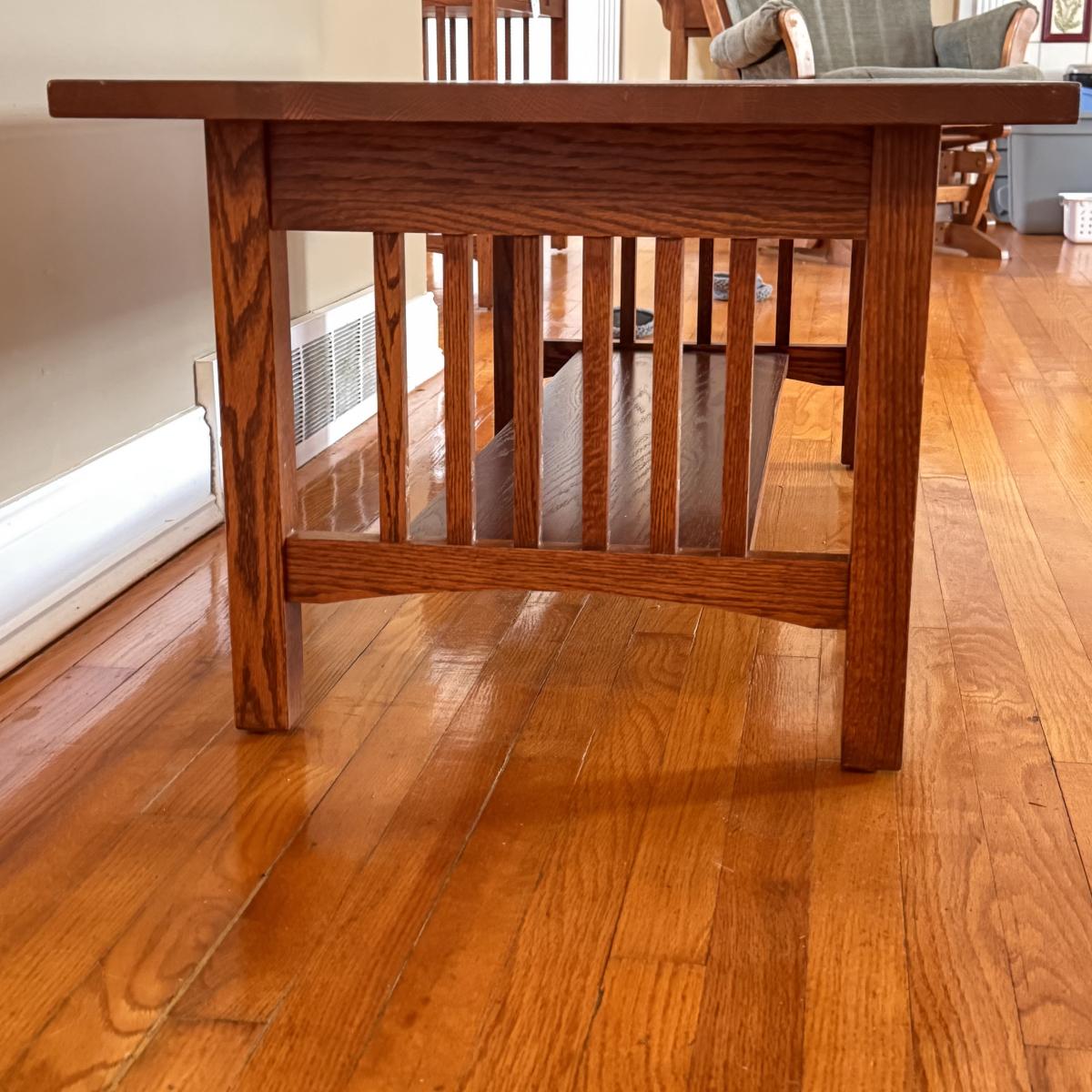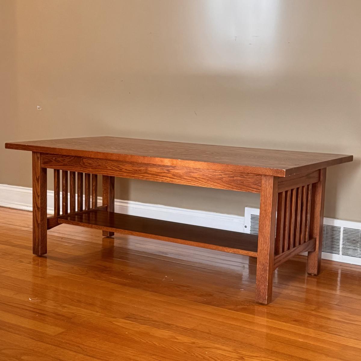 Lot includes one solid wooden mission style coffee table that is in great condition. No maker's mark was found. The coffee table measures 50” x 26” x 19”H. Local pickup only. Winning bidder must bring assistance to help move and load this item due to its weight and/or size.