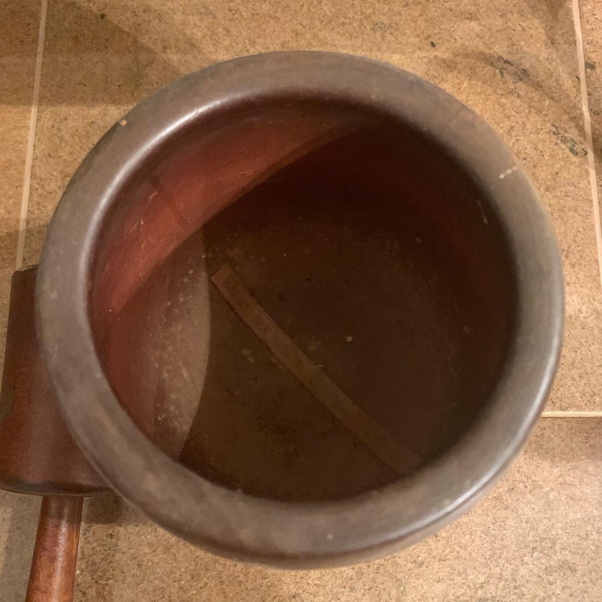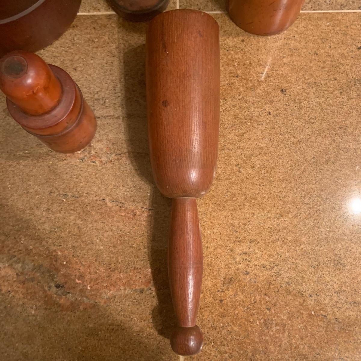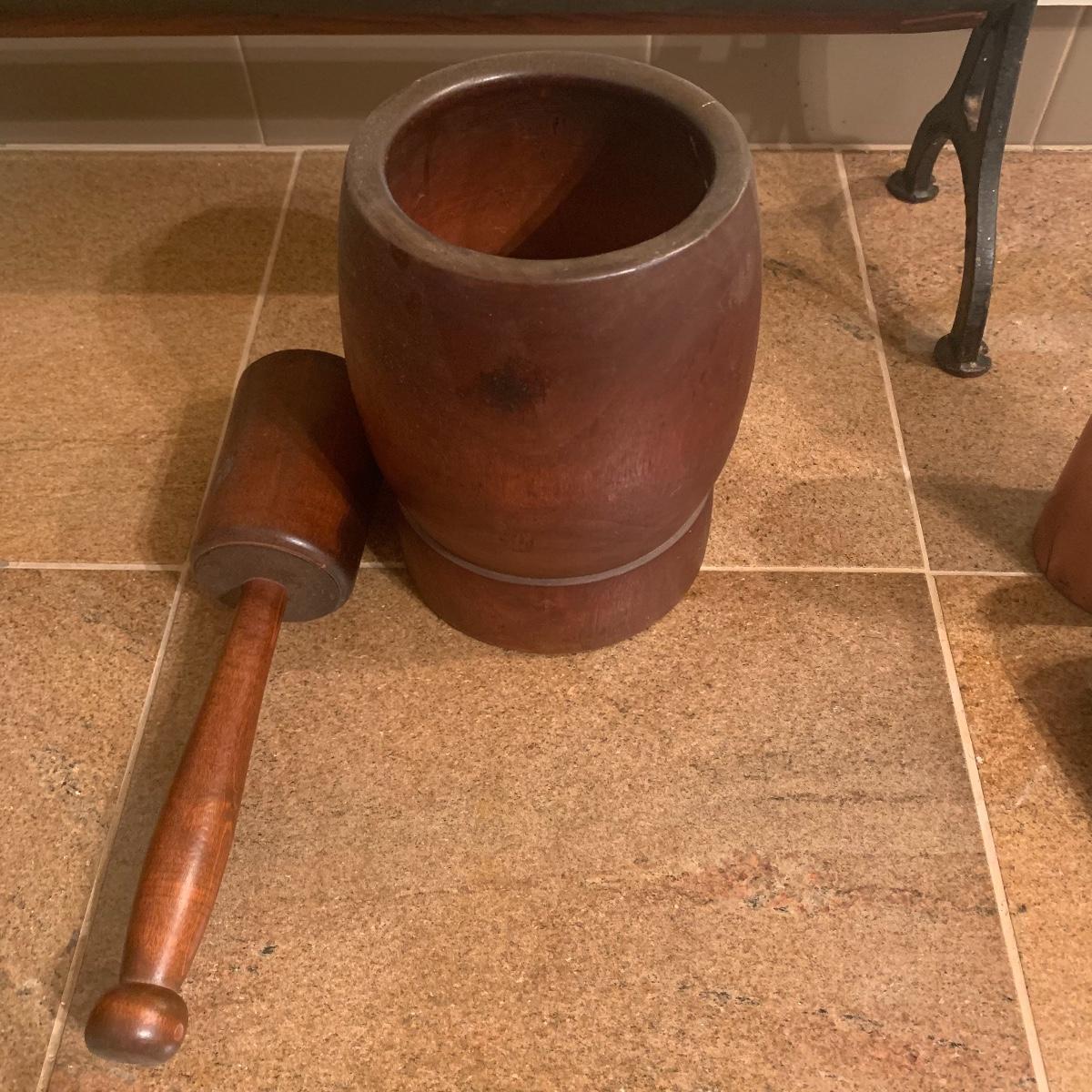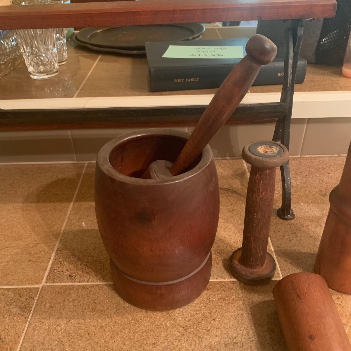 This lot includes a wooden mortar and pestle ( set stands 12”) Two mortars are included. All items are in good condition