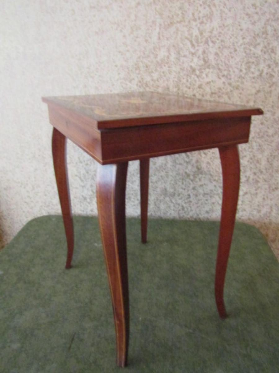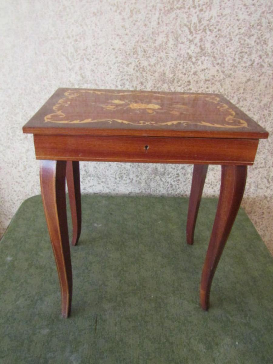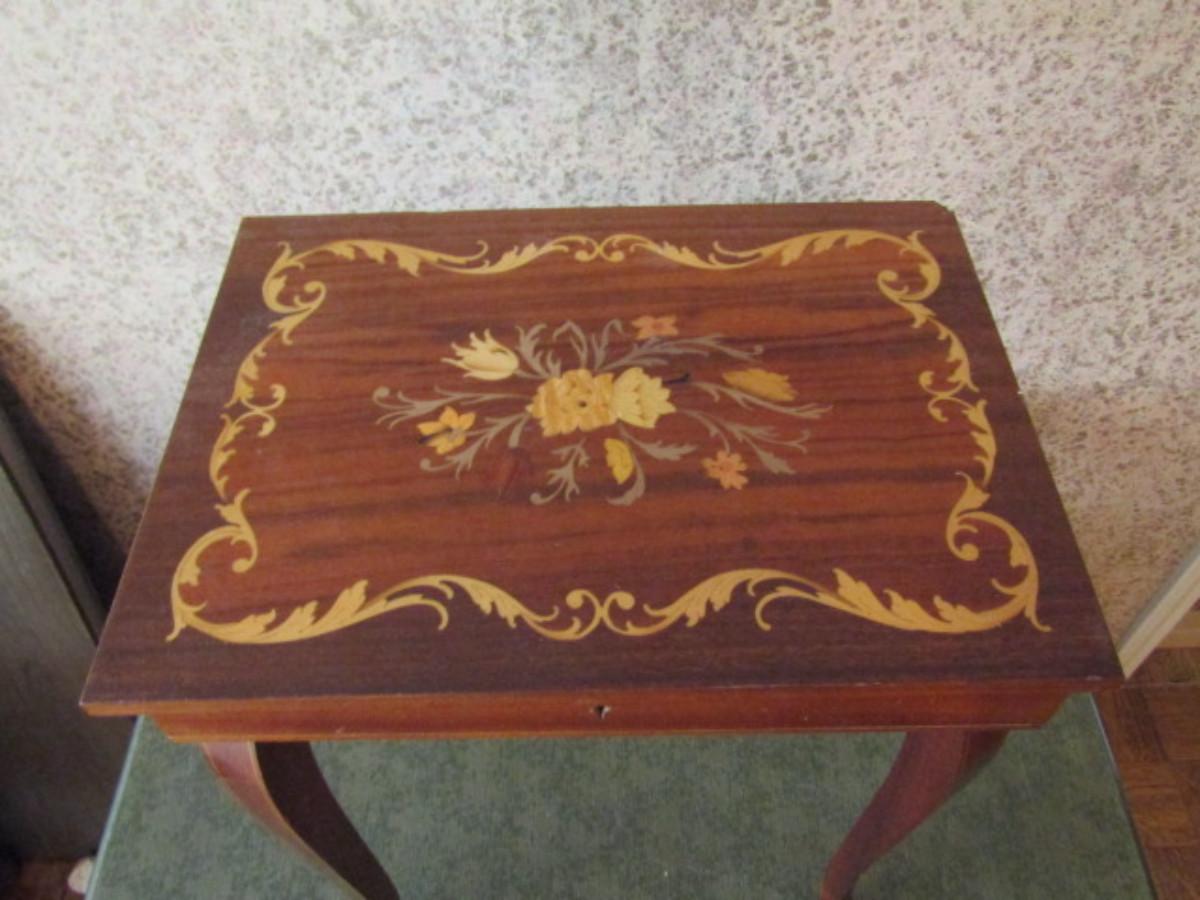 Wooden Music Box Table- Needs Repair. Does not play. Legs need tightening. Please see all pictures- corner is chipped.