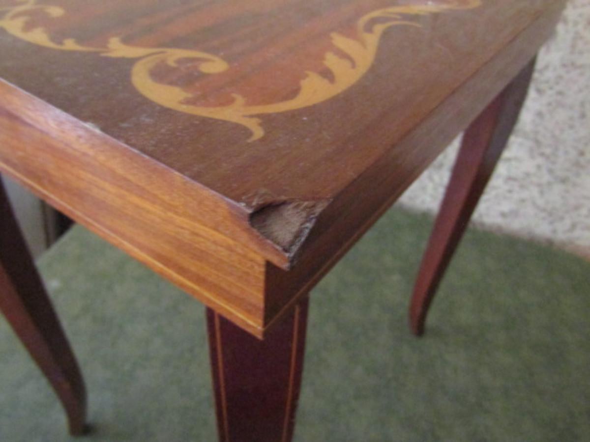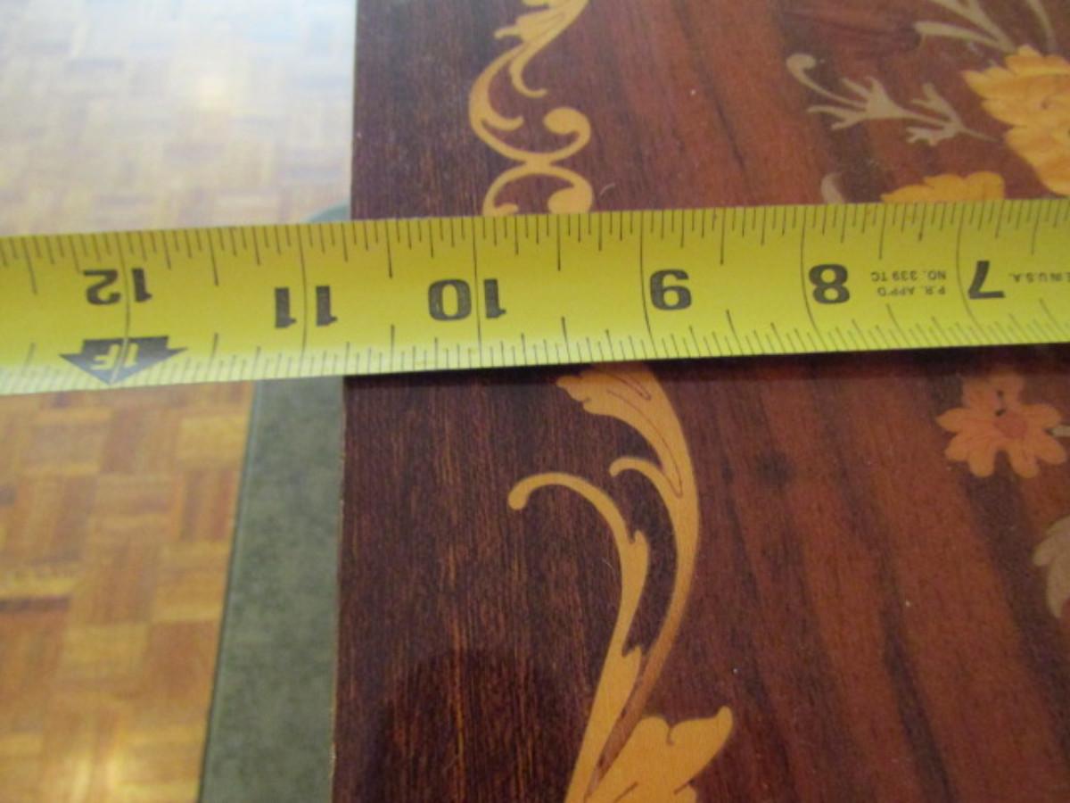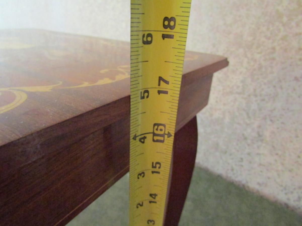 Wooden Music Box Table- Needs Repair. Does not play. Legs need tightening. Please see all pictures- corner is chipped.