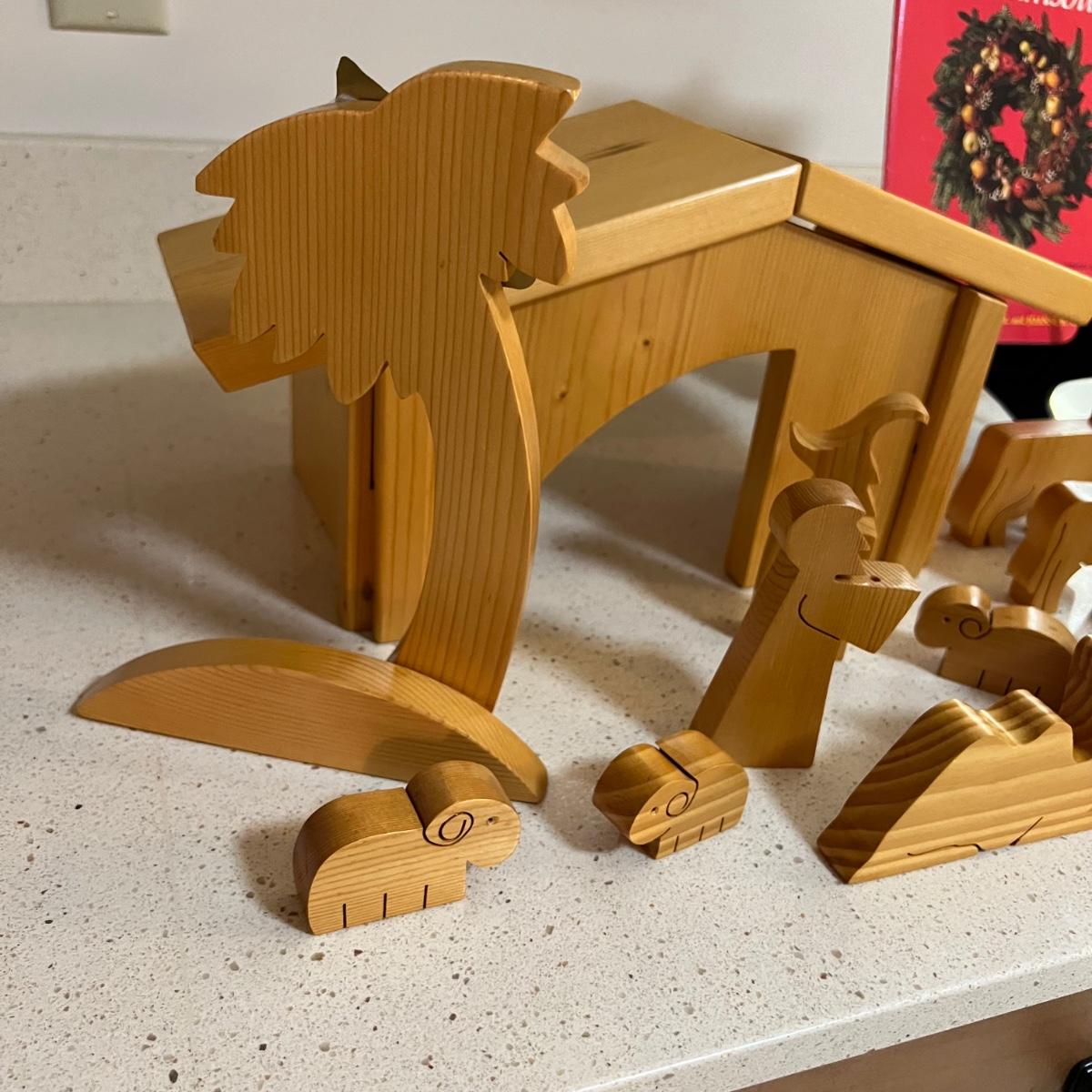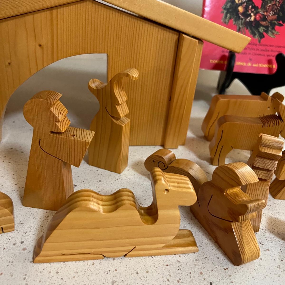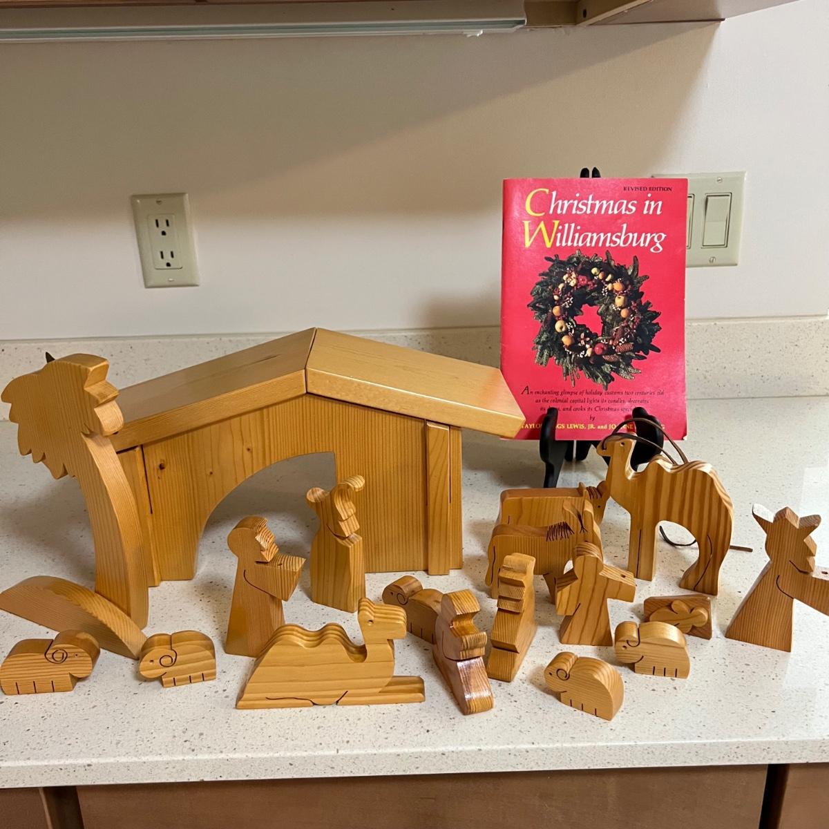Wooden nativity set. The manger disassembles (see photo). Also includes Christmas in Williamsburg book. Manger measures approximately 15" x 7" x 7"H.