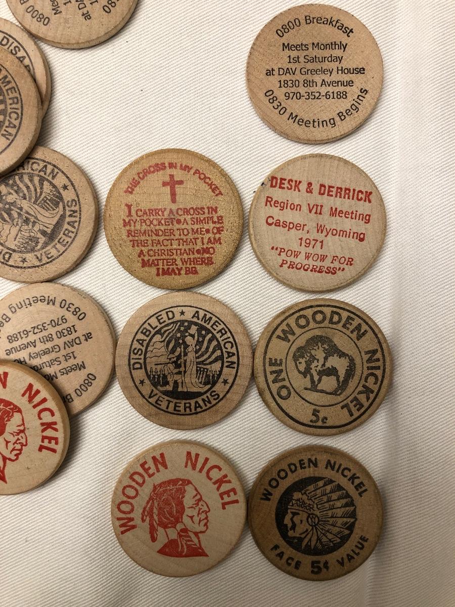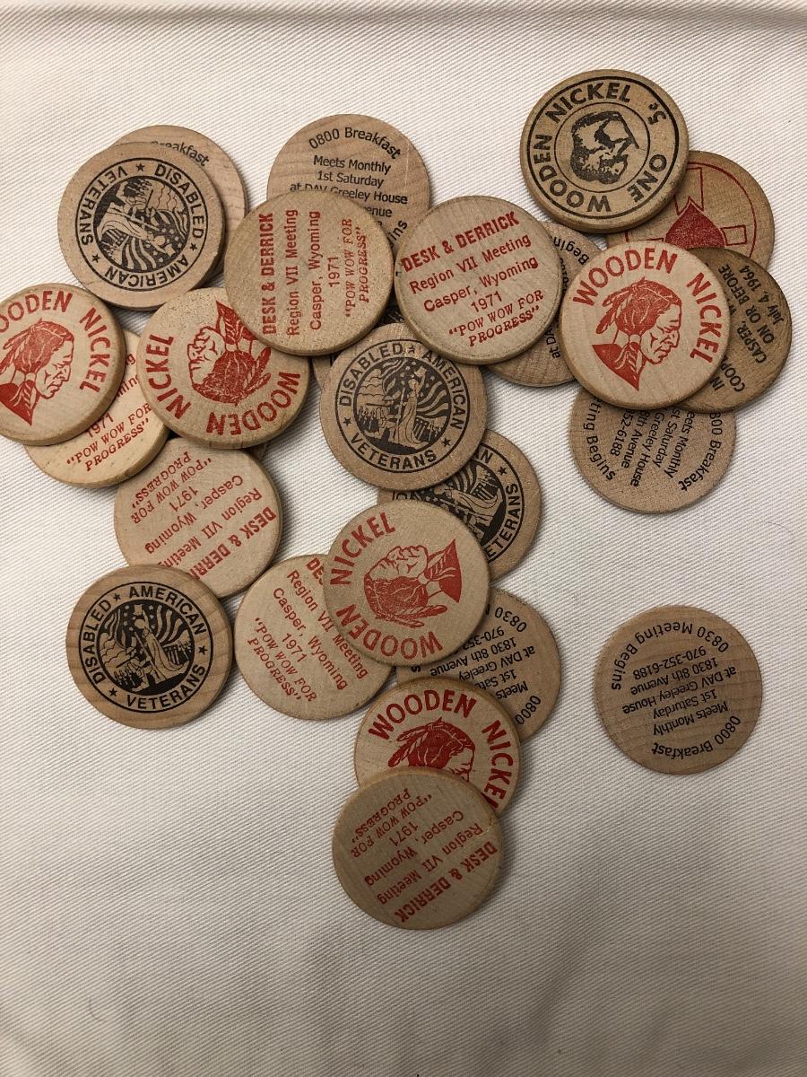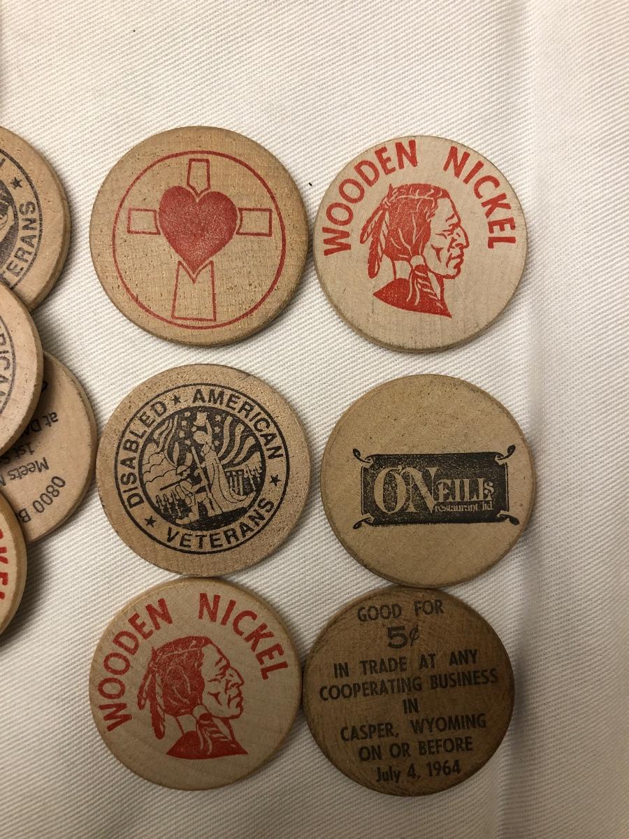 A nice selection and variety of wooden nickels from Colorado and Wyoming. 1960s and 70s.