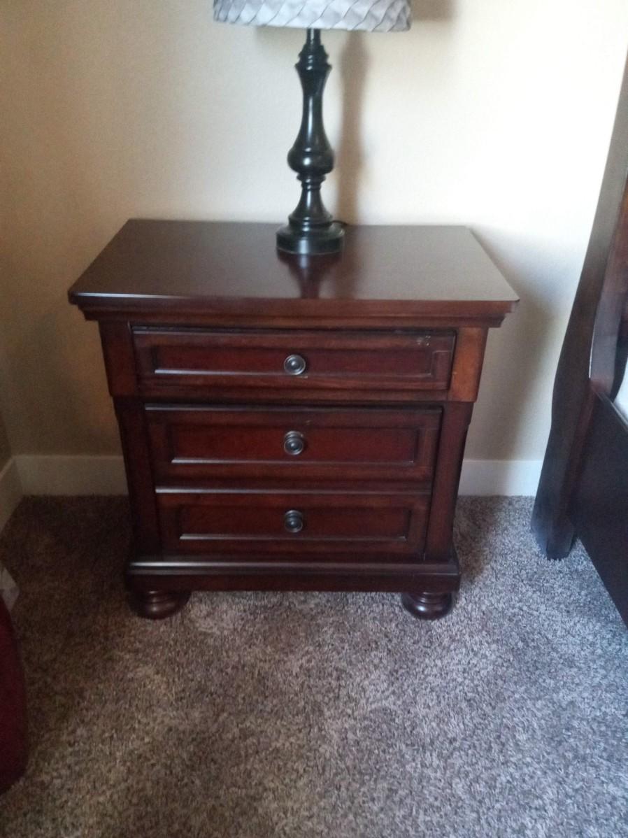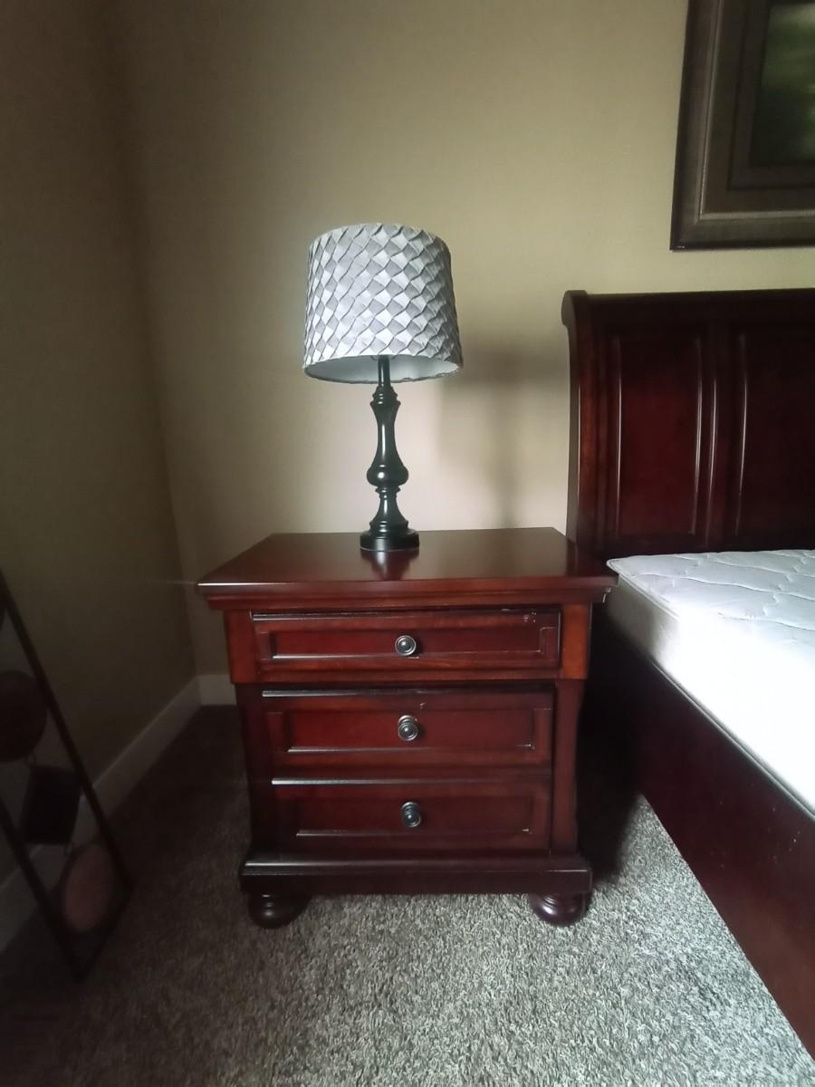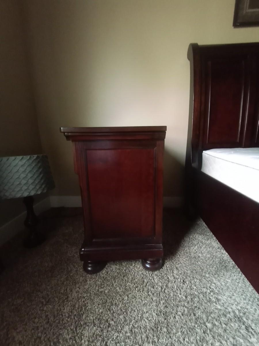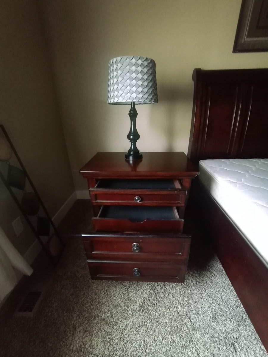 NIGHT STAND HAS A SMALLER DRAWER ON TOP AND A LARGE DRAWER THAT HAS A HIDDEN DRAWER INSIDE OF IT. THIS PIECE MATCHES LOTS 8 - 10 AND LOT 12 IT MEASURES 29X18X30 AND IS IN VERY GOOD CONDITION. THE TABLE LAMP IS APPROX. 24" TALL WITH SHADE