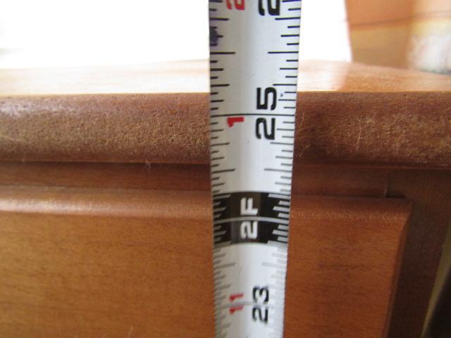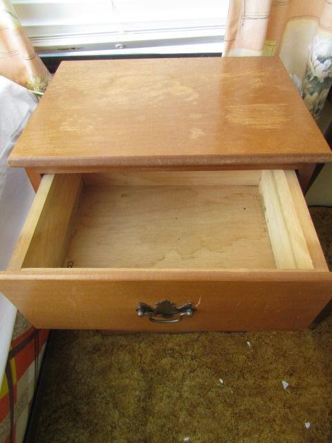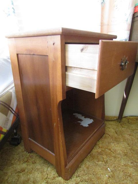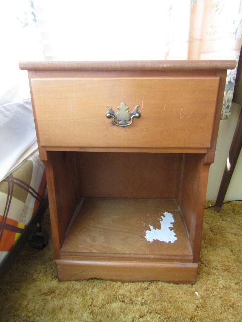 Wooden Nightstand with Drawer. Discoloration on bottom shelf is residual contact paper.