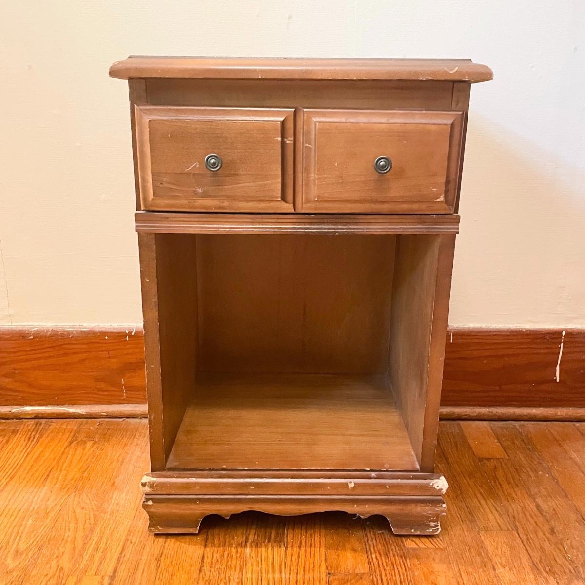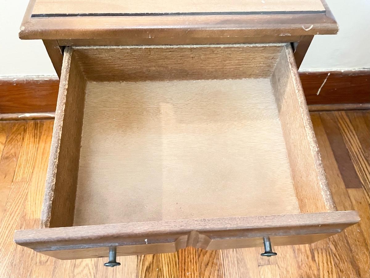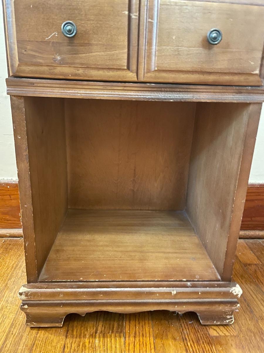 This nightstand does have some visible wear, especially around the bottom front corners. There are also some scratches on the front of the drawer. The top is in good condition. Measures approx 15.5” W x 12.5” D x 23.5” T.