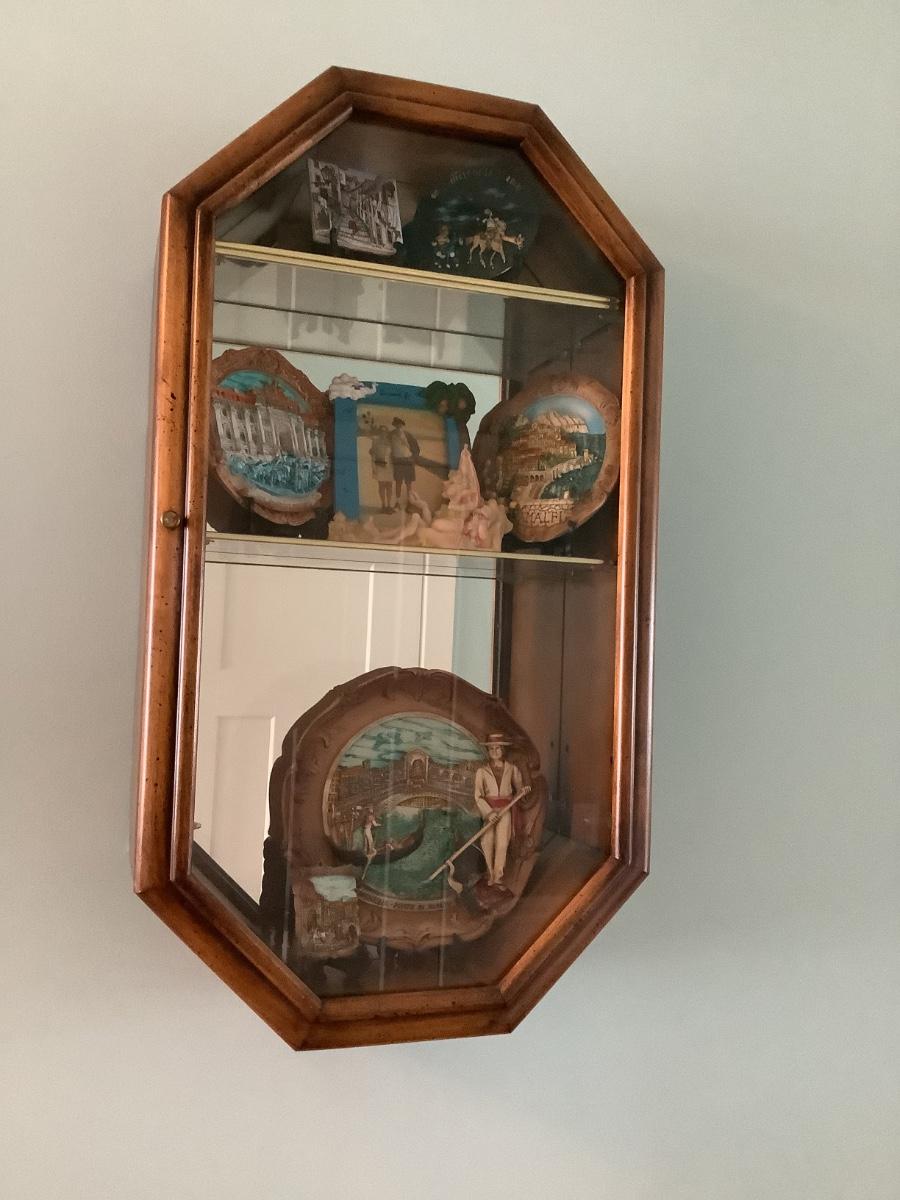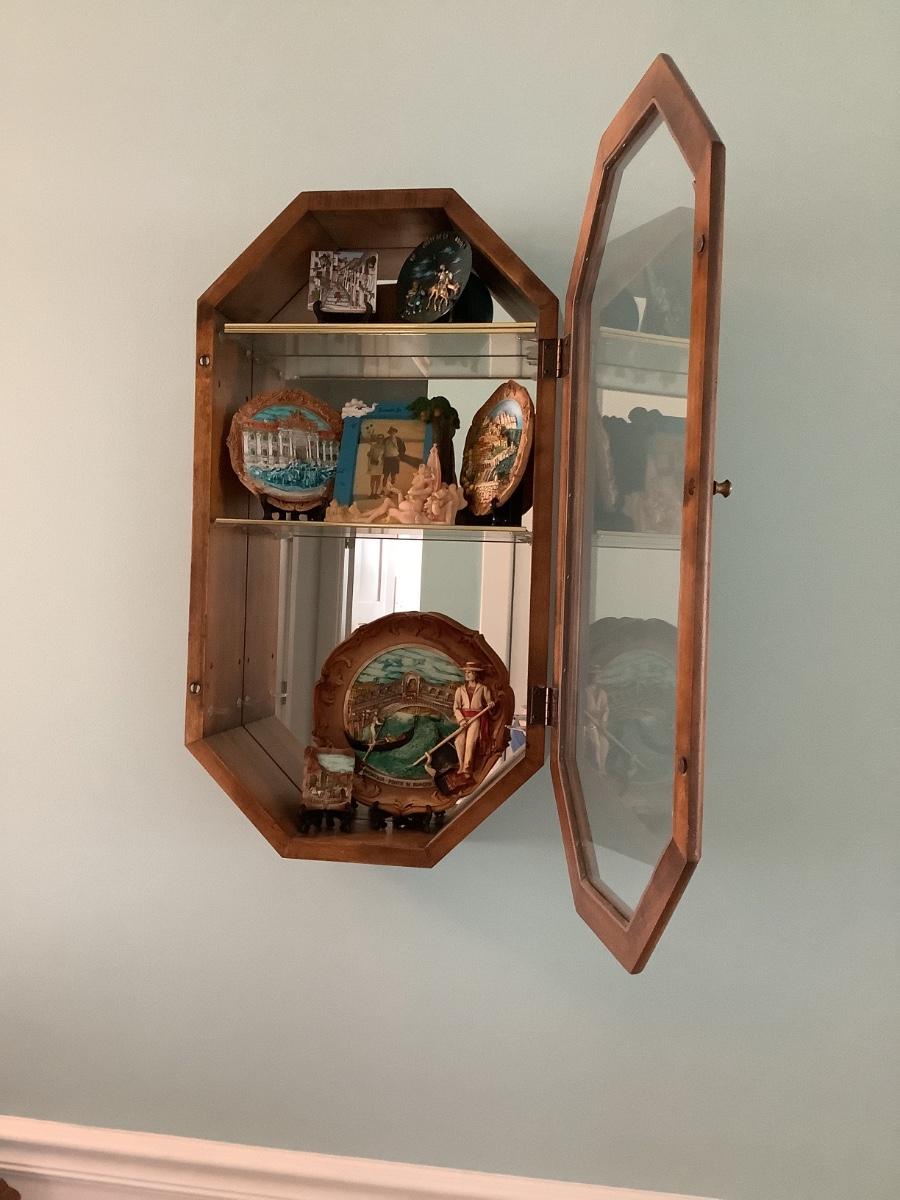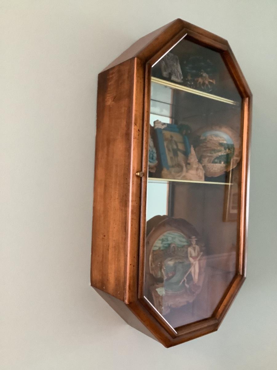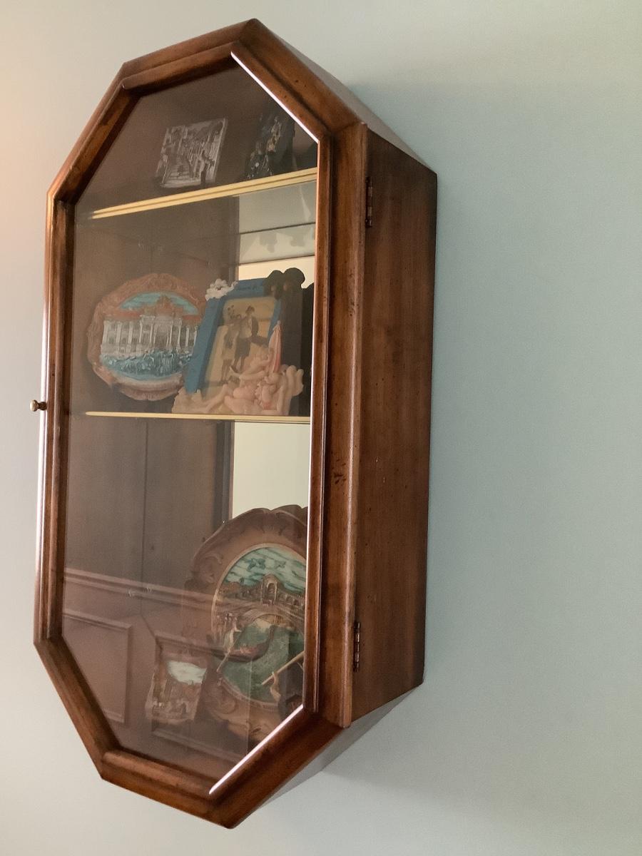 Wooden octagon hanging display case with glass front, mirrored back, 2 shelves, magnetic closure, 28”H 16”W 6”depth