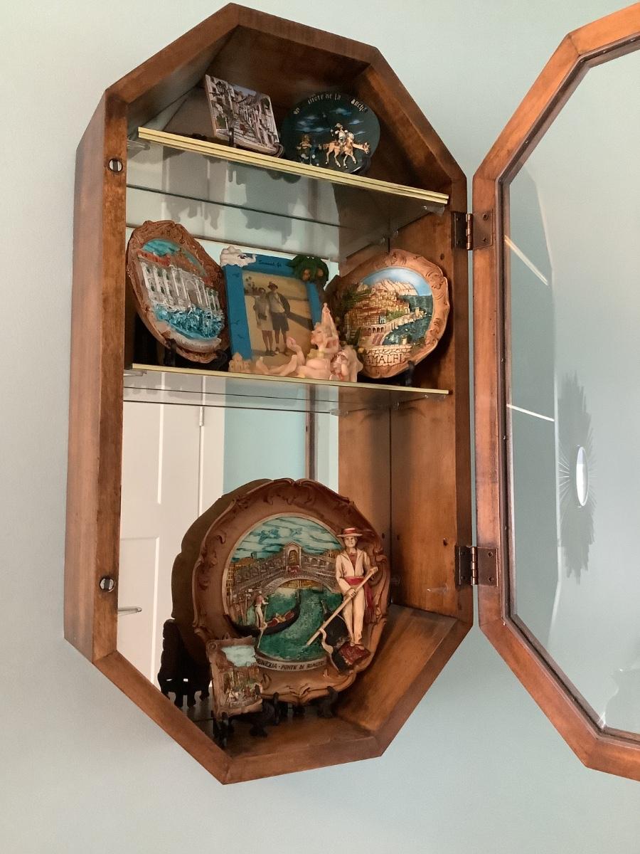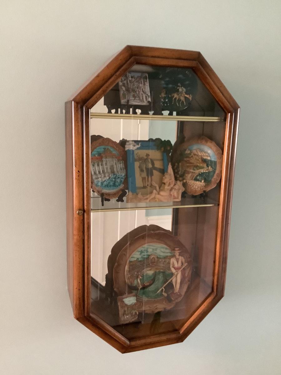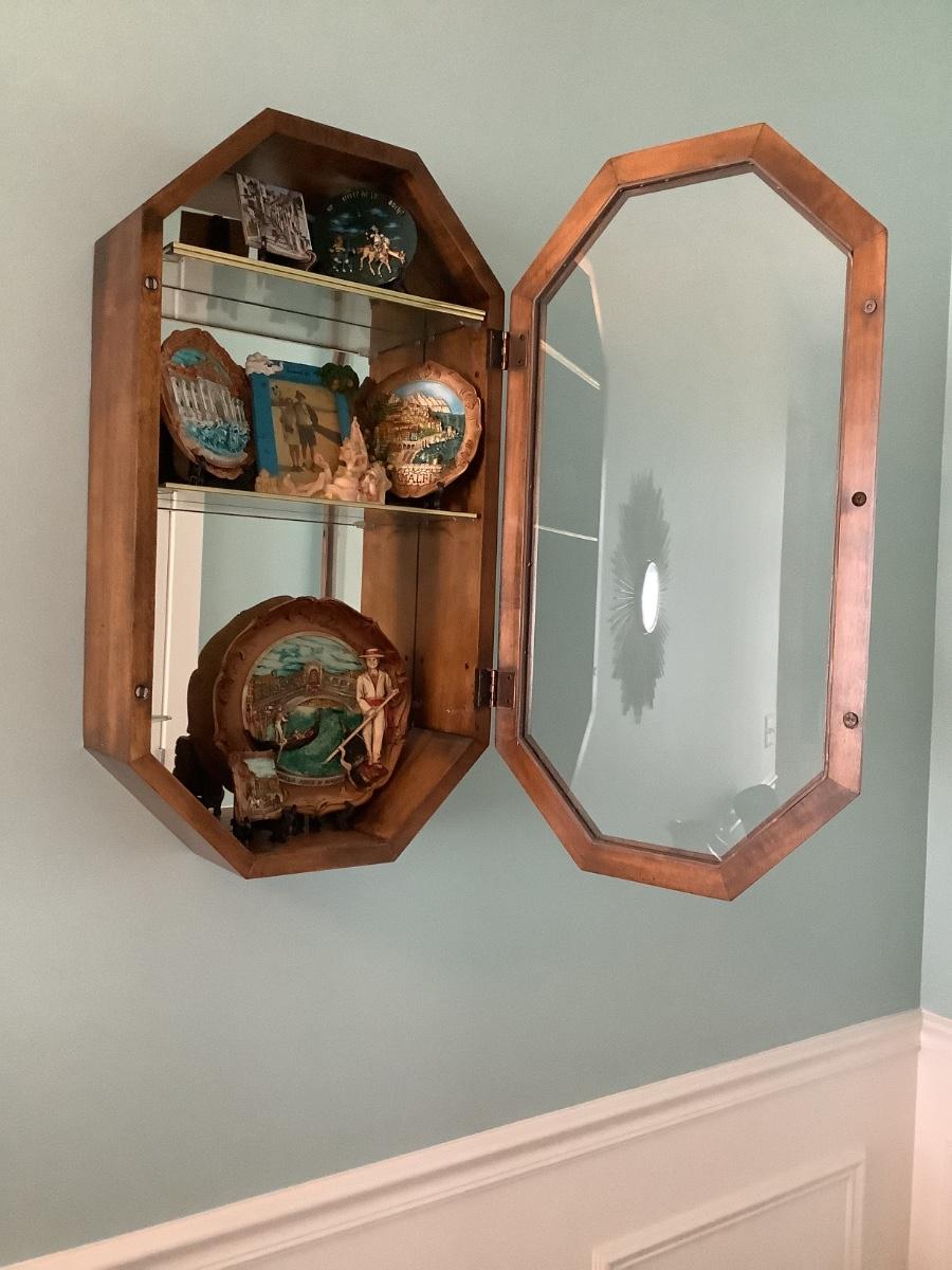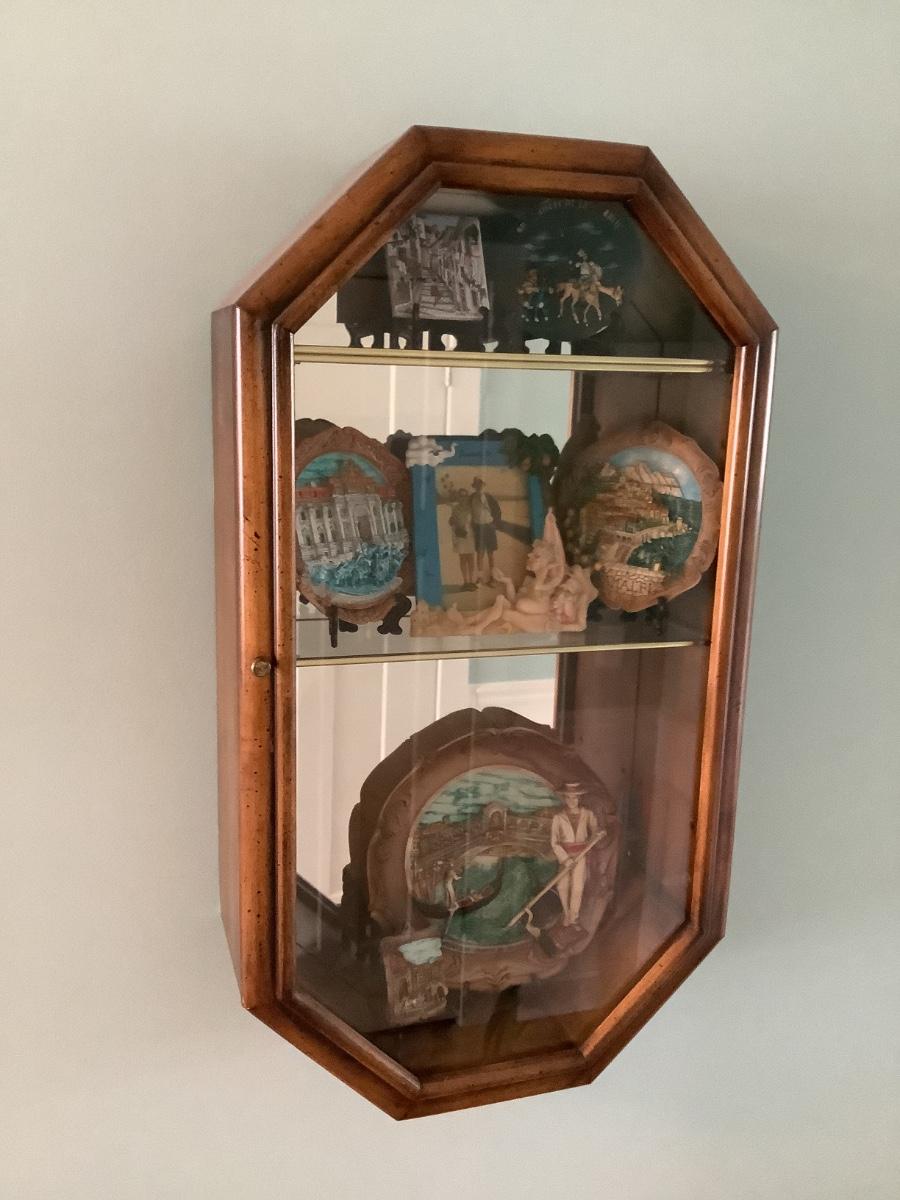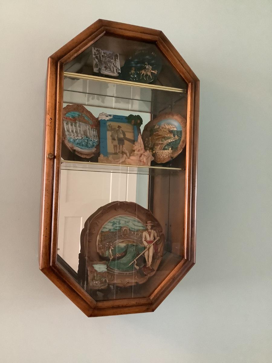 Wooden octagon hanging display case with glass front, mirrored back, 2 shelves, magnetic closure, 28”H 16”W 6”depth