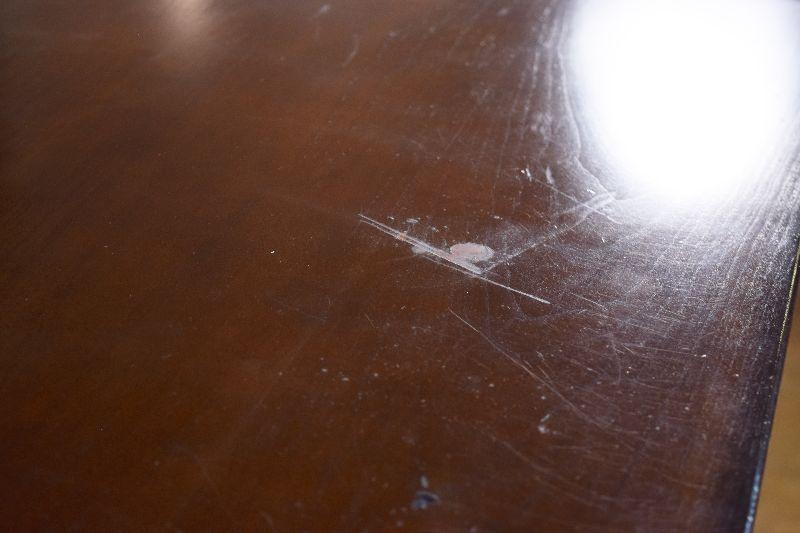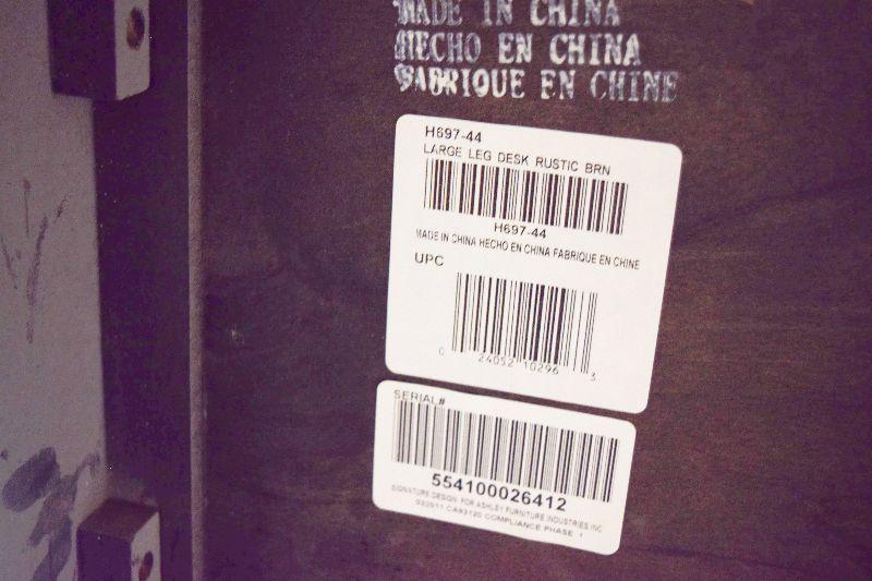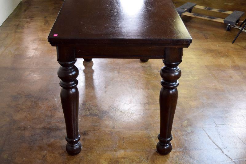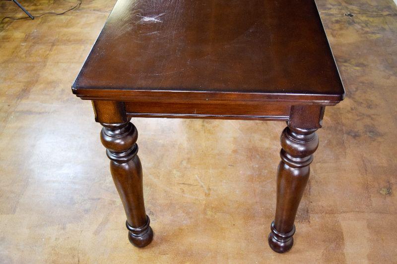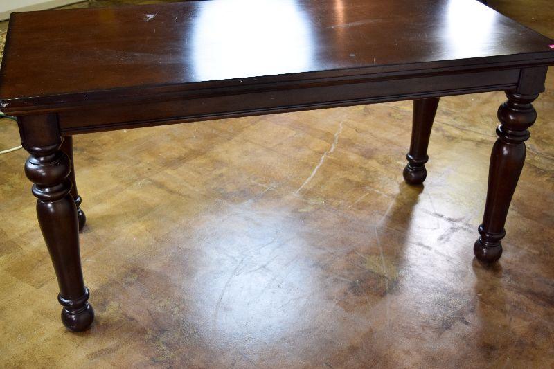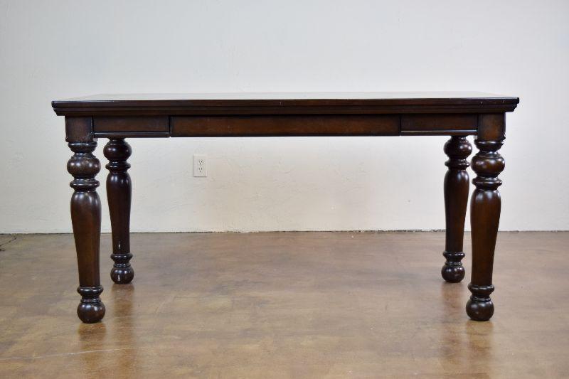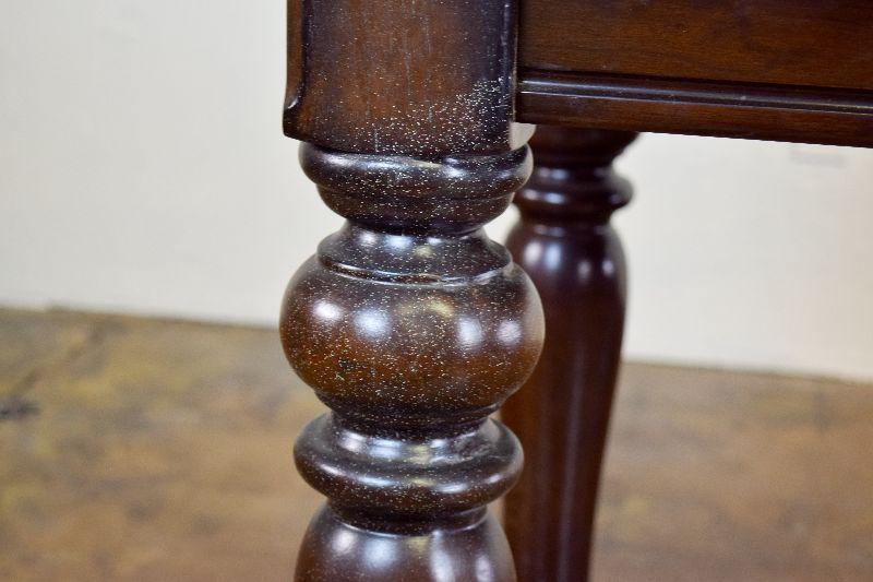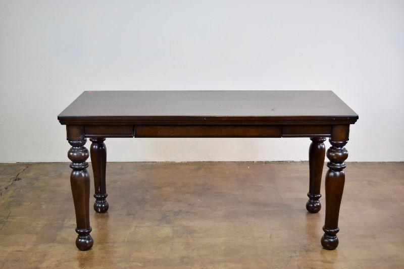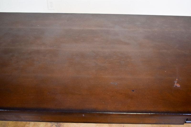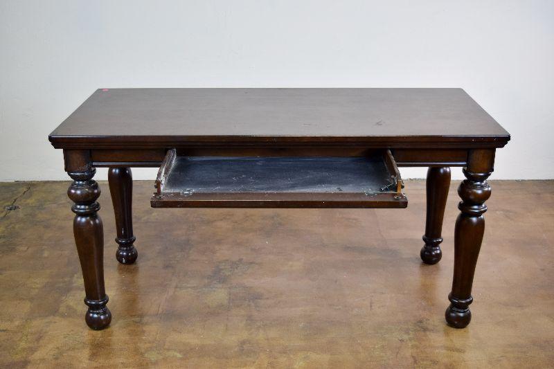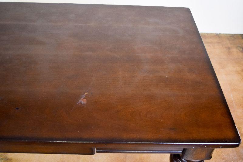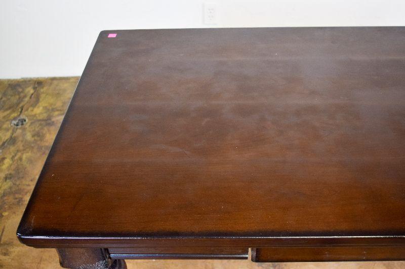 The desk is in fair overall condition, with some signs of wear from usage. There are some imperfections on the desk top, as well as general nicks and scratches on the piece. The desk measures approximately 60" long X 28" wide X 30" tall.