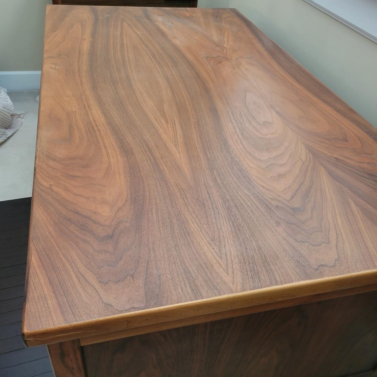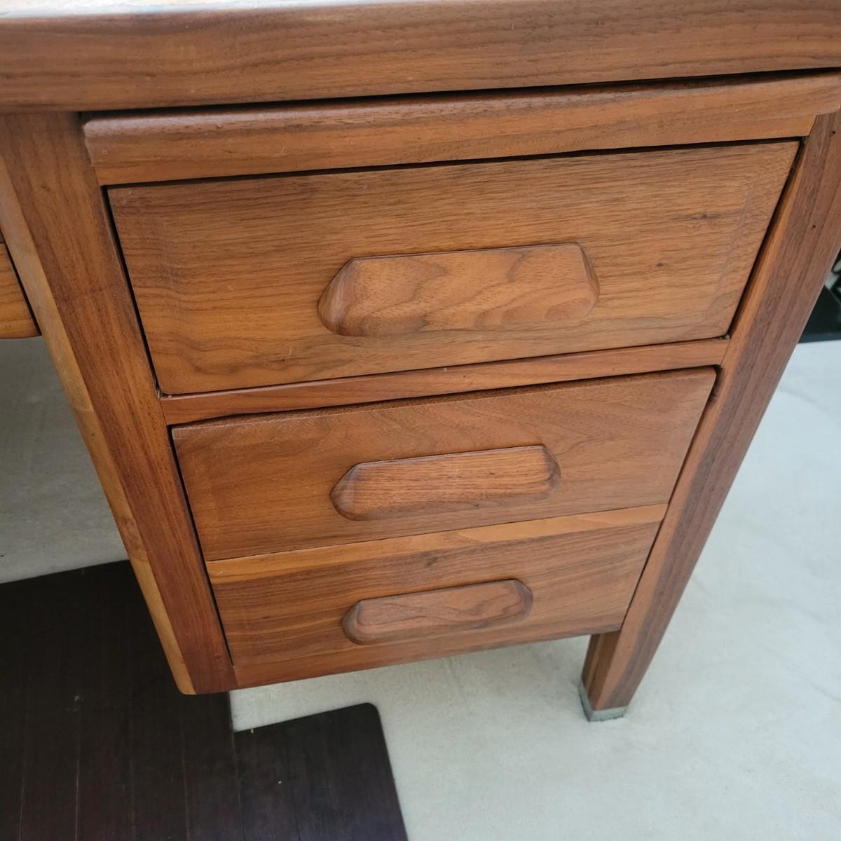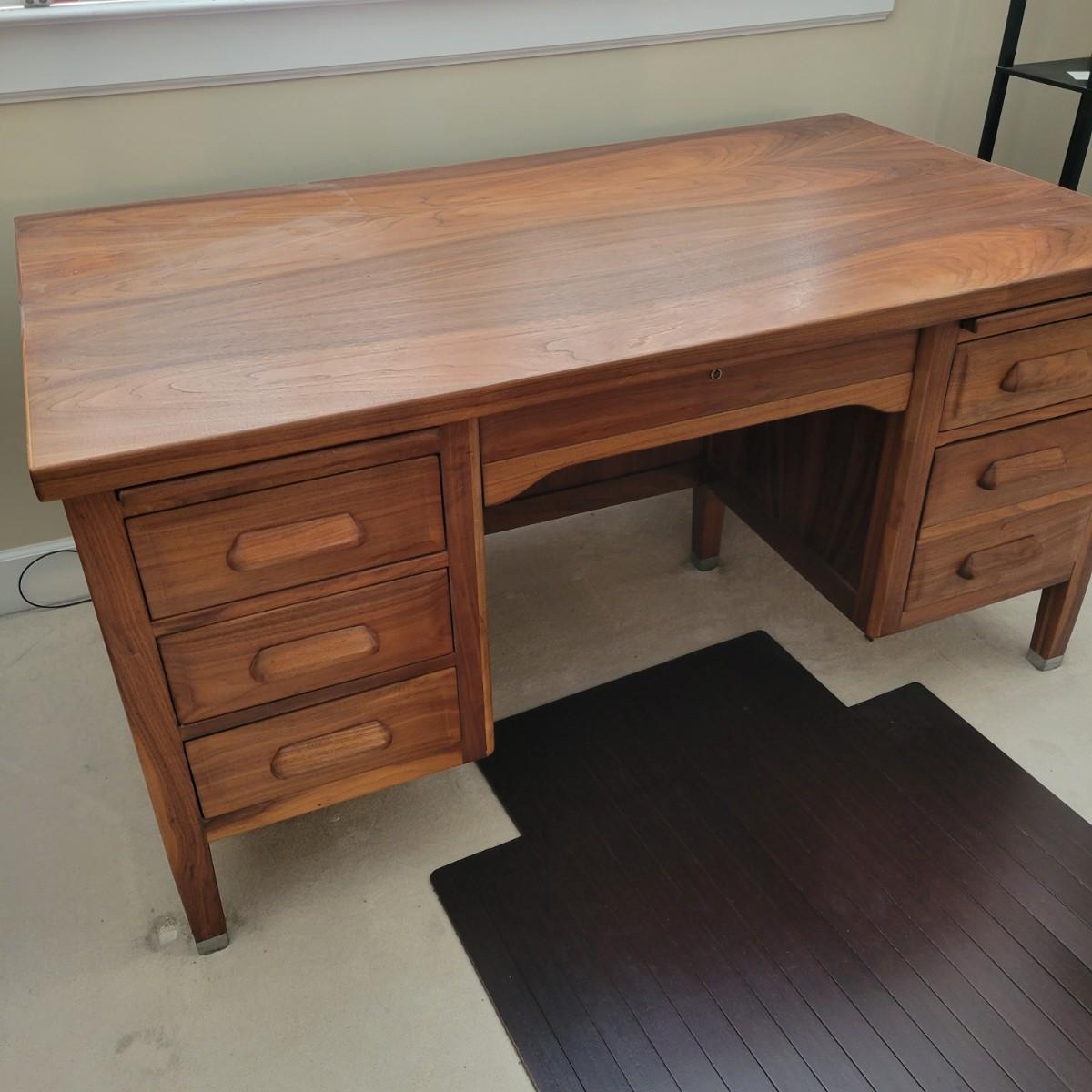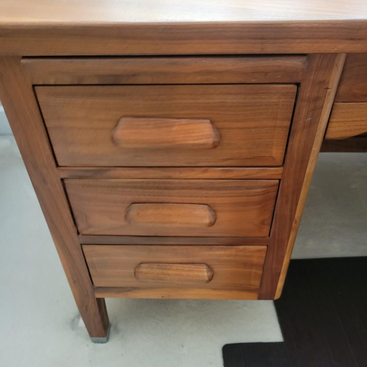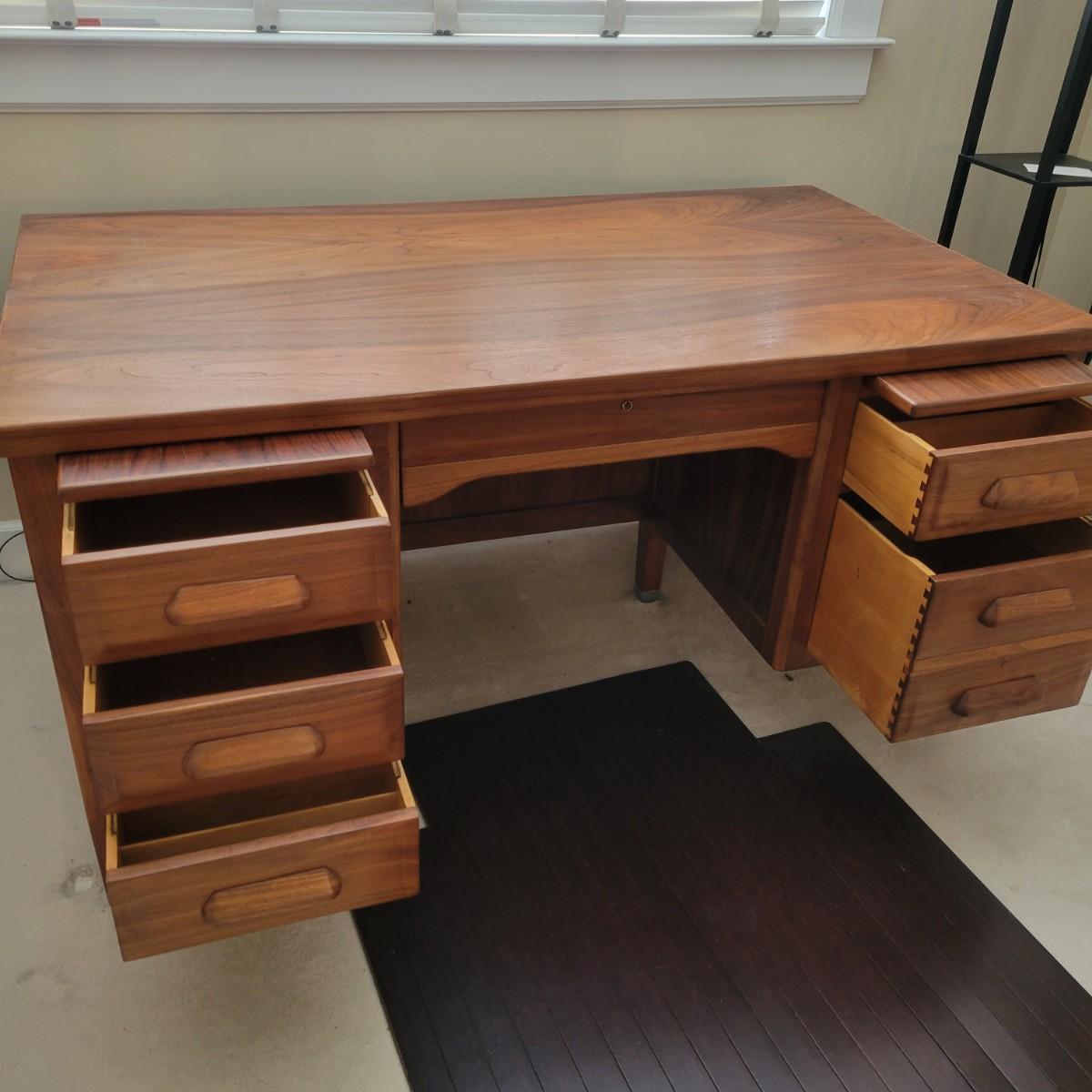 A wooden office desk in good condition with some minor scratches on its surface. This desk is solid wood with a light brown stain. It has six drawers that are dovetailed and two pullouts for additional surface area. It has six legs for support and is finished on its back so that it could be utilized mid room. Measures approximately 60" x 34" x 30". Local pickup only Winning bidder must bring assistance to help move and load this item due to its weight and/or size. This item will also need to go down a flight of stairs.