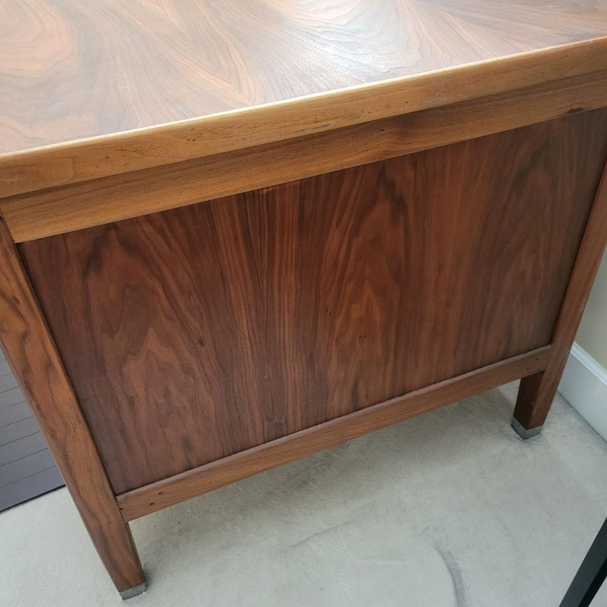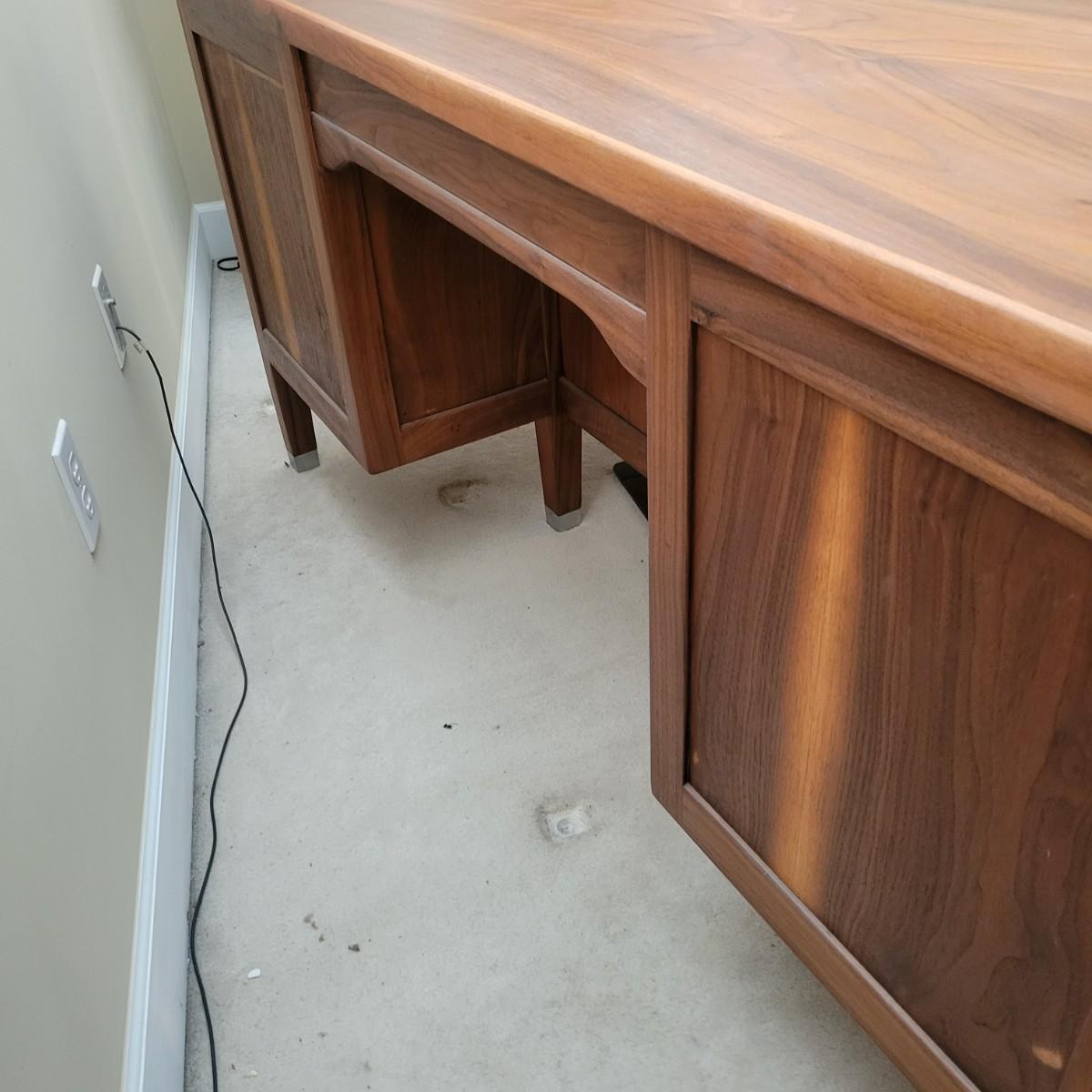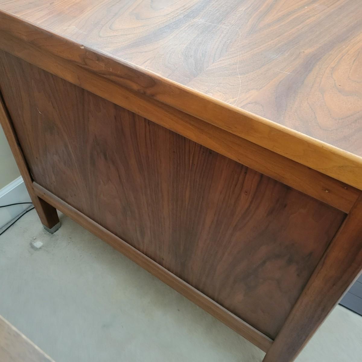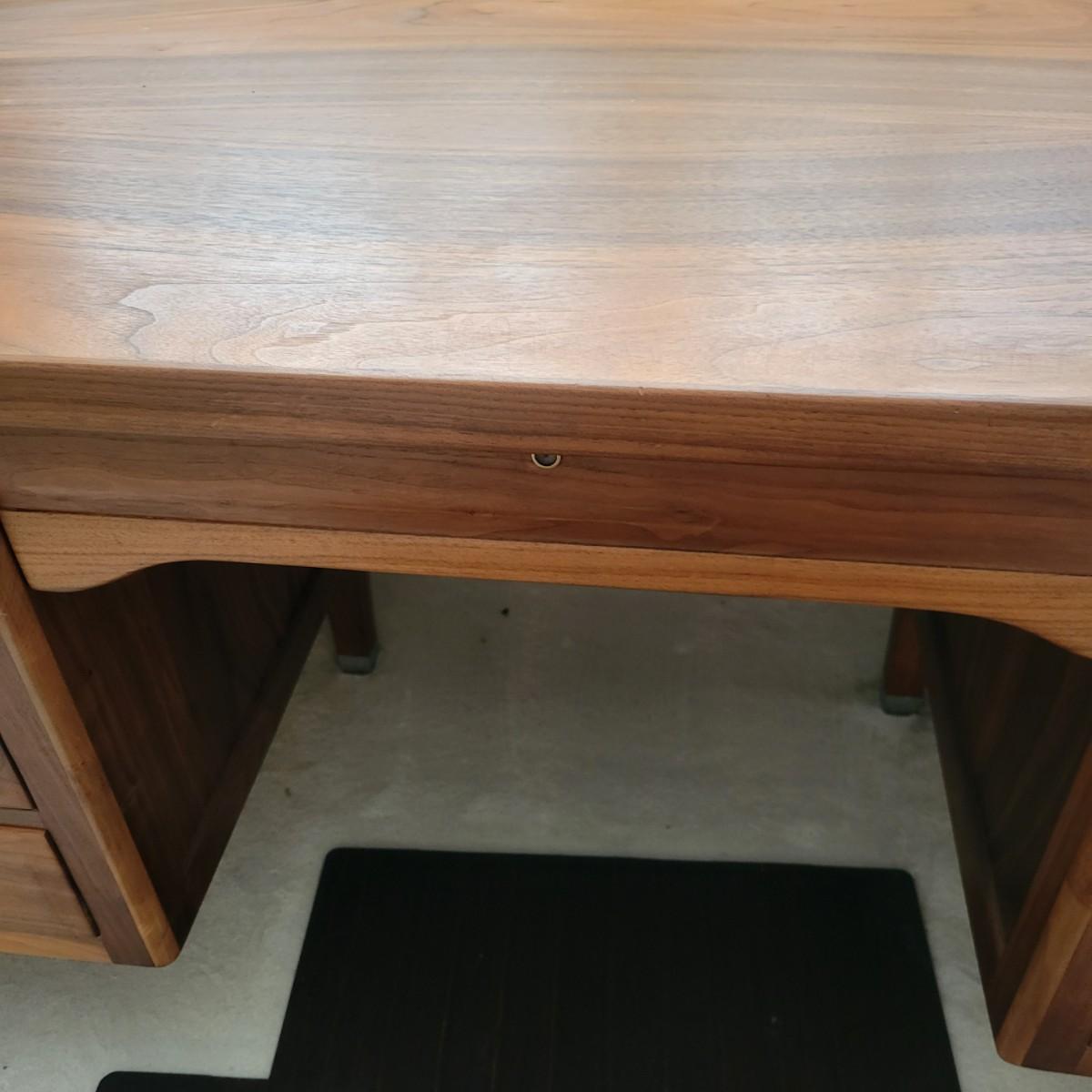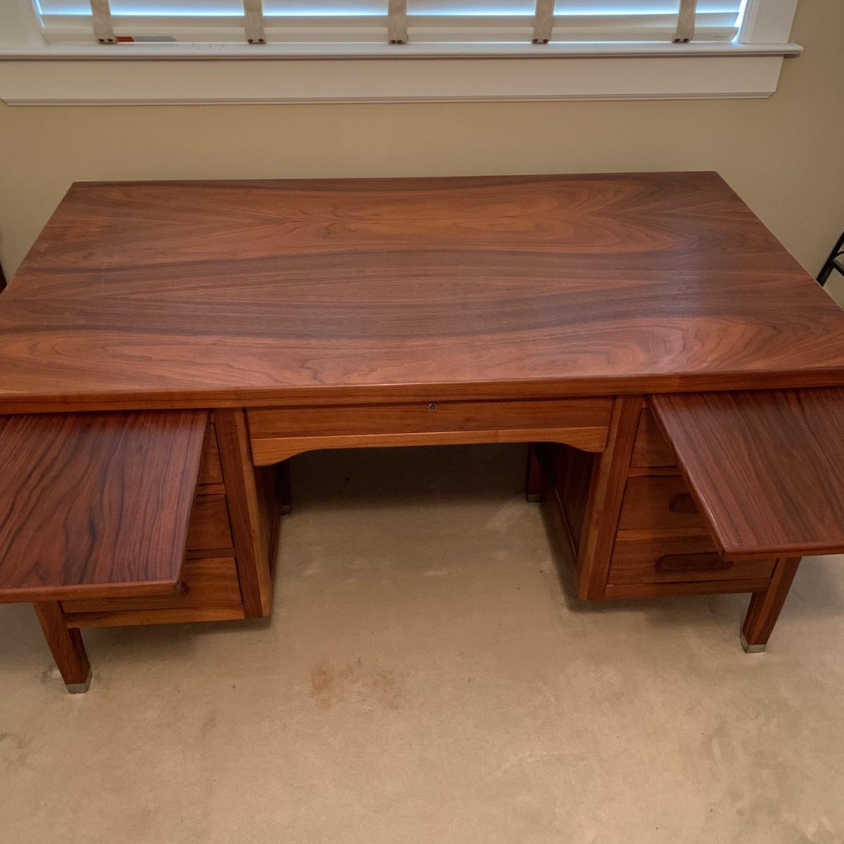 A wooden office desk in good condition with some minor scratches on its surface. This desk is solid wood with a light brown stain. It has six drawers that are dovetailed and two pullouts for additional surface area. It has six legs for support and is finished on its back so that it could be utilized mid room. Measures approximately 60" x 34" x 30". Local pickup only Winning bidder must bring assistance to help move and load this item due to its weight and/or size. This item will also need to go down a flight of stairs.